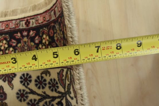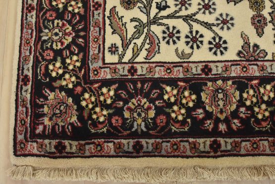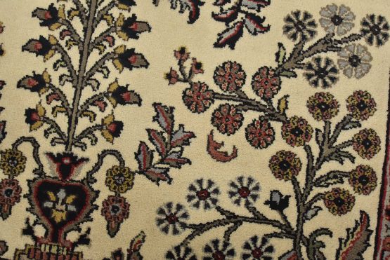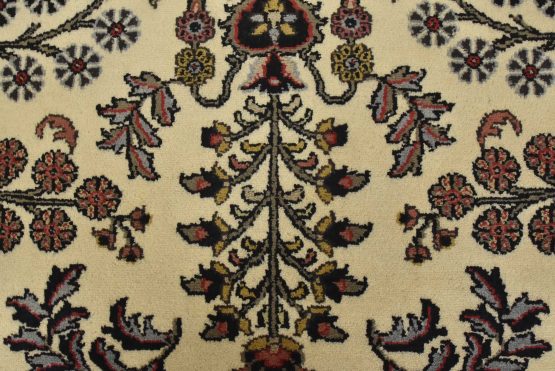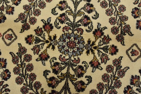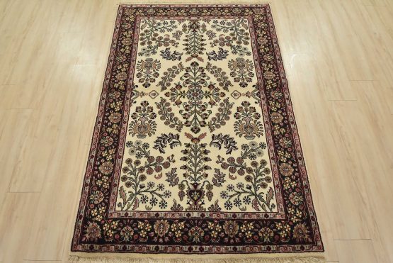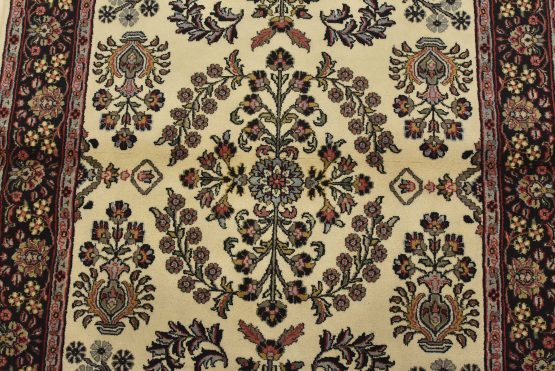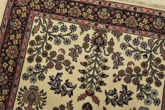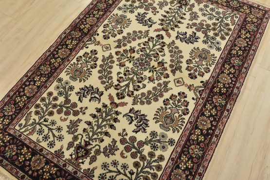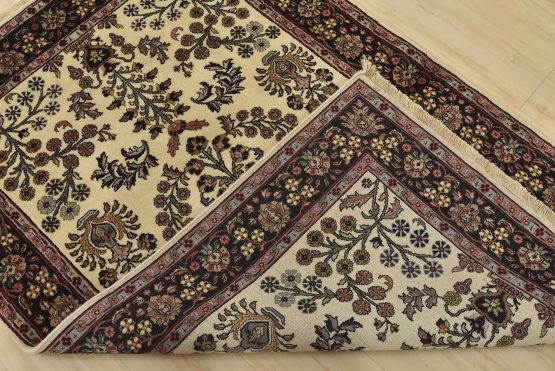 A traditional Sarouk rug hand-knotted with an all-wool pile on a cotton foundation. This finely woven oriental rug features an all-over floral pattern set against an ivory background. It is new and in excellent condition.