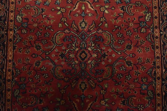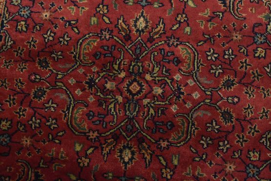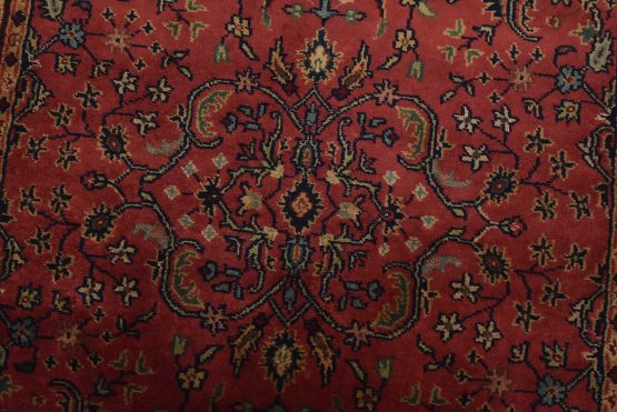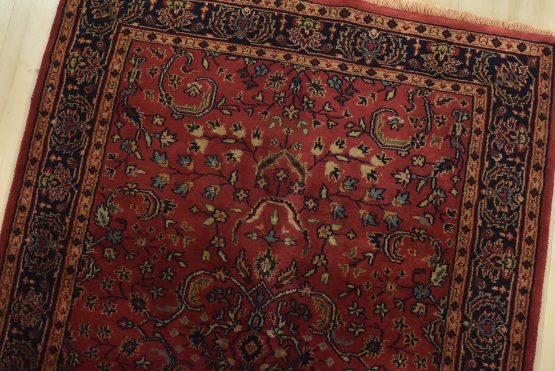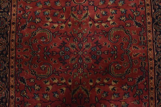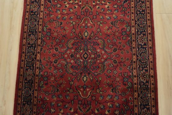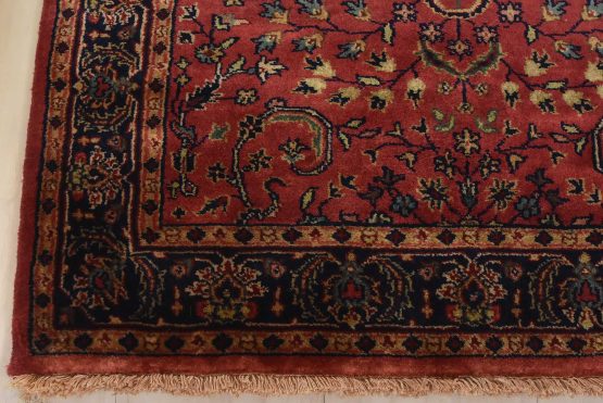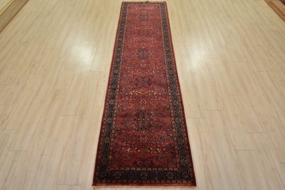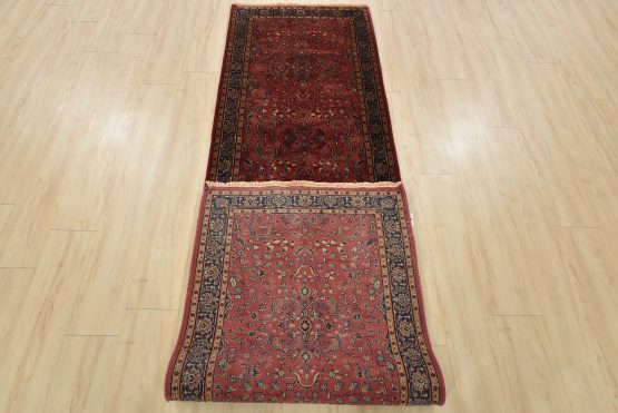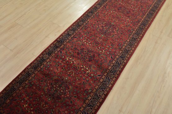A traditional Sarouk runner hand-knotted with an all-wool pile on a cotton foundation. This finely woven oriental rug features an all-over floral design set against a pink background. It is new and in excellent condition.