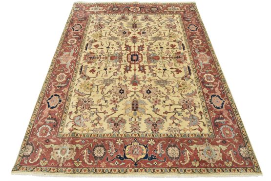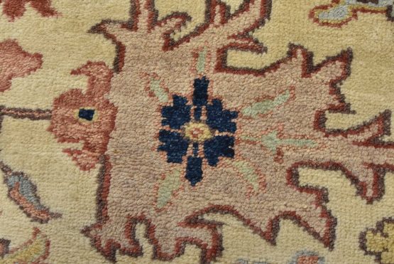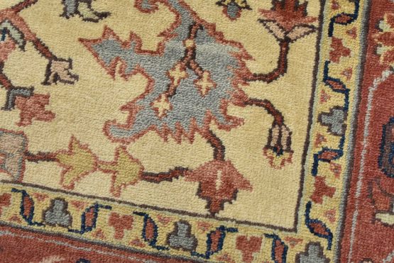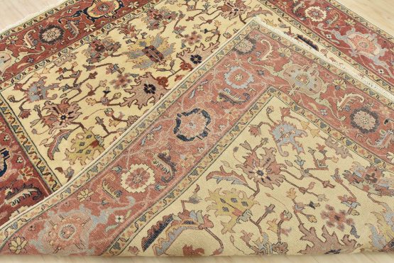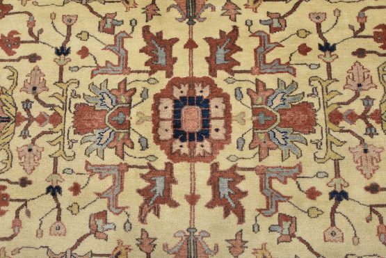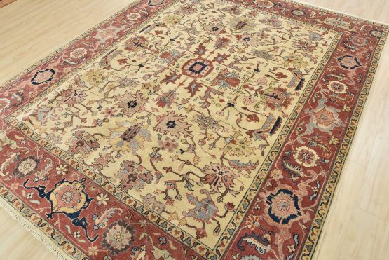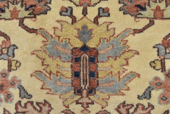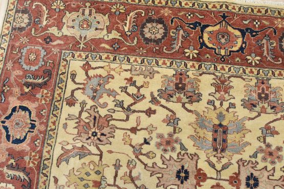 A traditional Heriz rug hand-knotted with an all-wool pile on a cotton foundation. This finely woven oriental rug features an all-over botanical design set against an ivory background. It is new and in excellent condition.
