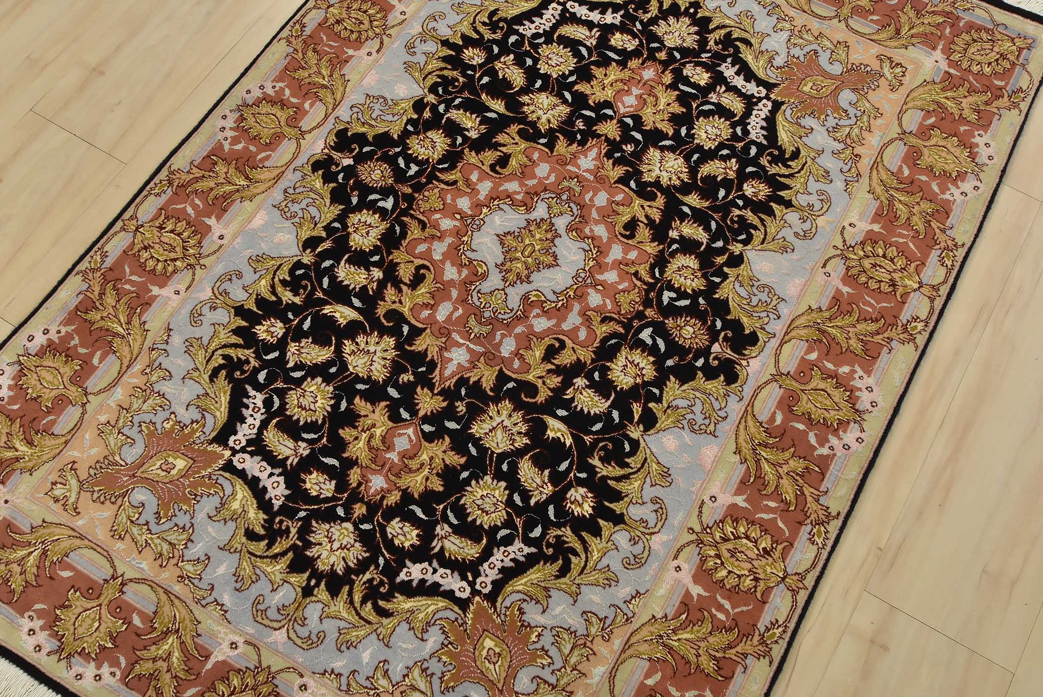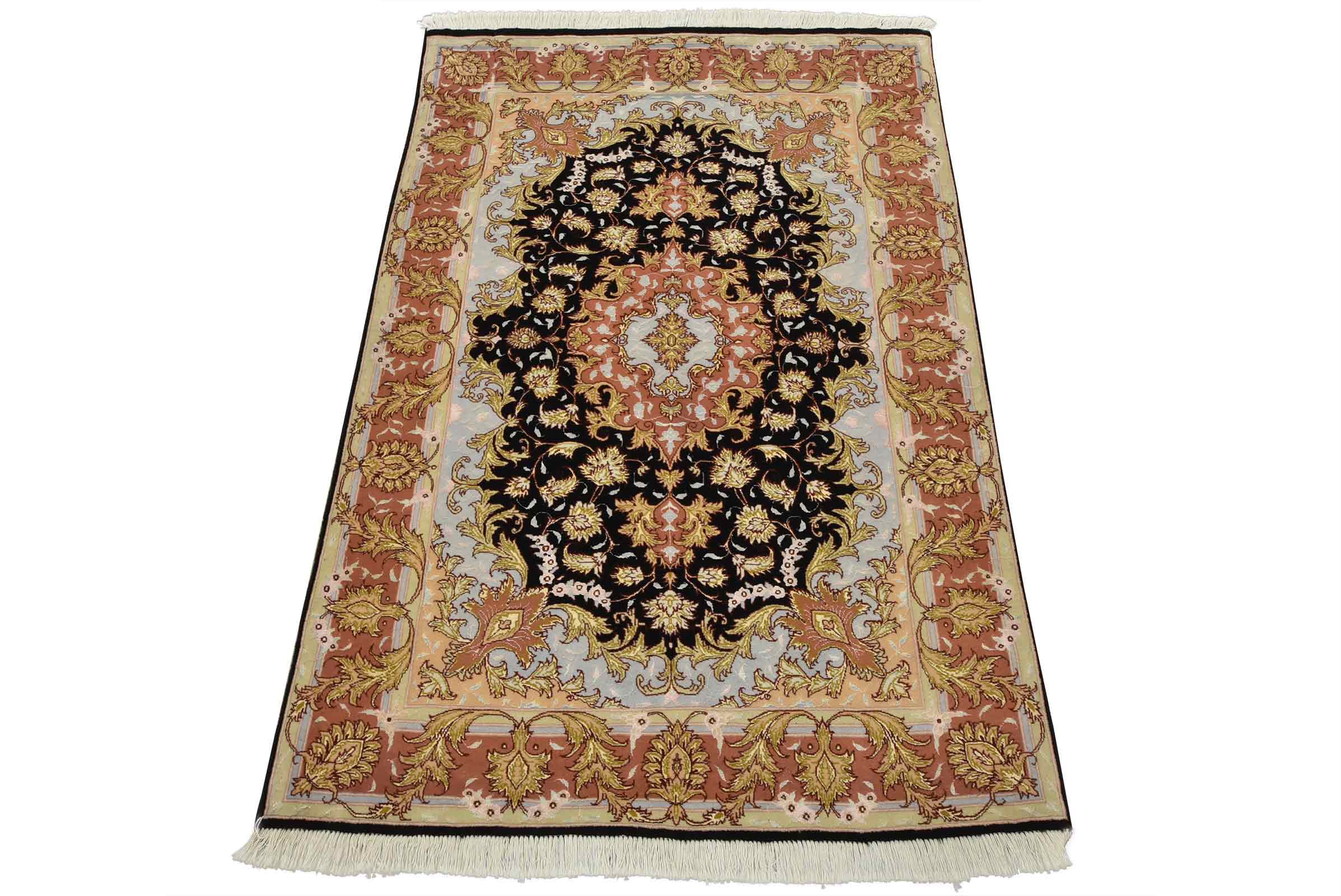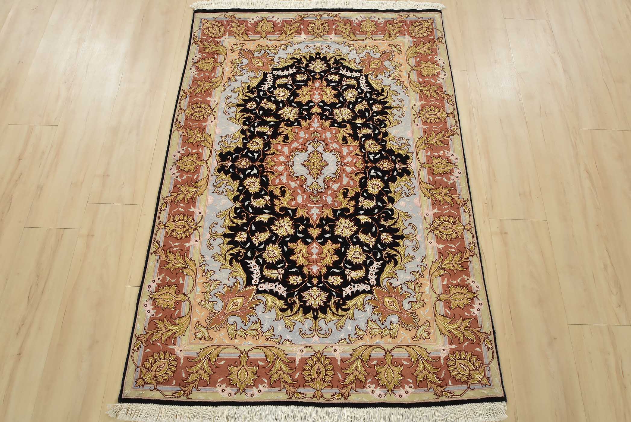 An authentic vintage traditional Tabriz rug hand-knotted with fine wool and silk highlights, using natural dyes. This intricately woven oriental rug features a central medallion surrounded by a botanical design set against a red background. It has a full wool pile with no worn areas and is in very good condition.