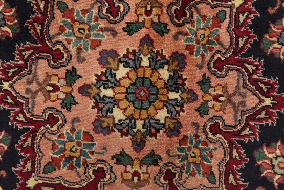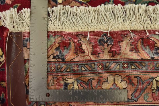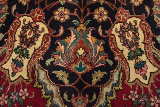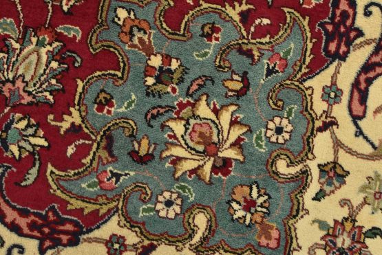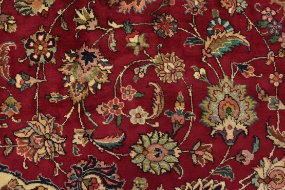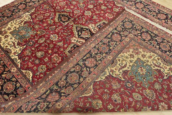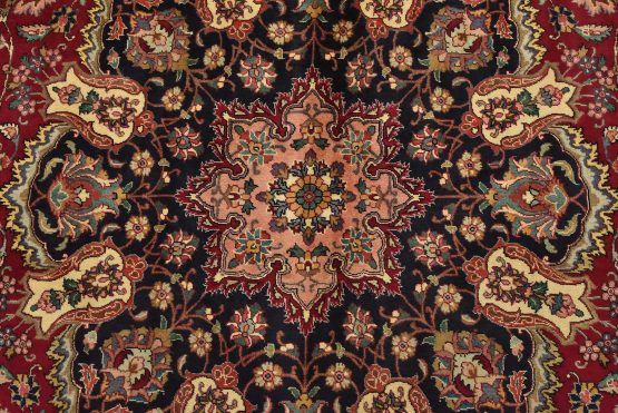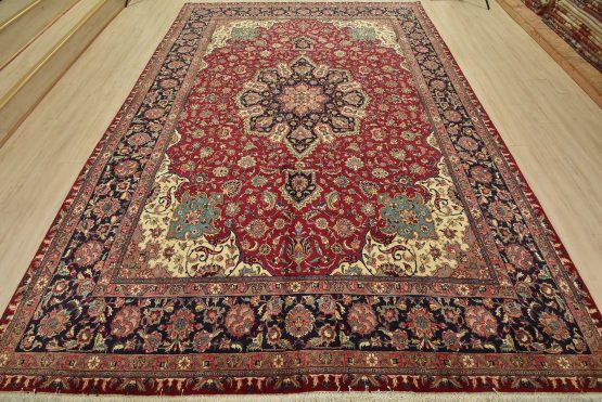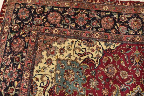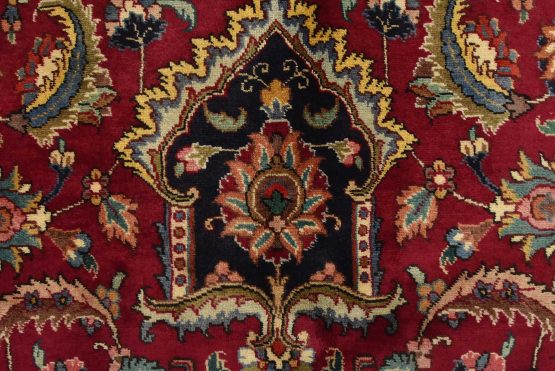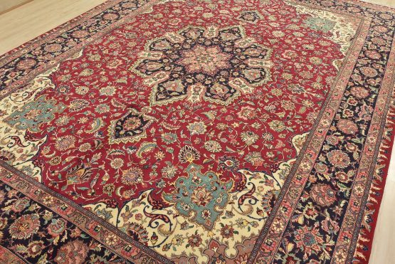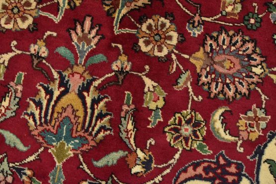 An authentic vintage traditional Tabriz rug hand-knotted with fine wool and natural dyes. This finely woven oriental rug features a central medallion surrounded by an intricate all-over floral design set against a red background. It has a full wool pile with no worn areas and is in very good condition.