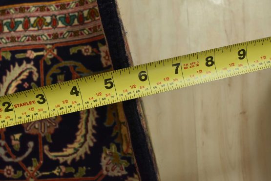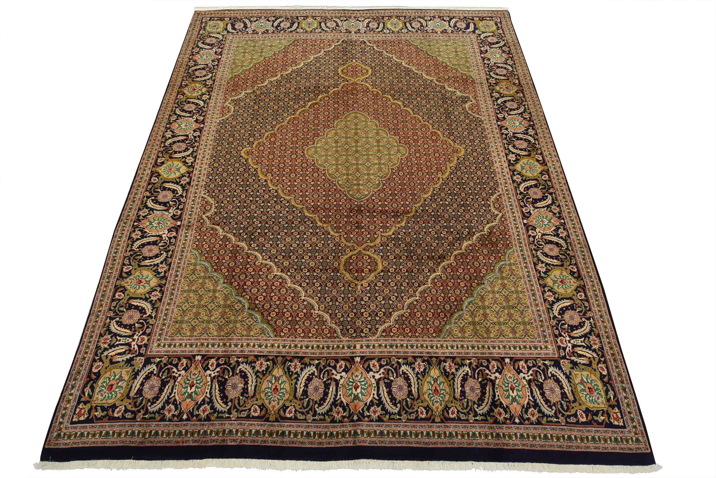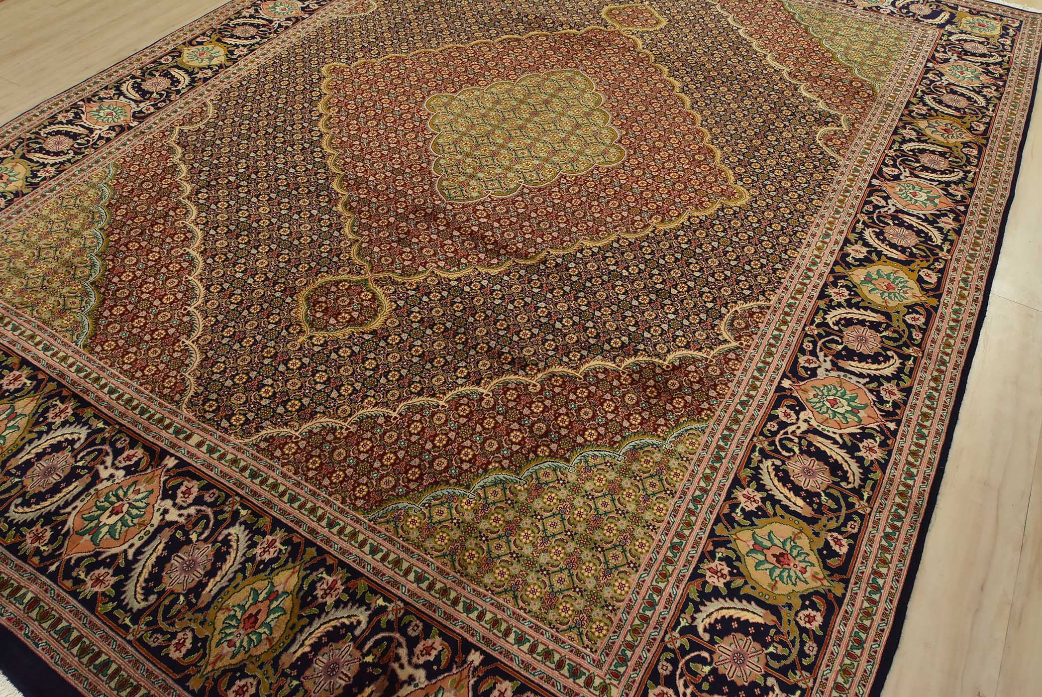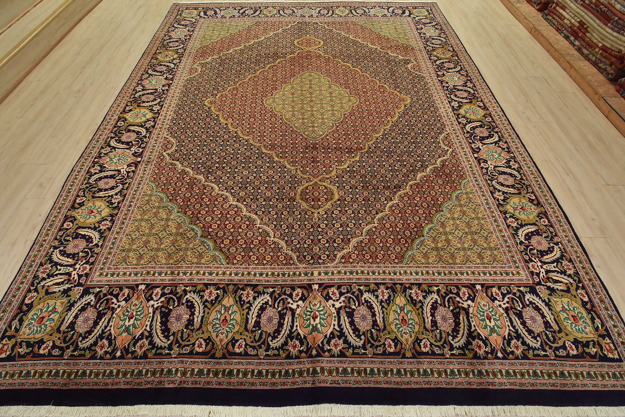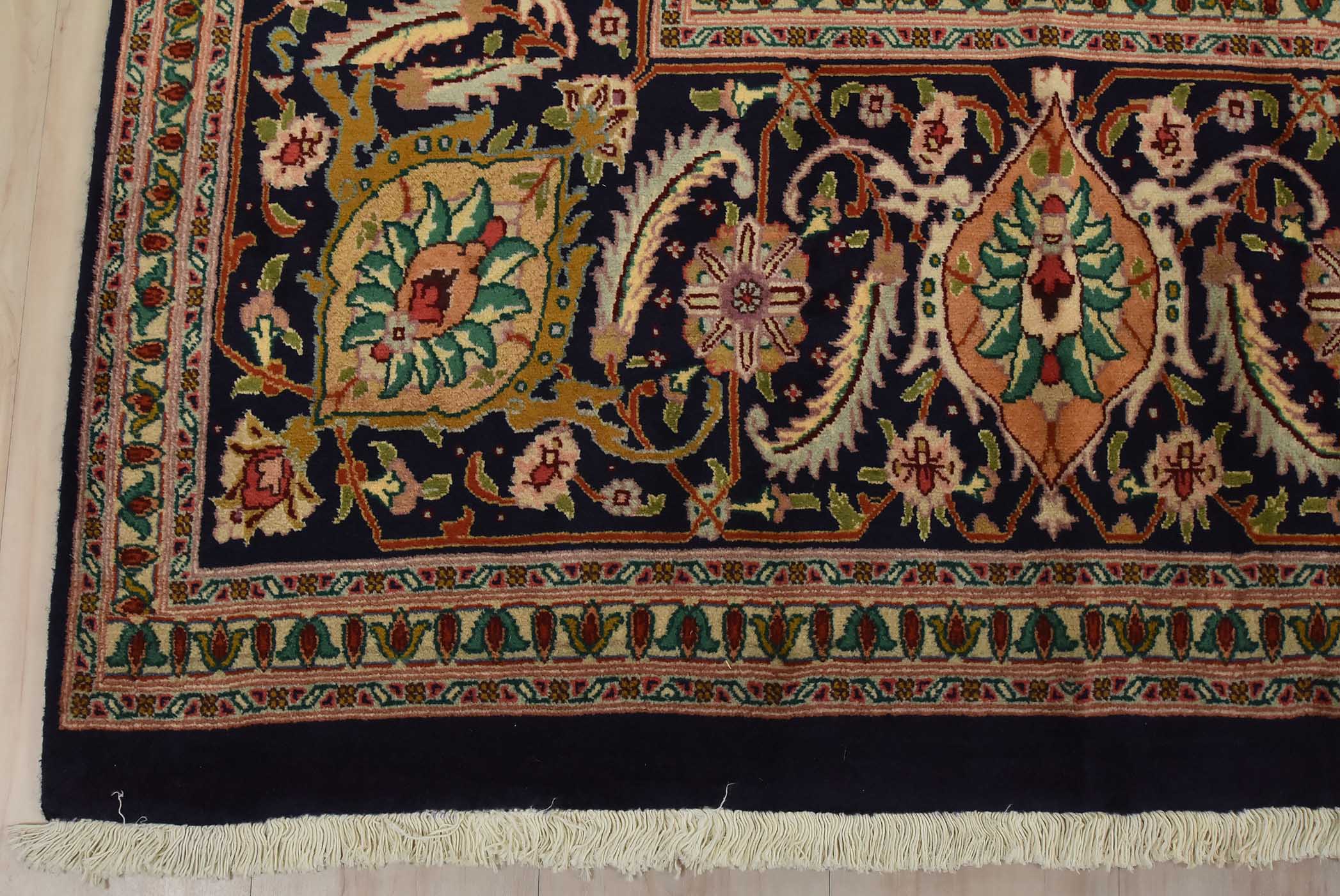 An authentic vintage traditional Tabriz rug hand-knotted with fine wool and natural dyes. This intricately woven rug features a central medallion surrounded by a Herati pattern set against a dark blue background. It has a full wool pile with no worn areas and is in very good condition.