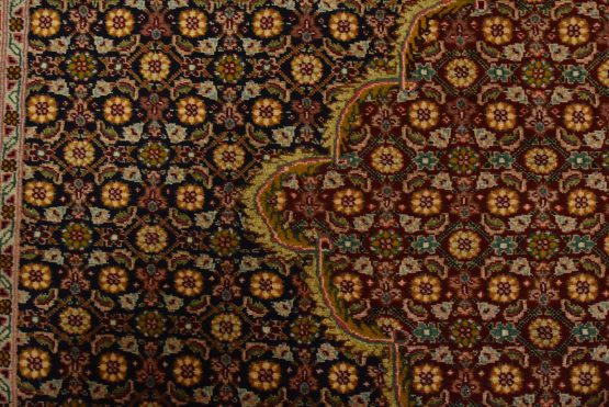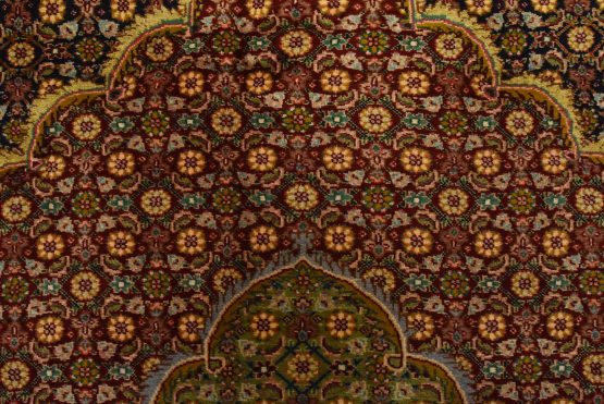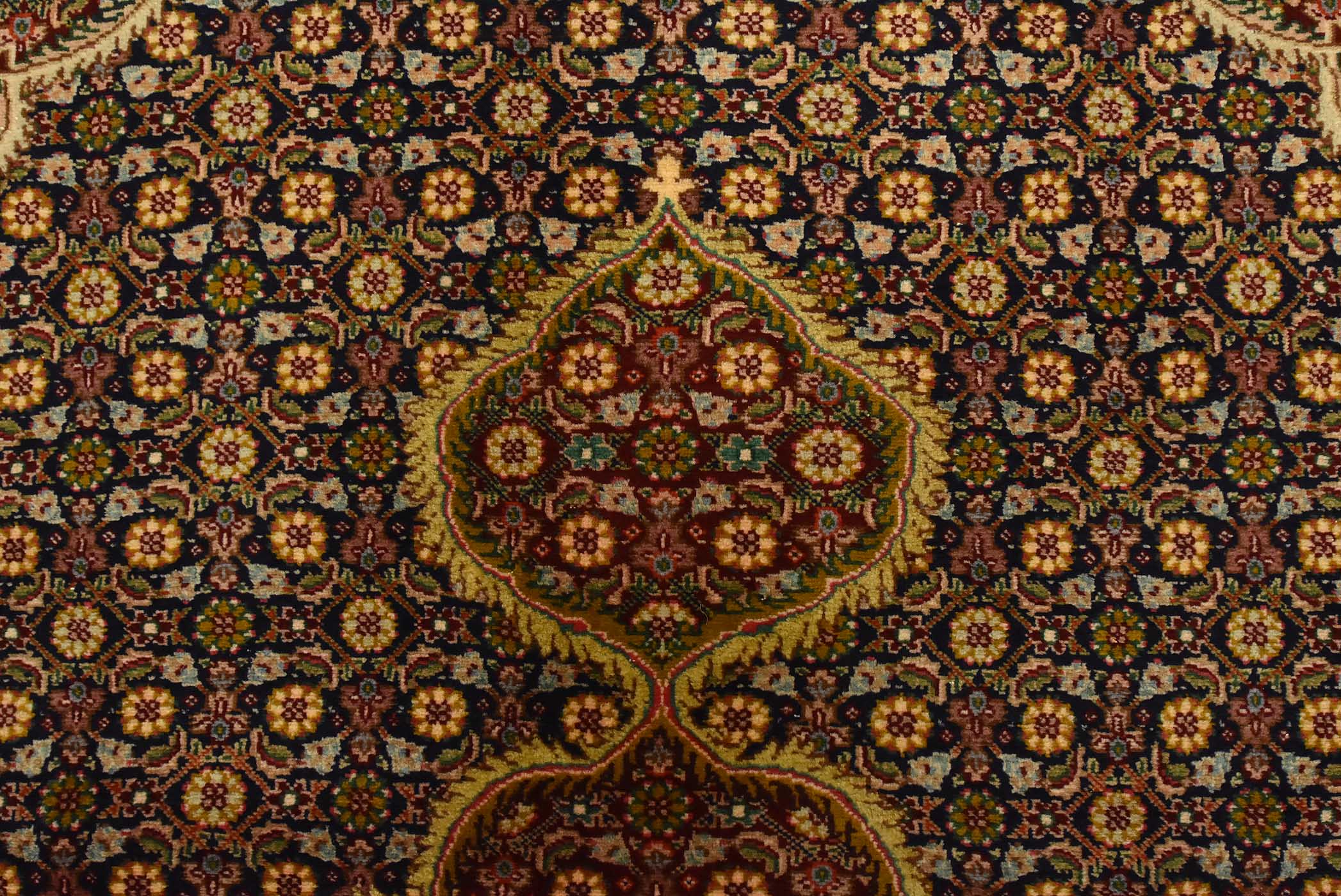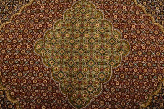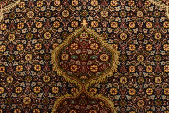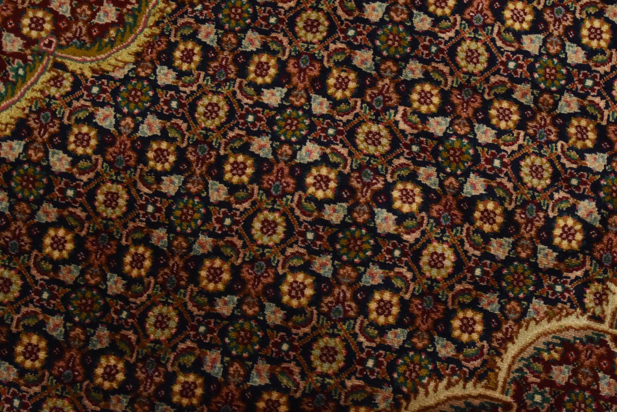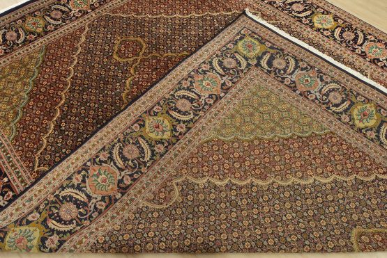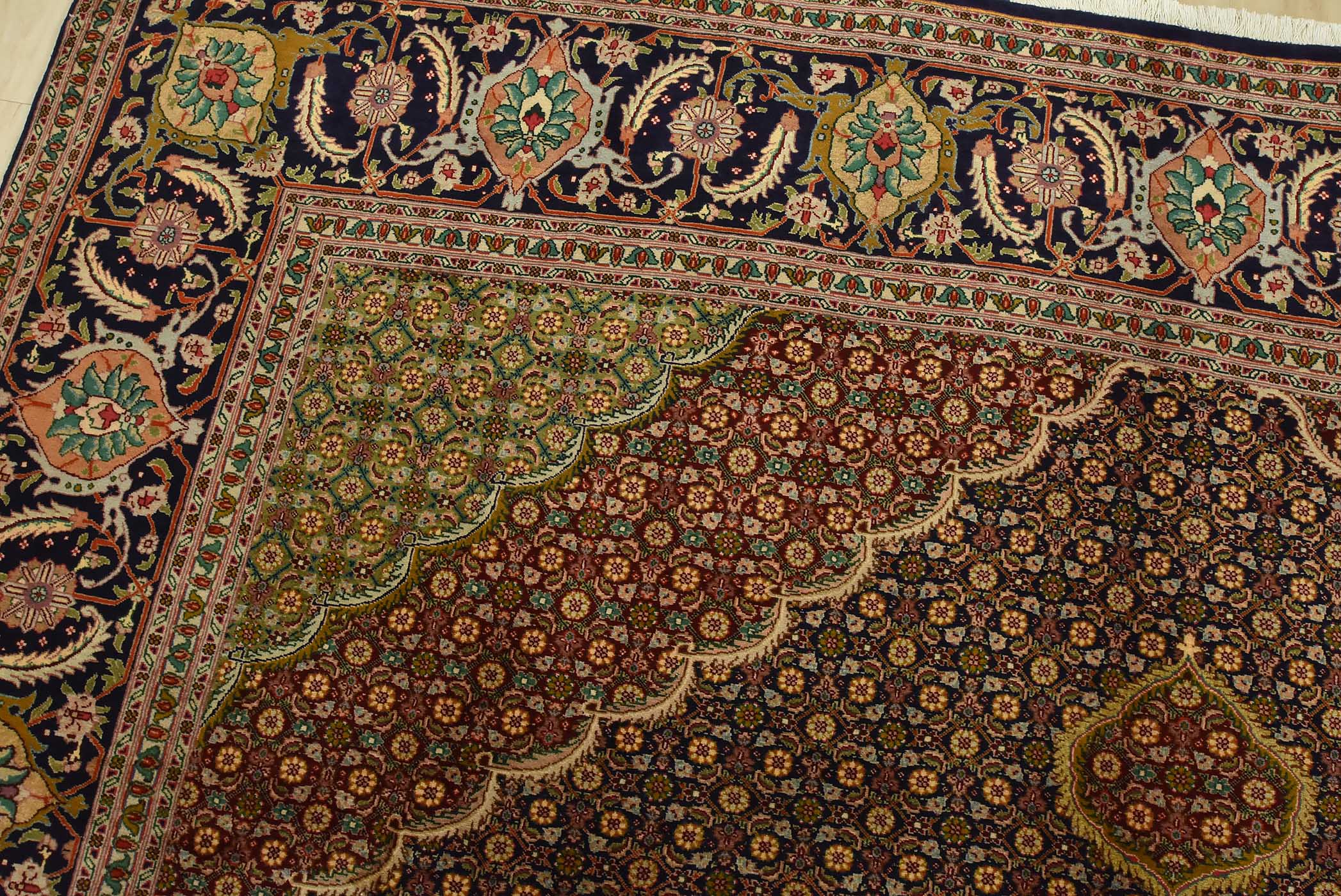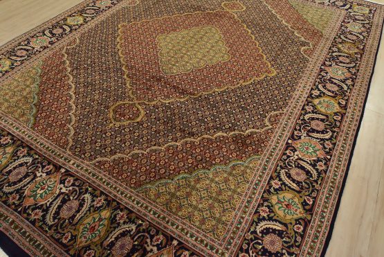 An authentic vintage traditional Tabriz rug hand-knotted with fine wool and natural dyes. This intricately woven rug features a central medallion surrounded by a Herati pattern set against a dark blue background. It has a full wool pile with no worn areas and is in very good condition.