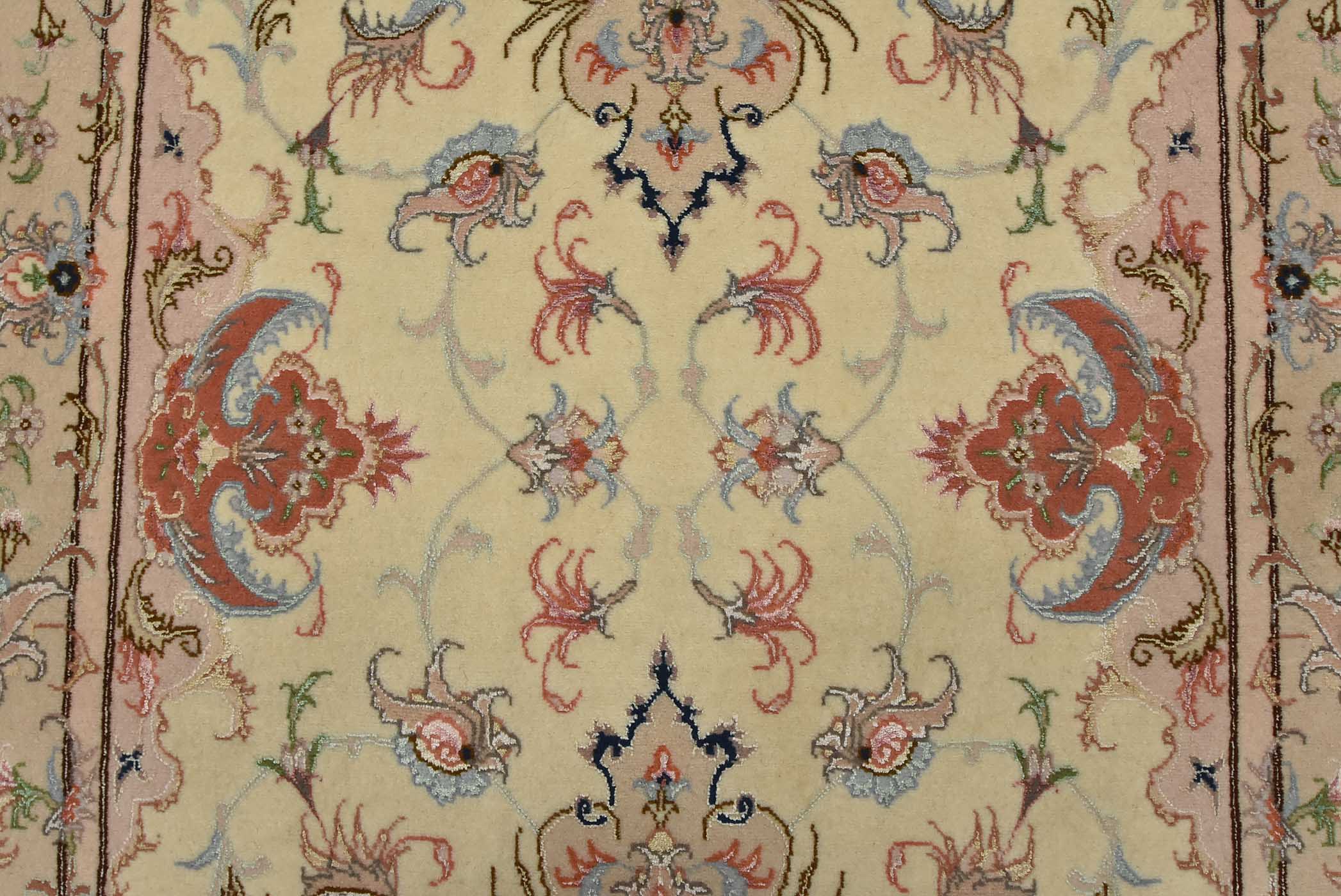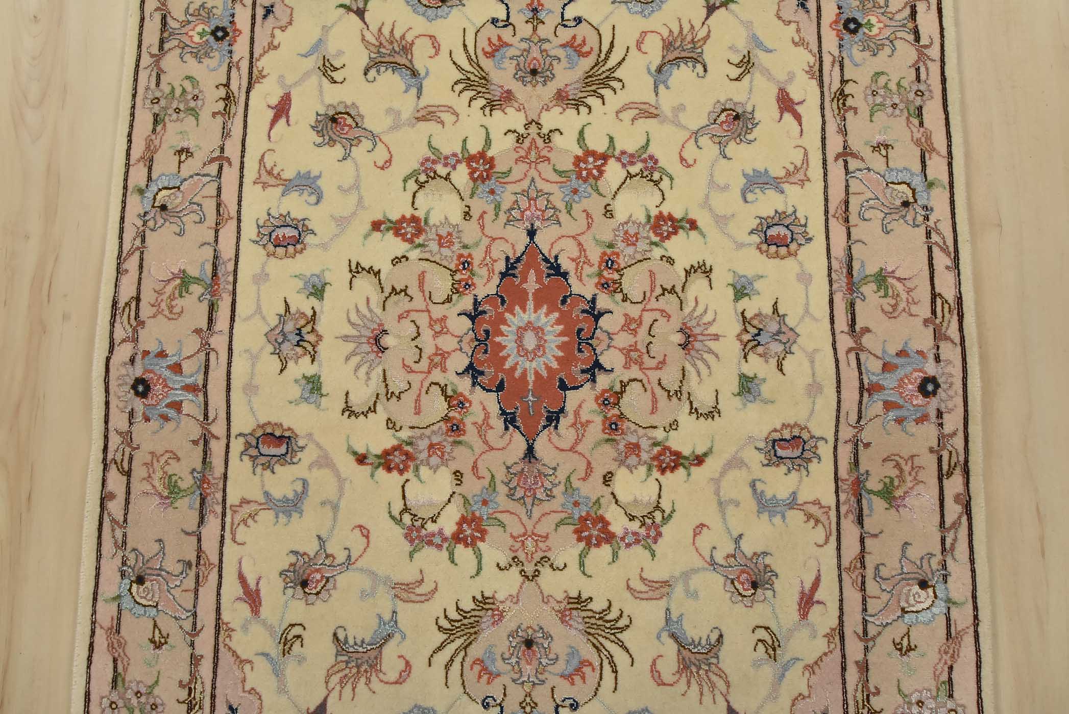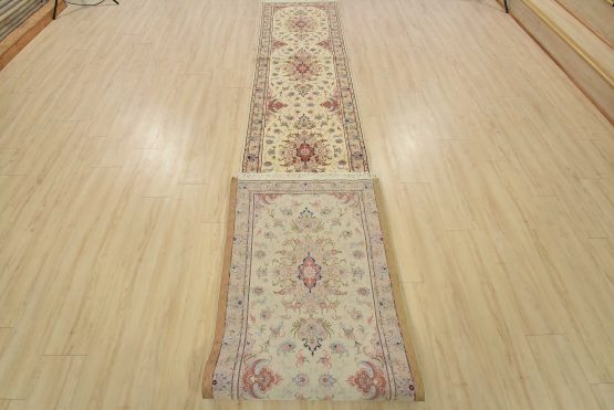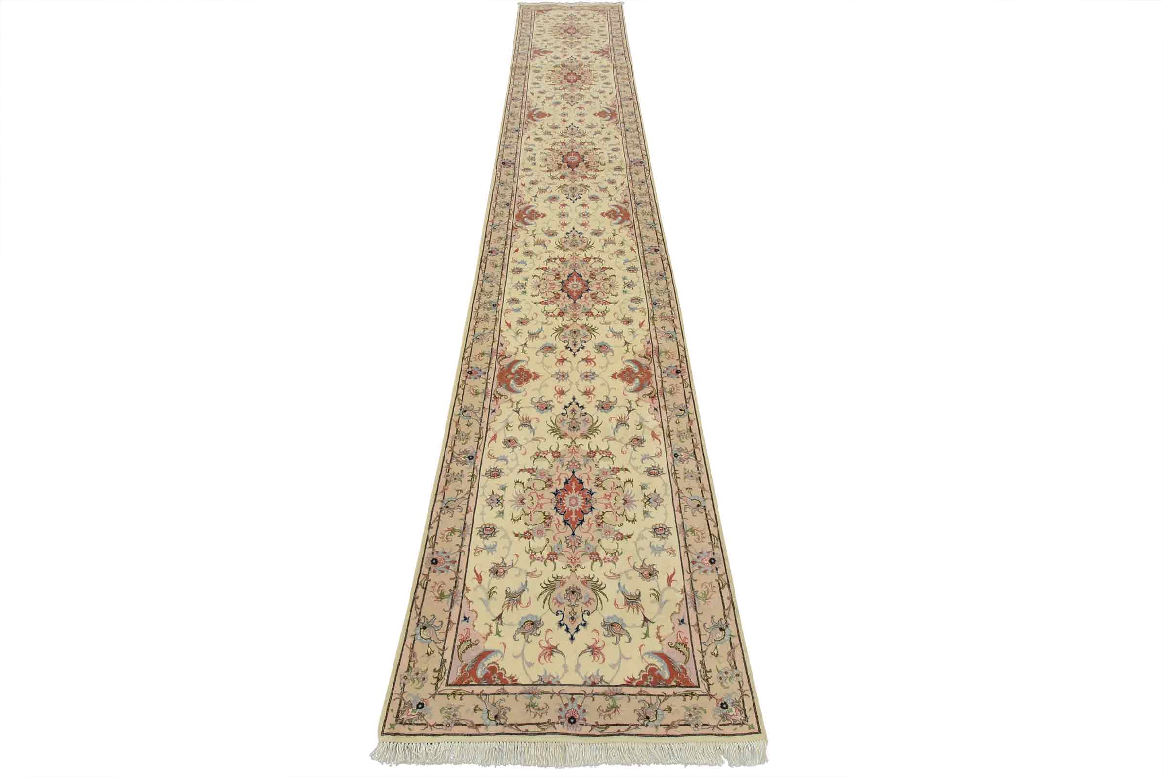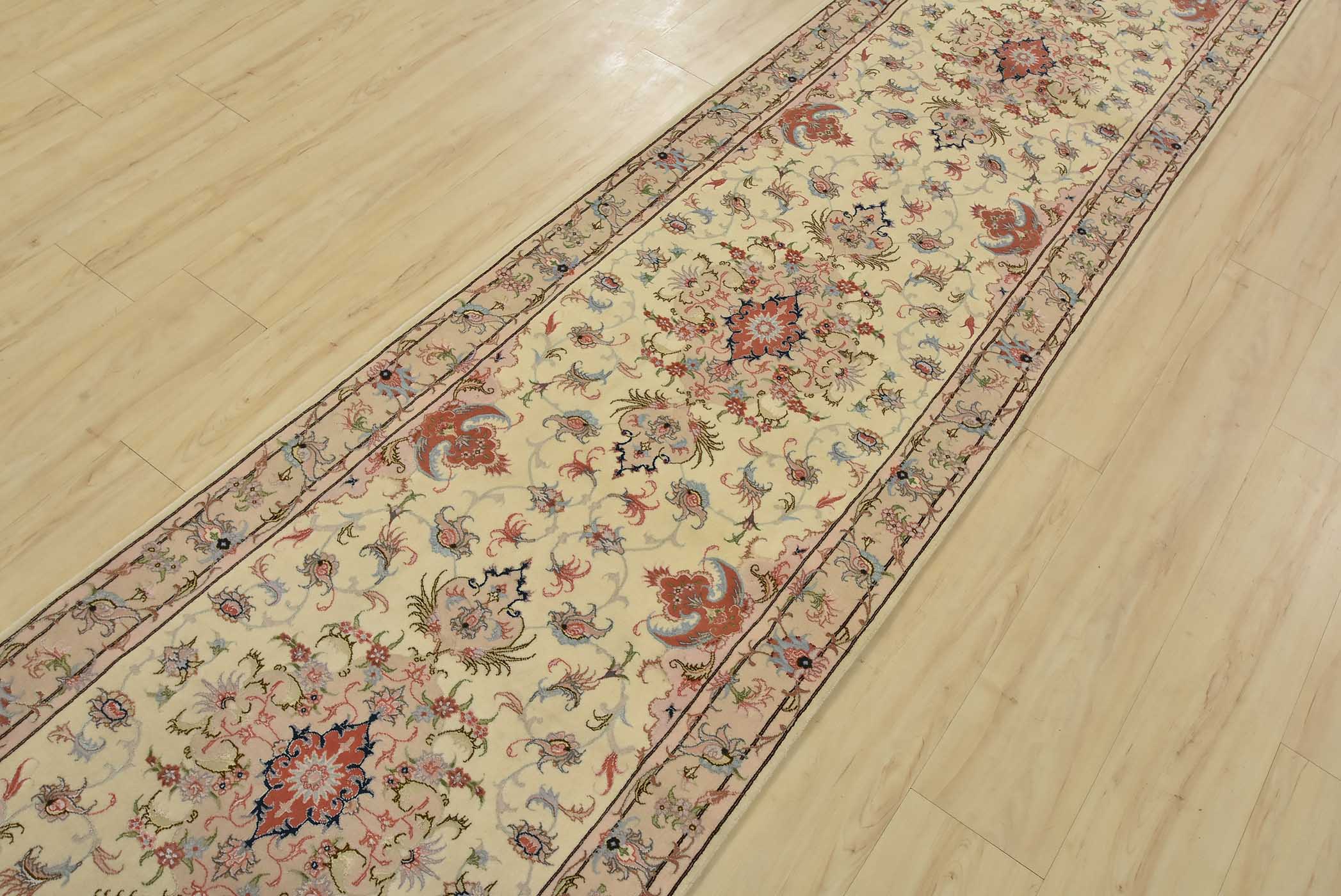 An authentic vintage traditional Tabriz runner, hand-knotted with fine wool and silk highlights using natural dyes. This intricately woven oriental rug features curvilinear medallions surrounded by a floral design set against an ivory background. It has a full wool pile with no worn areas and is in very good condition.