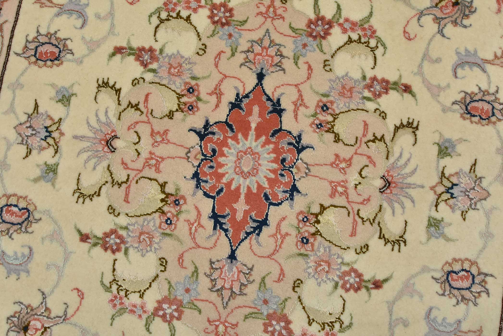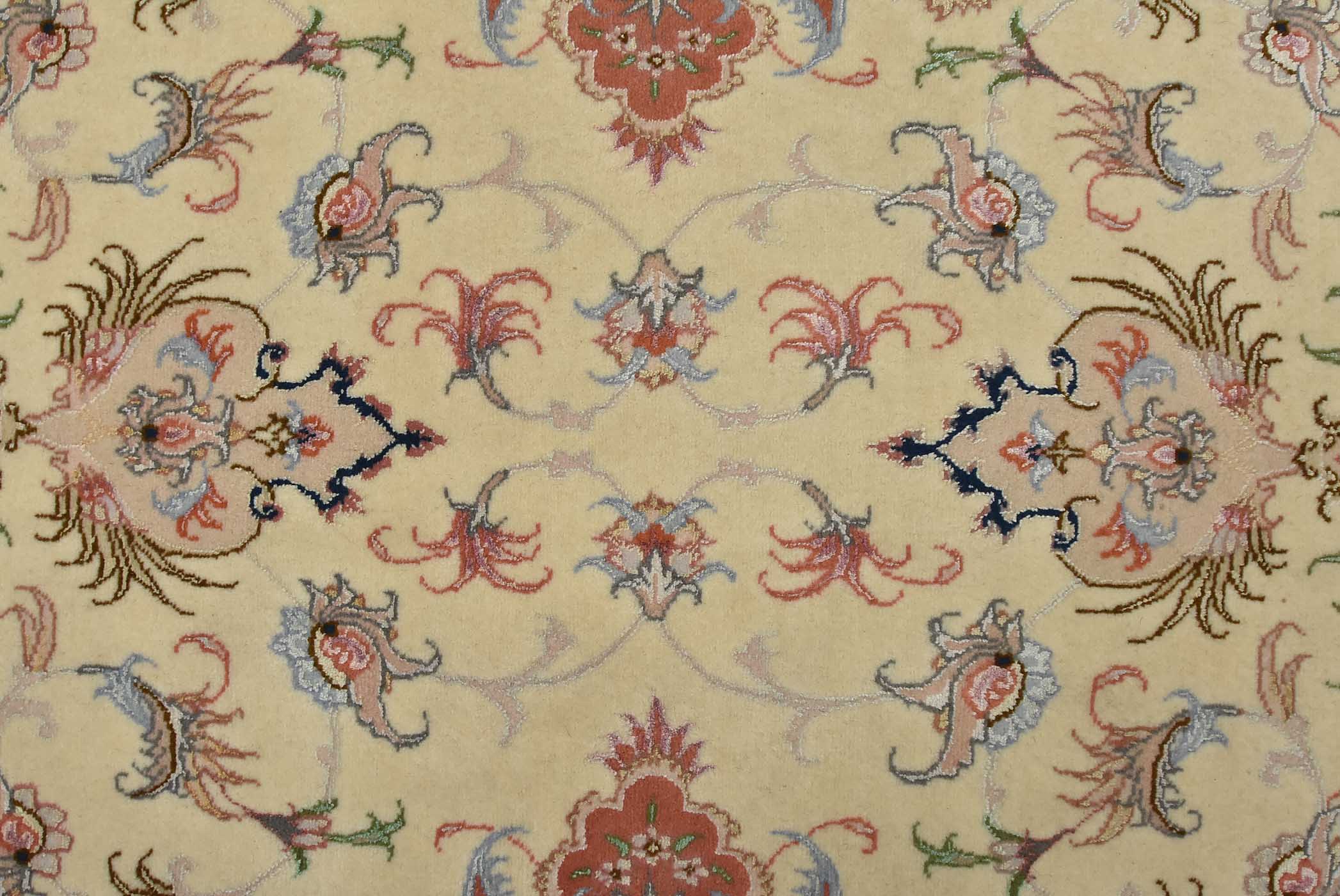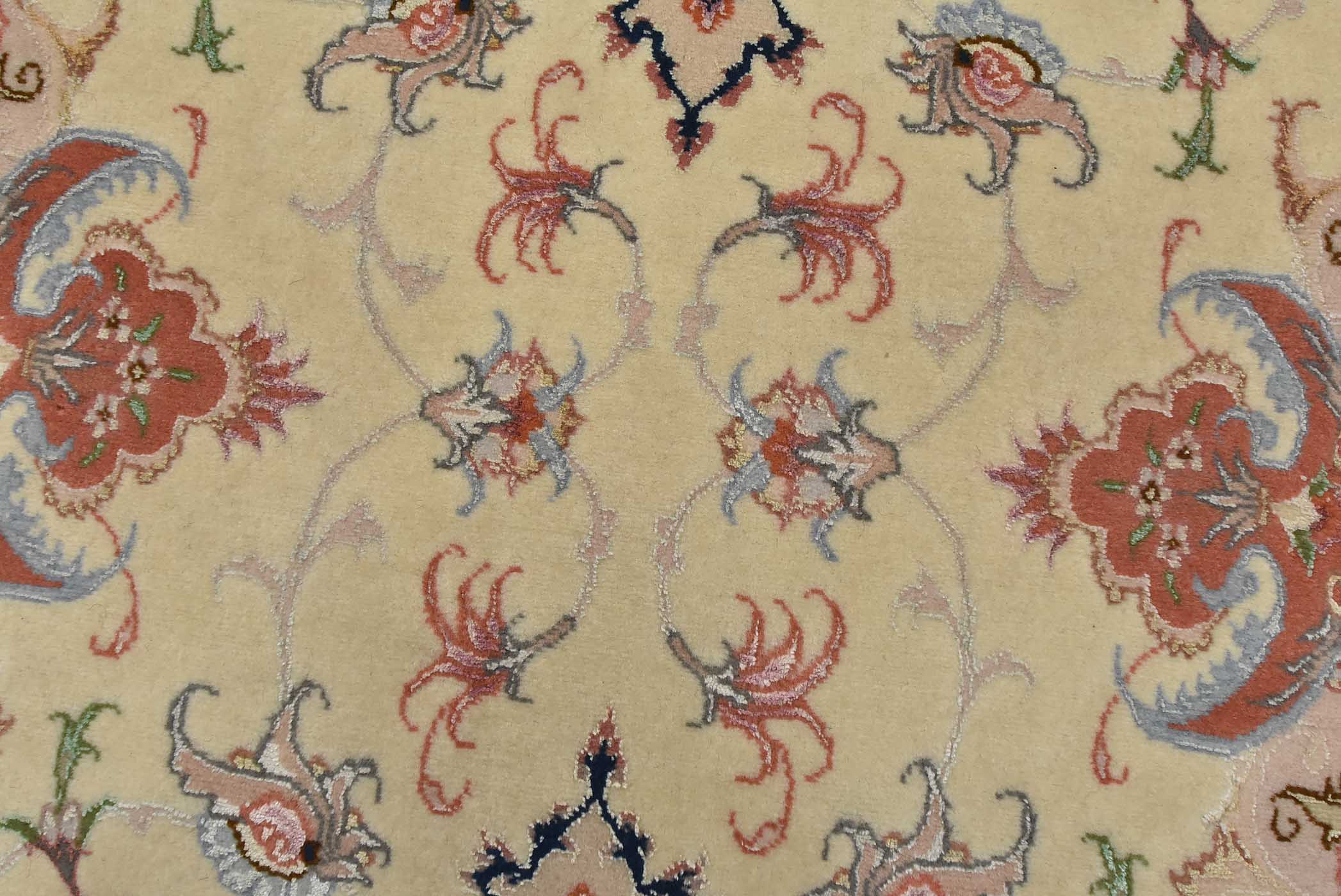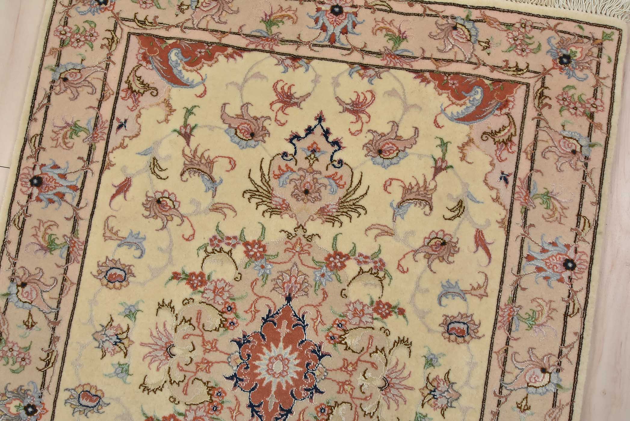 An authentic vintage traditional Tabriz runner, hand-knotted with fine wool and silk highlights using natural dyes. This intricately woven oriental rug features curvilinear medallions surrounded by a floral design set against an ivory background. It has a full wool pile with no worn areas and is in very good condition.