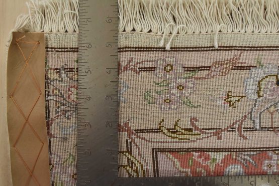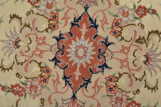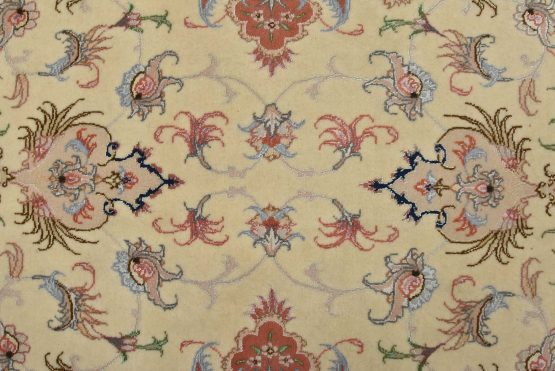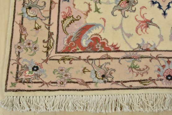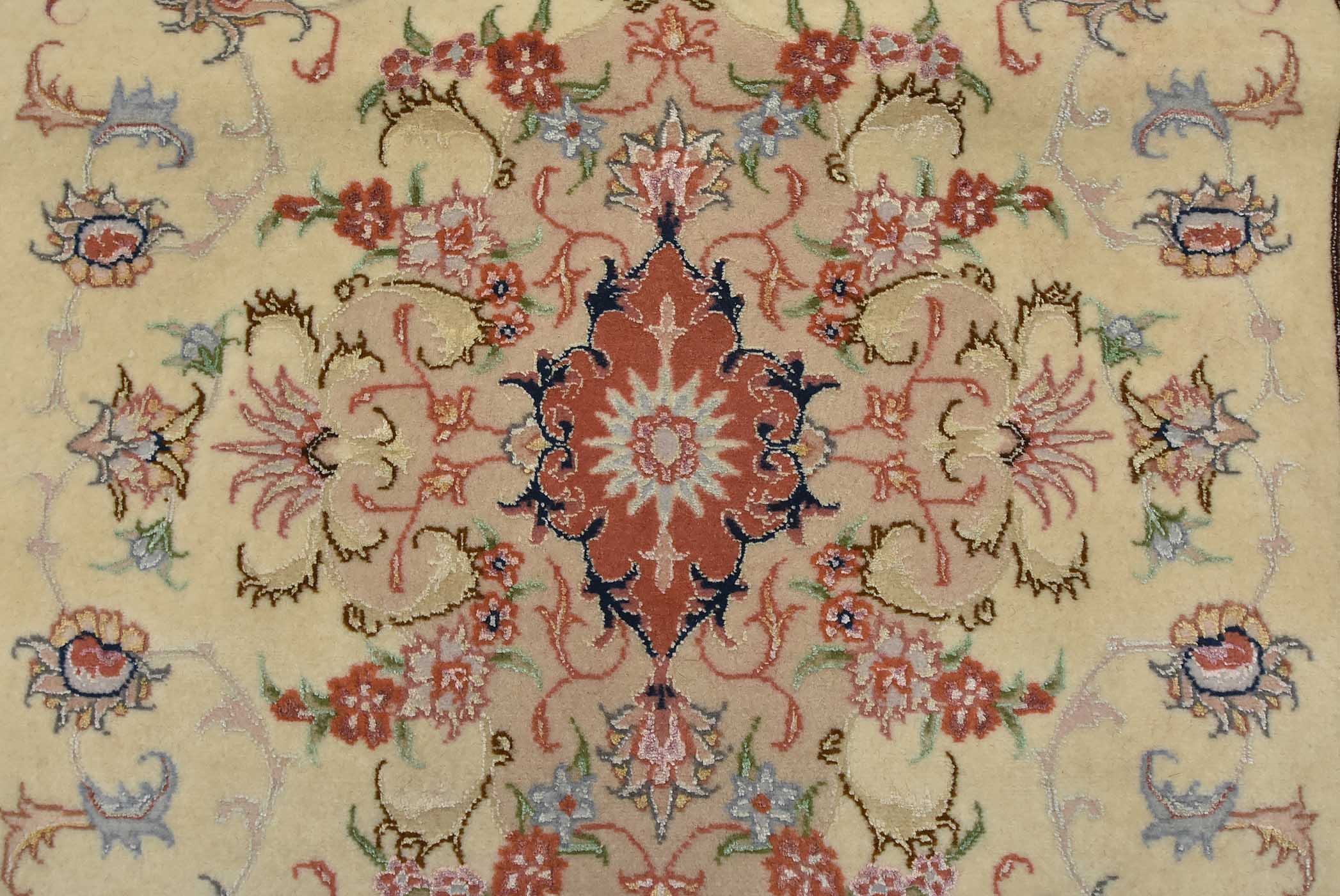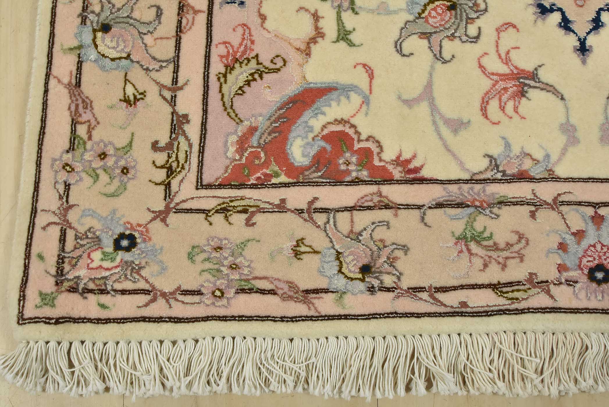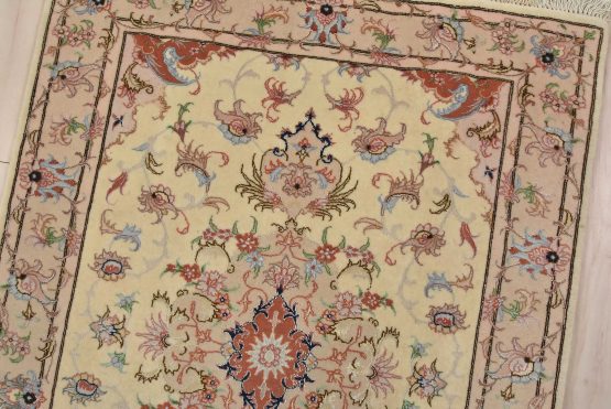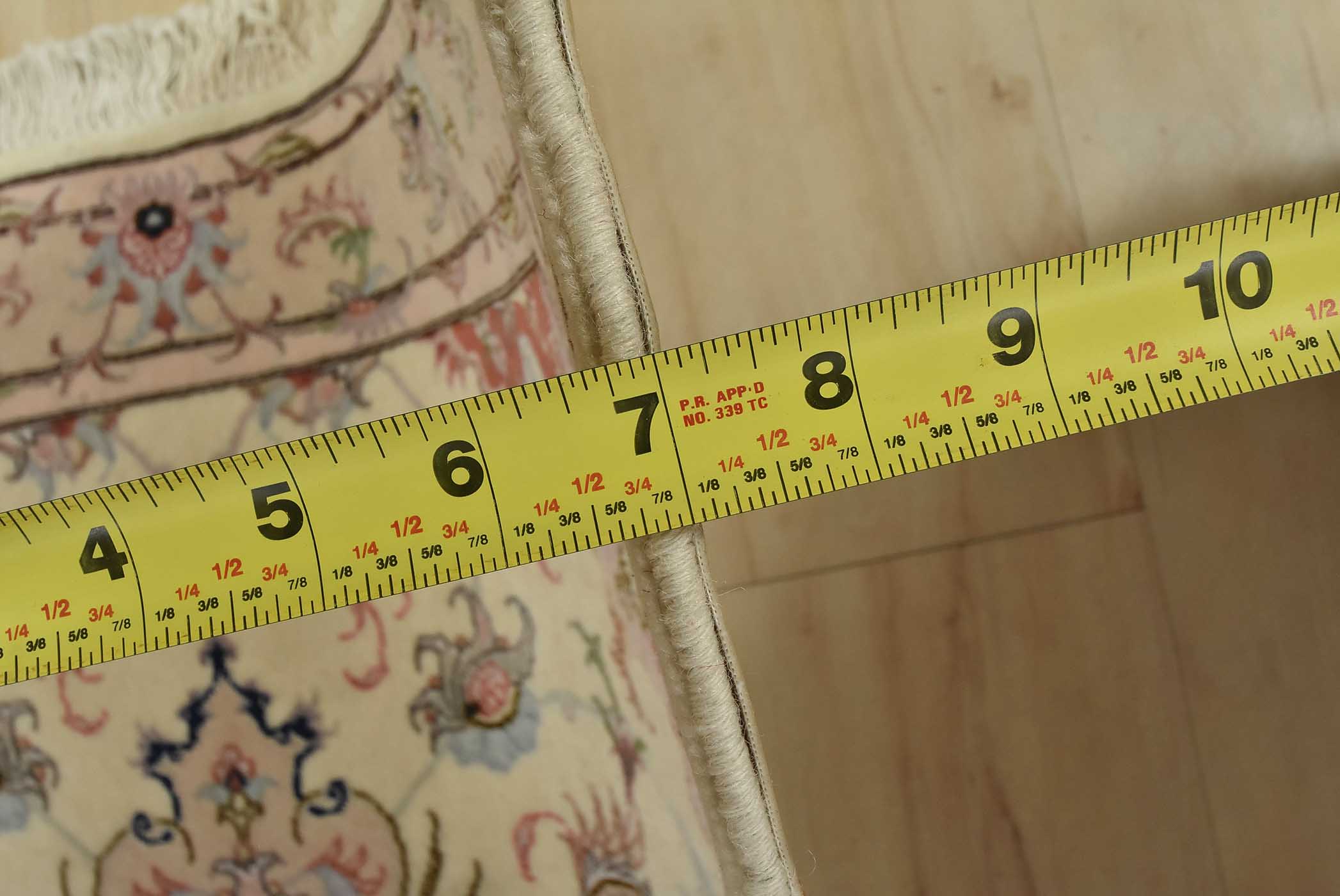 An authentic vintage traditional Tabriz runner, hand-knotted with fine wool and silk highlights using natural dyes. This intricately woven oriental rug features curvilinear medallions surrounded by a floral design set against an ivory background. It has a full wool pile with no worn areas and is in very good condition.