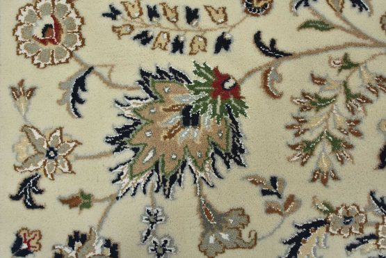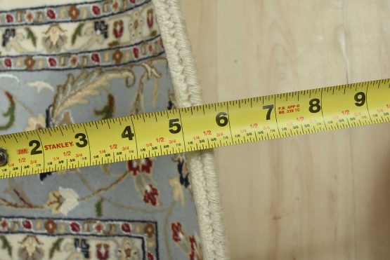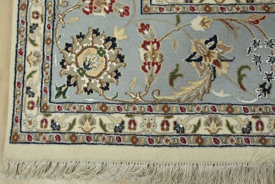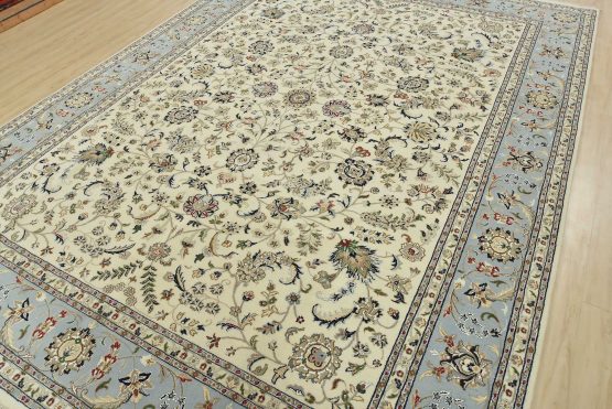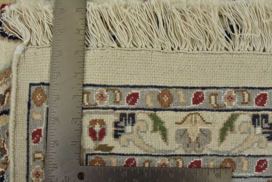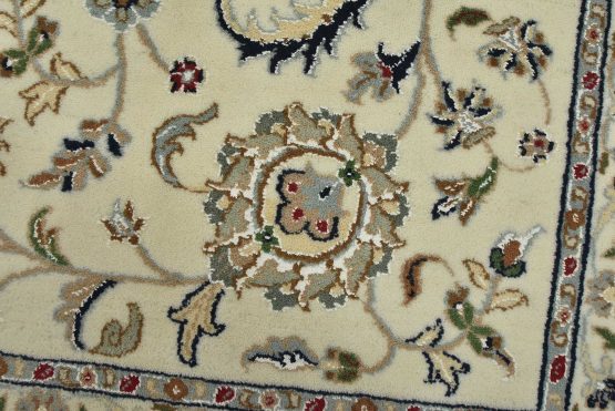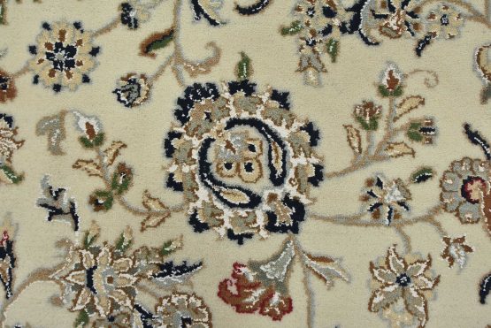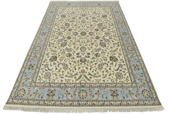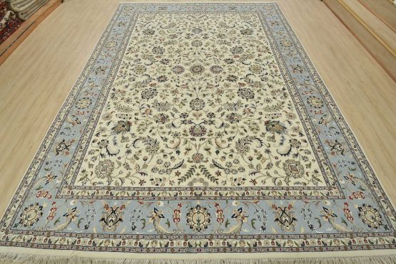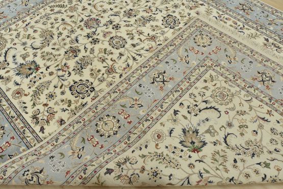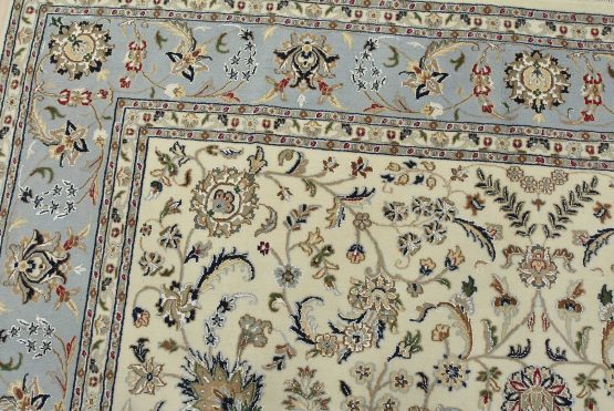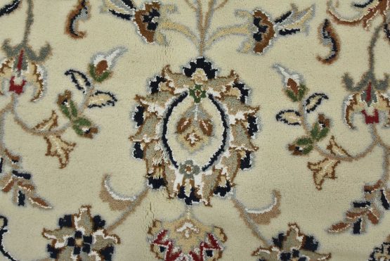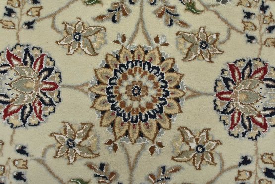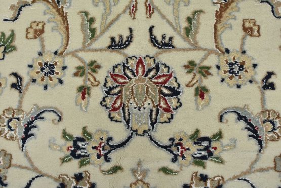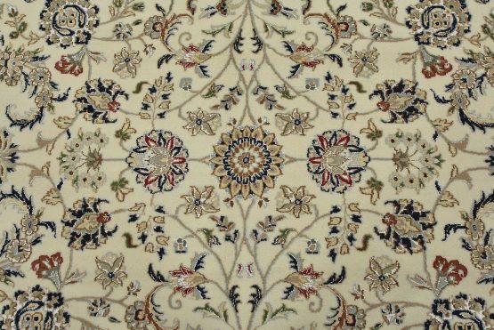 A traditional Nain rug hand-knotted with an all-wool pile on a cotton foundation. This finely woven oriental rug features an intricate all-over floral design set against a white background. It is new and in excellent condition.
