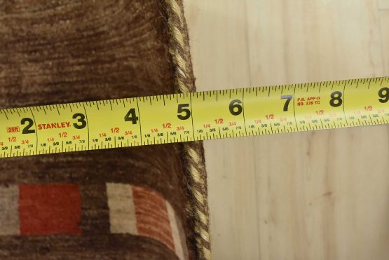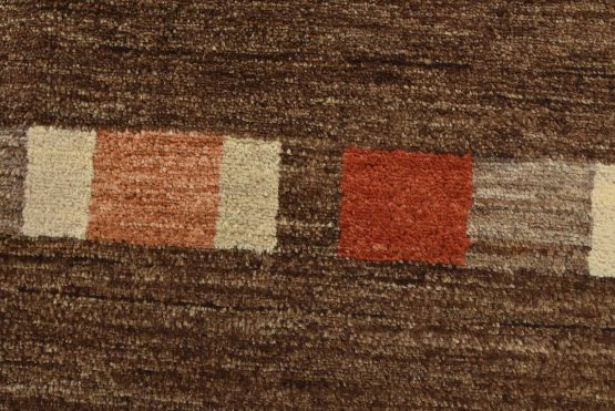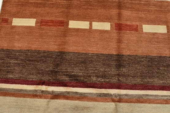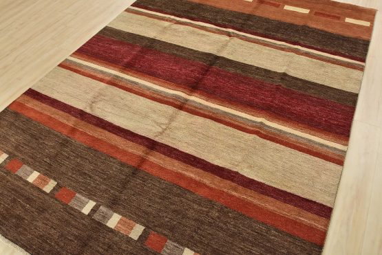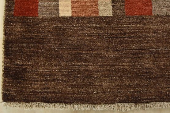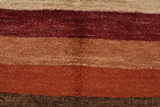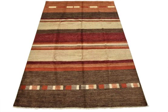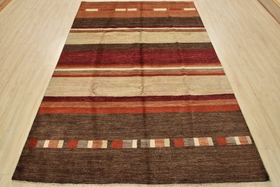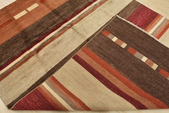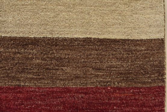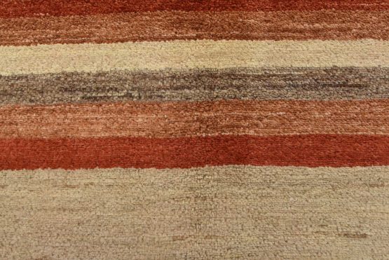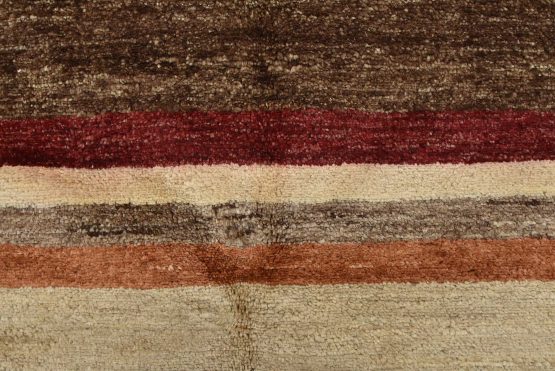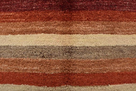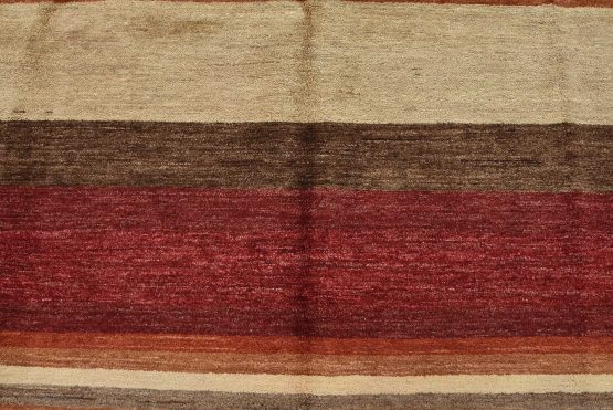 A contemporary Gabbeh rug hand-knotted with an all-wool pile on a cotton foundation. This finely woven oriental rug features horizontal stripes in multiple colors. It is new and in excellent condition.