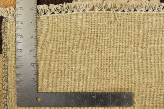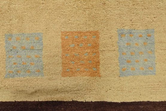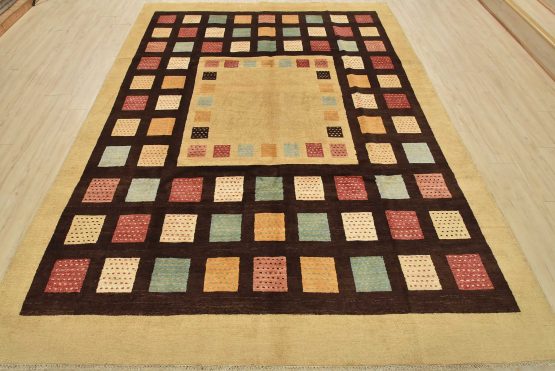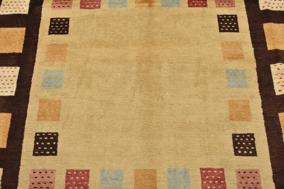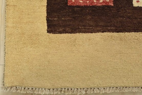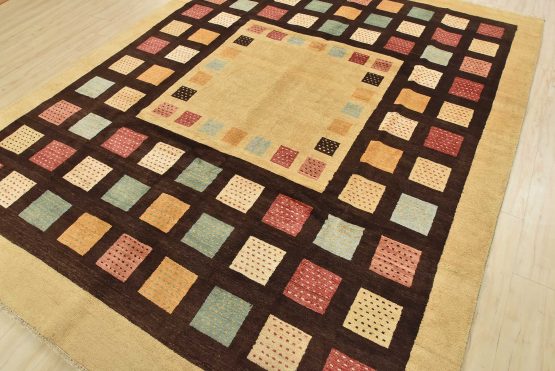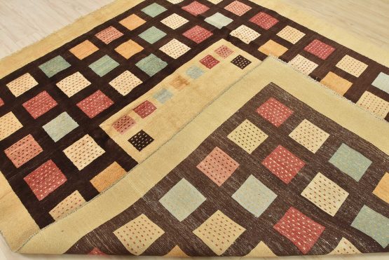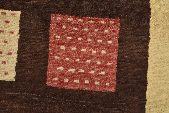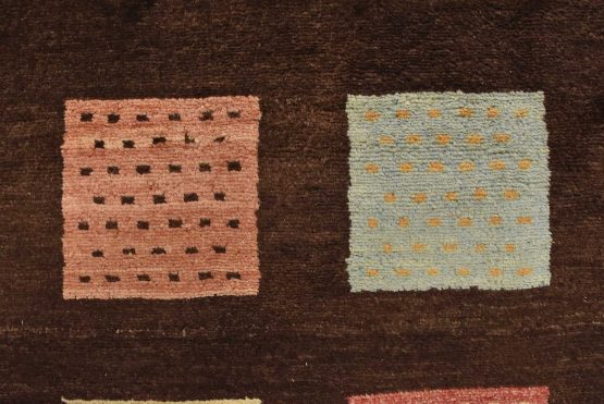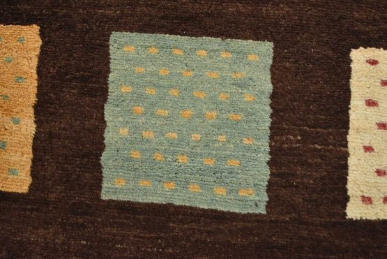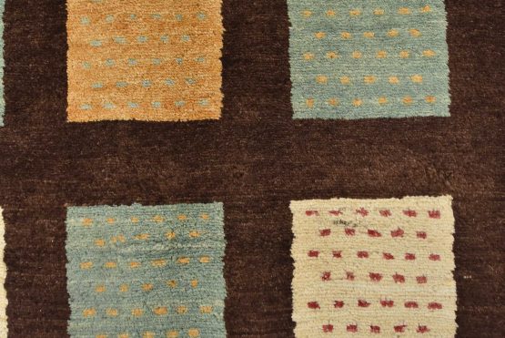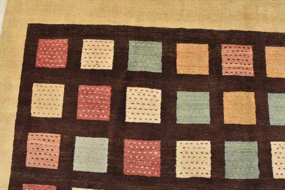 A contemporary Gabbeh rug hand-knotted with an all-wool pile on a cotton foundation. This finely woven oriental rug features a central geometric medallion surrounded by a square-shaped pattern set against a brown background. It is new and in excellent condition.