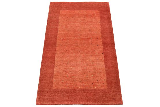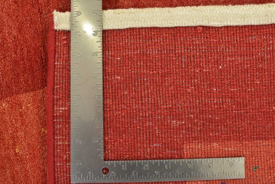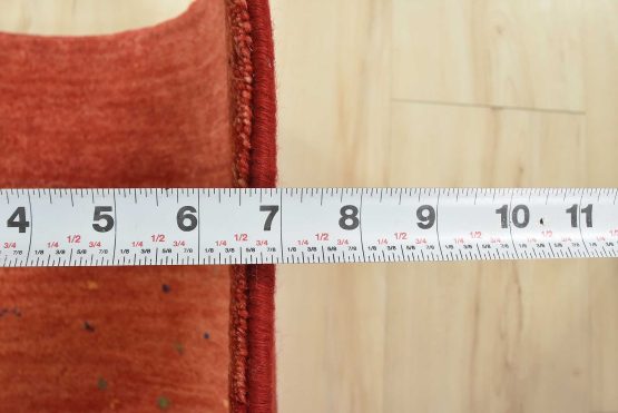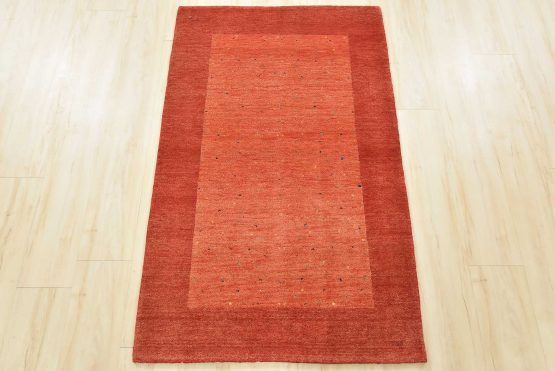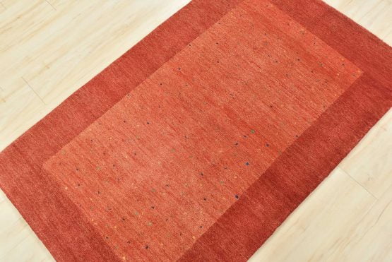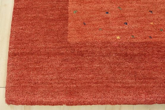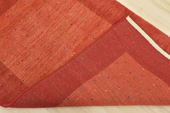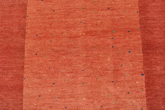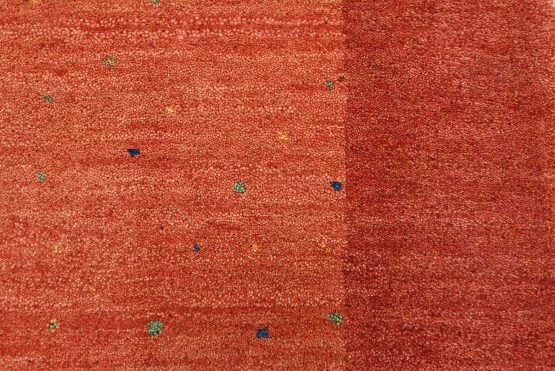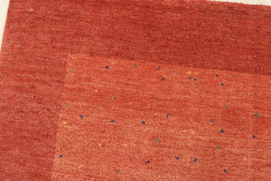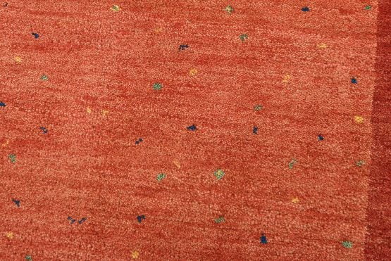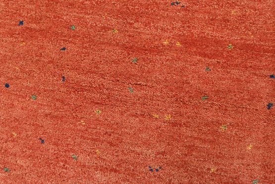 A contemporary Gabbeh rug hand-knotted with an all-wool pile on a cotton foundation. This finely woven area rug features a multicolored sprinkled pattern set against a red background. It is new and in excellent condition.