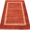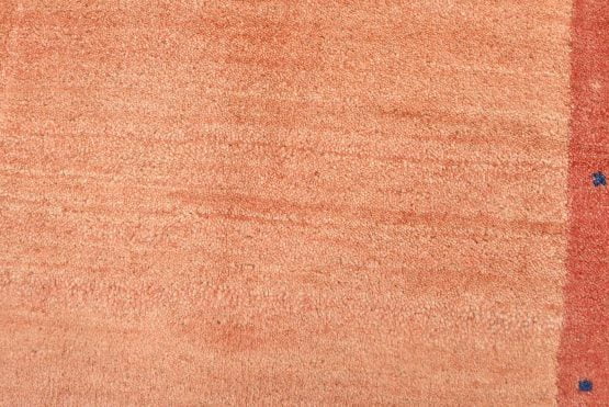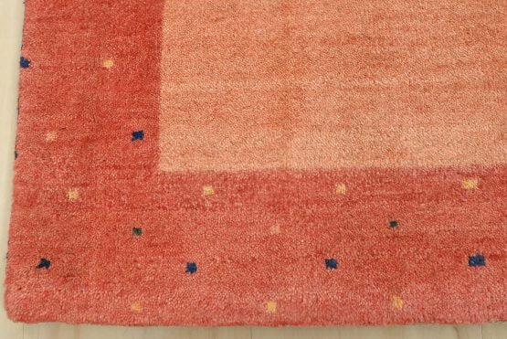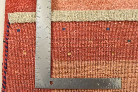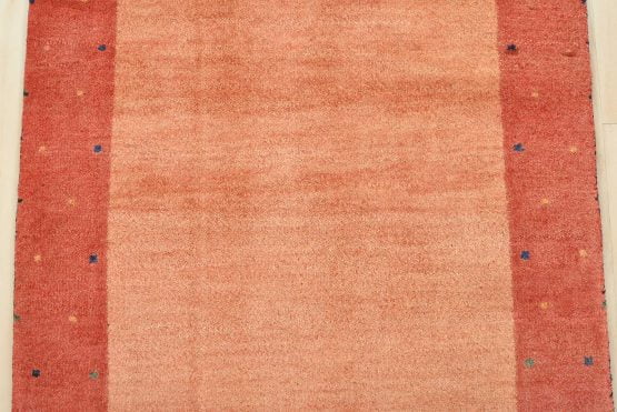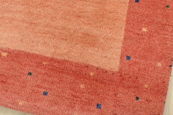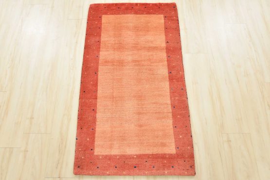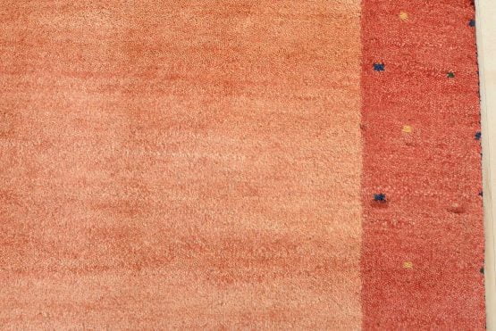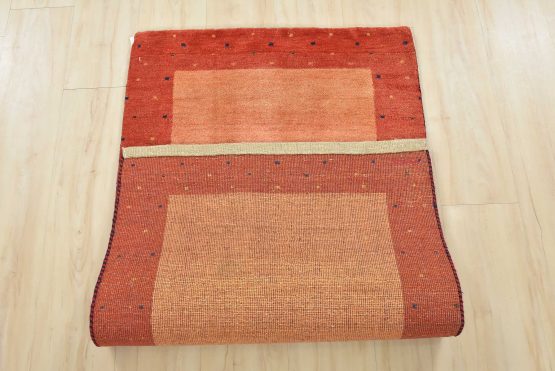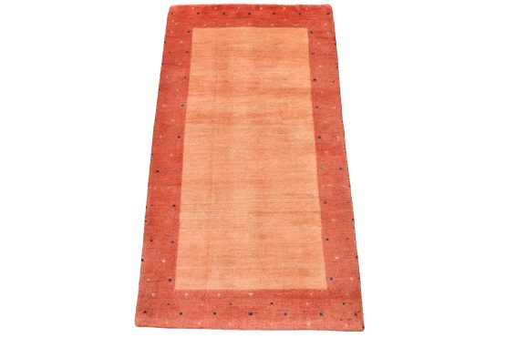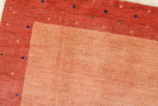 A contemporary Gabbeh rug hand-knotted with an all-wool pile on a cotton foundation. This finely woven rug features a solid orange background bordered by a multicolored dotted pattern. It is new and in excellent condition.