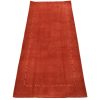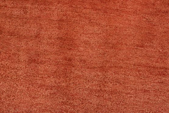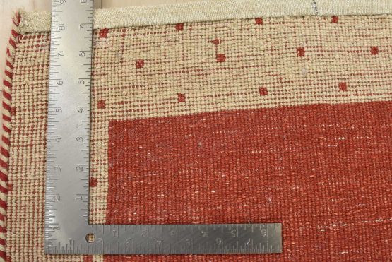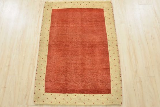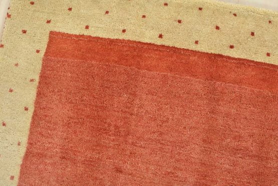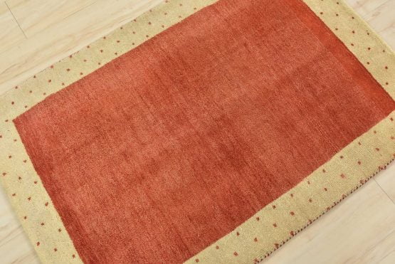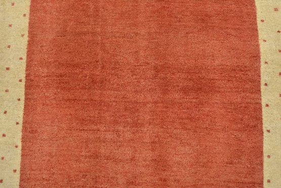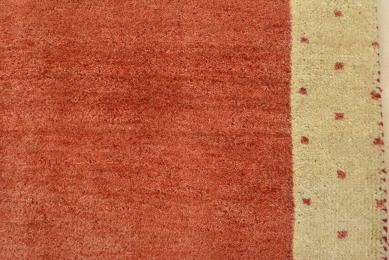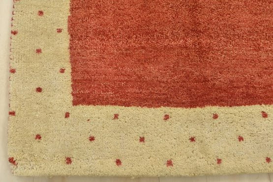 A contemporary Gabbeh rug hand-knotted with an all-wool pile on a cotton foundation. This finely woven area rug features a solid red background bordered by a dotted pattern. It is new and in excellent condition.