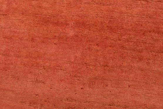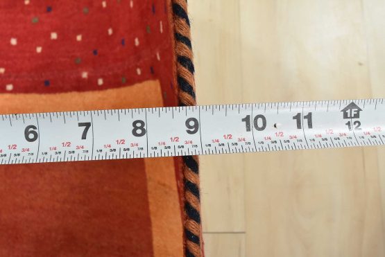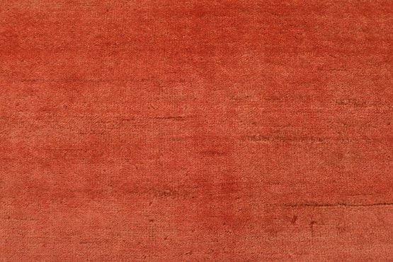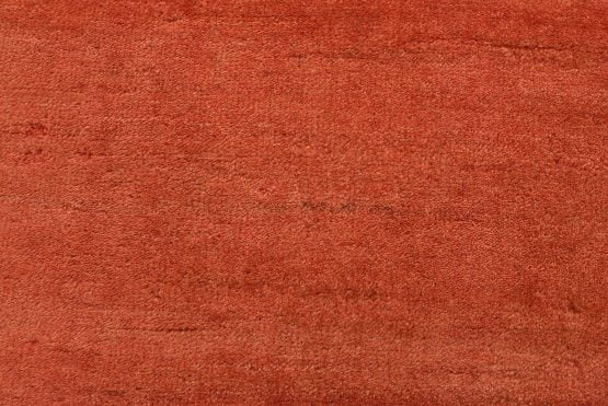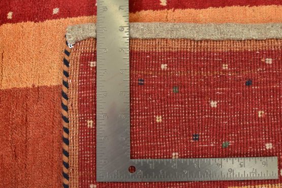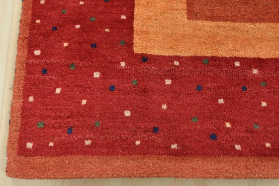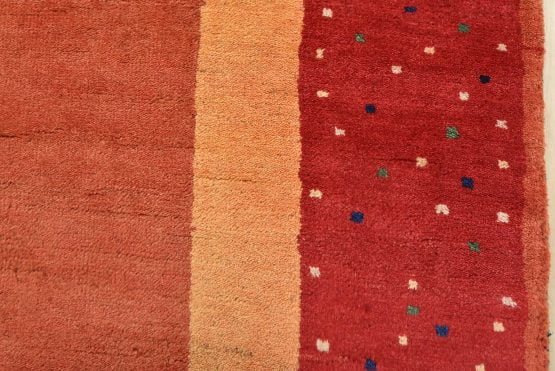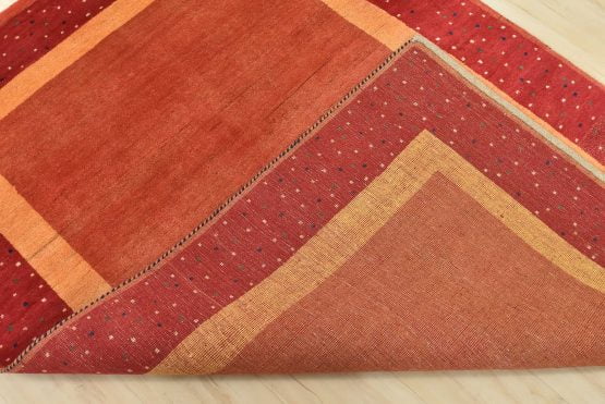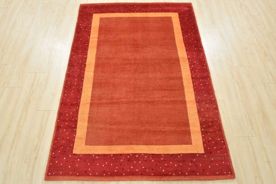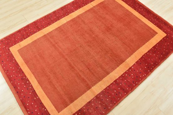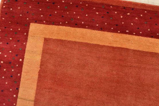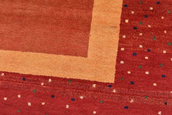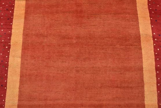 A contemporary Gabbeh rug hand-knotted with an all-wool pile on a cotton foundation. This finely woven area rug features a solid rust-colored background, bordered by a multicolored dotted pattern. It is new and in excellent condition.