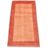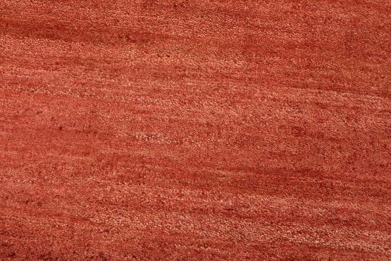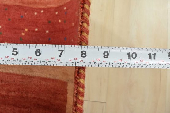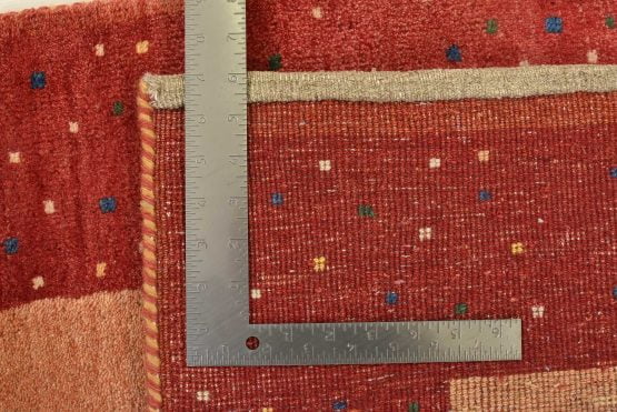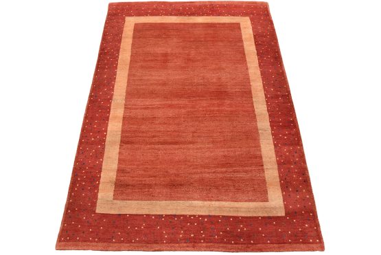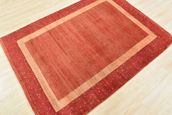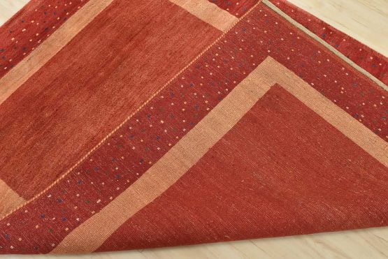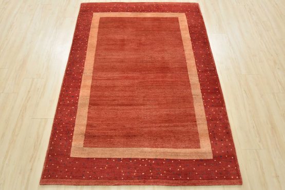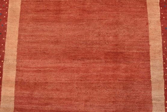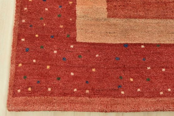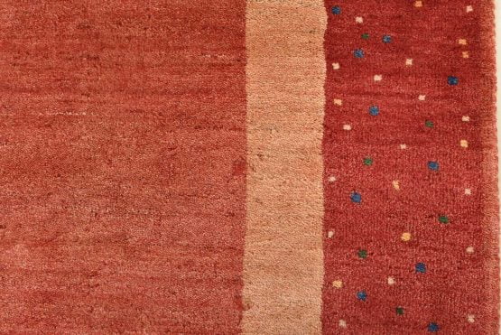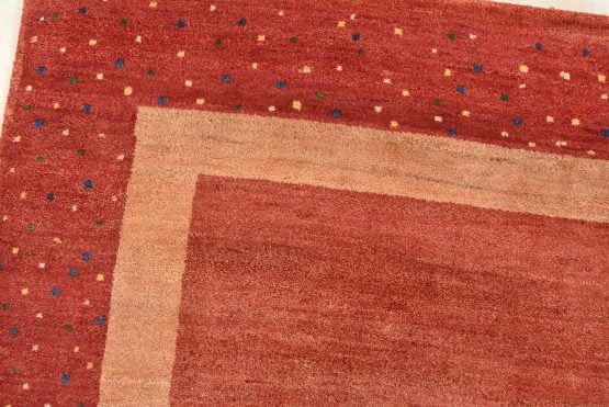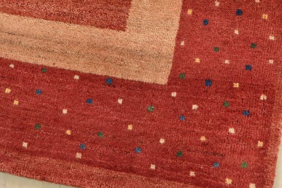 A contemporary Gabbeh rug hand-knotted with an all-wool pile on a cotton foundation. This finely woven area rug features a solid red background bordered by a multicolored dotted pattern. It is new and in excellent condition.