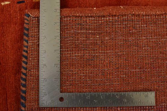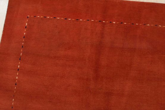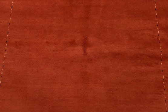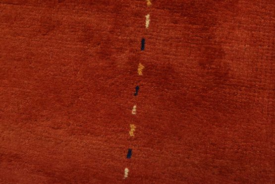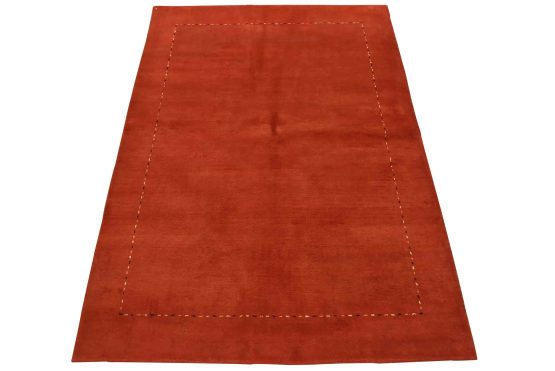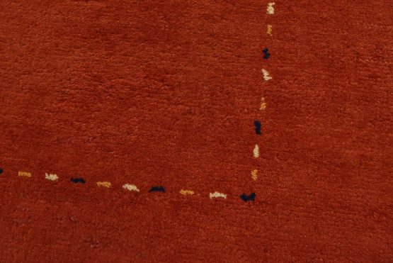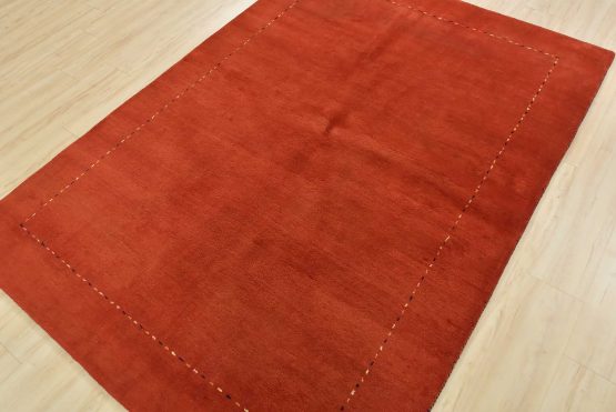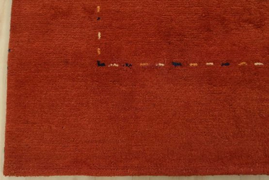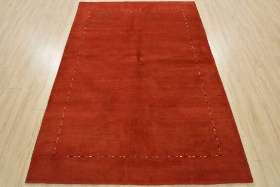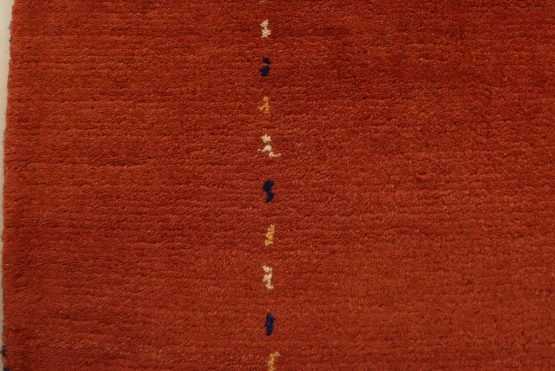 A contemporary Gabbeh rug hand-knotted with an all-wool pile on a cotton foundation. This finely woven oriental rug features a solid red background bordered by thin lines in multiple colors. It is new and in excellent condition.