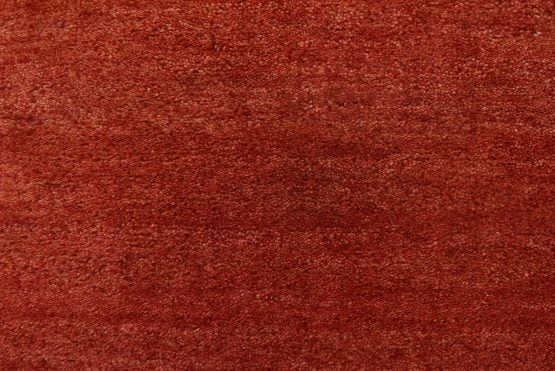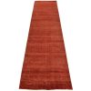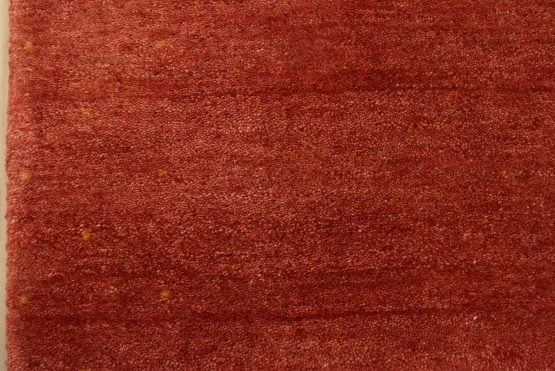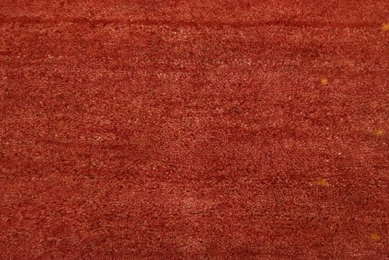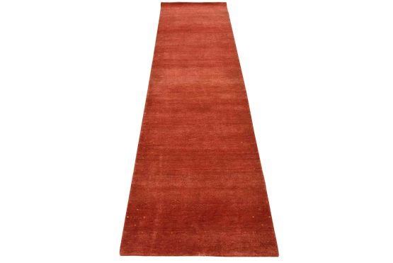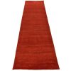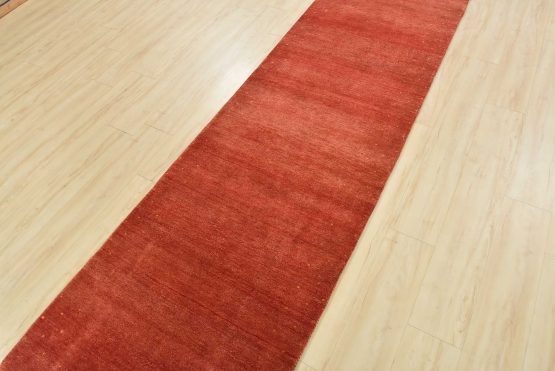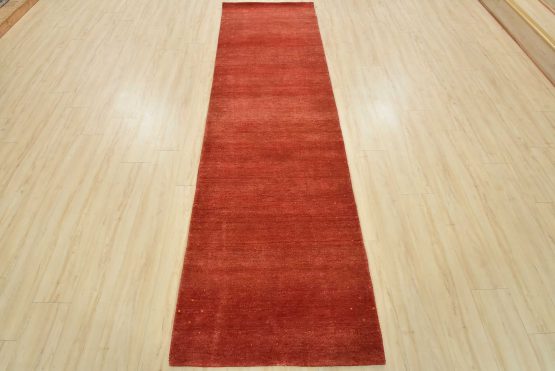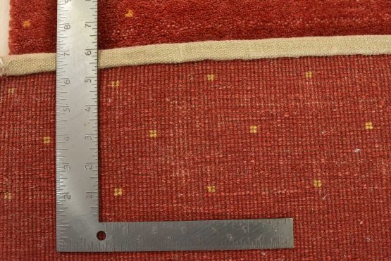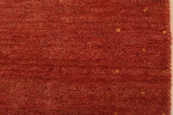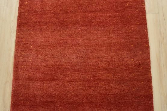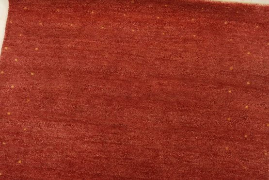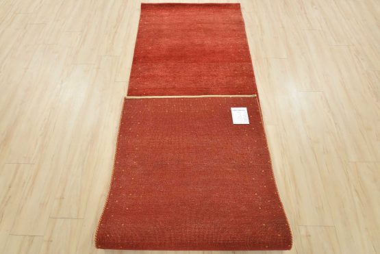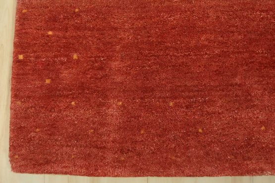 A contemporary Gabbeh runner hand-knotted with an all-wool pile on a cotton foundation. This oriental rug features a solid red background with a gold dot pattern embedded in the border. It is new and in excellent condition.
