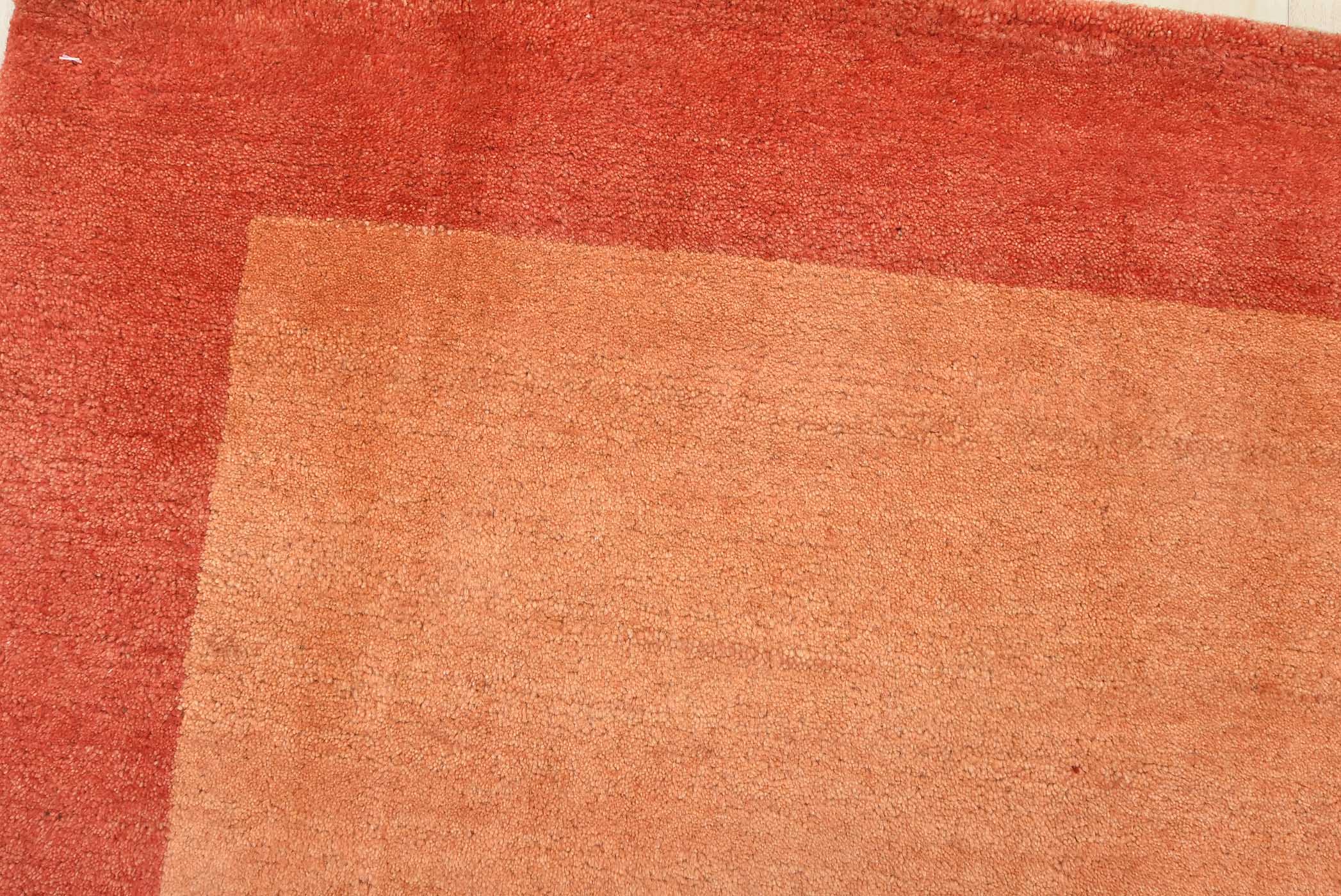 A contemporary Gabbeh rug hand-knotted with an all-wool pile on a cotton foundation. This finely woven rug features a solid orange background framed by a red border. It is new and in excellent condition.