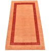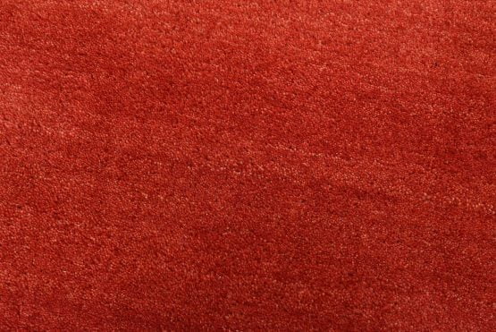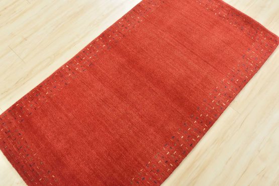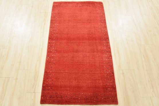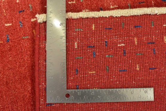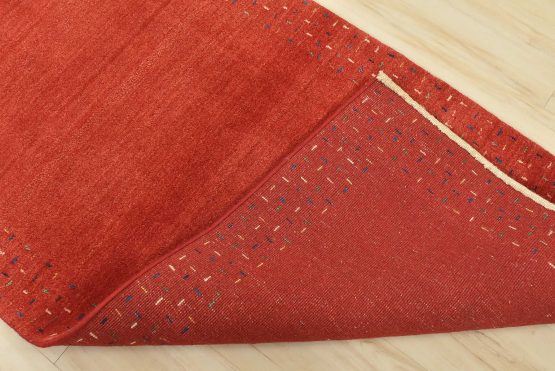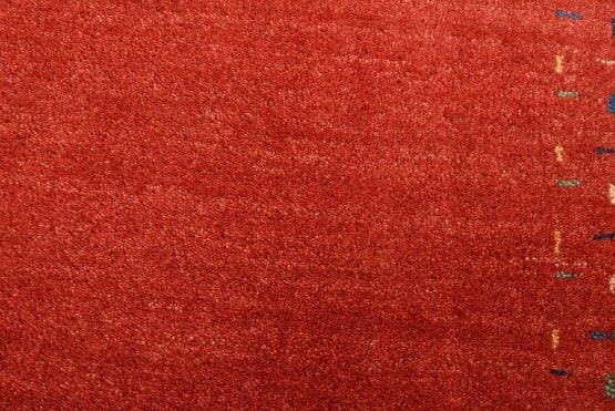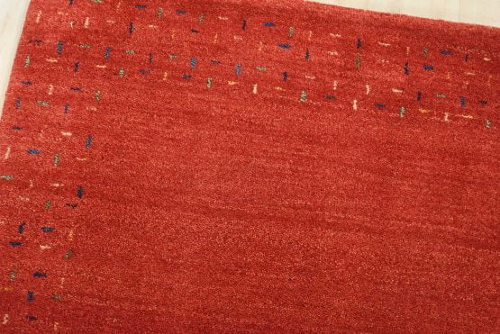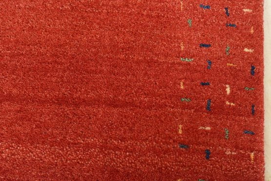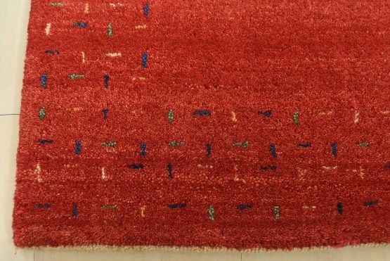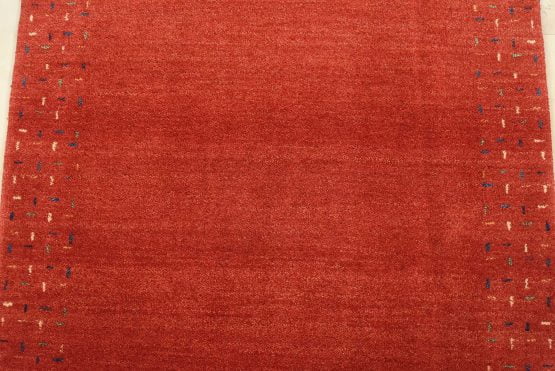 A contemporary Gabbeh rug hand-knotted with an all-wool pile on a cotton foundation. This finely woven area rug features a solid red background bordered by a multicolored sprinkled pattern. It is new and in excellent condition.