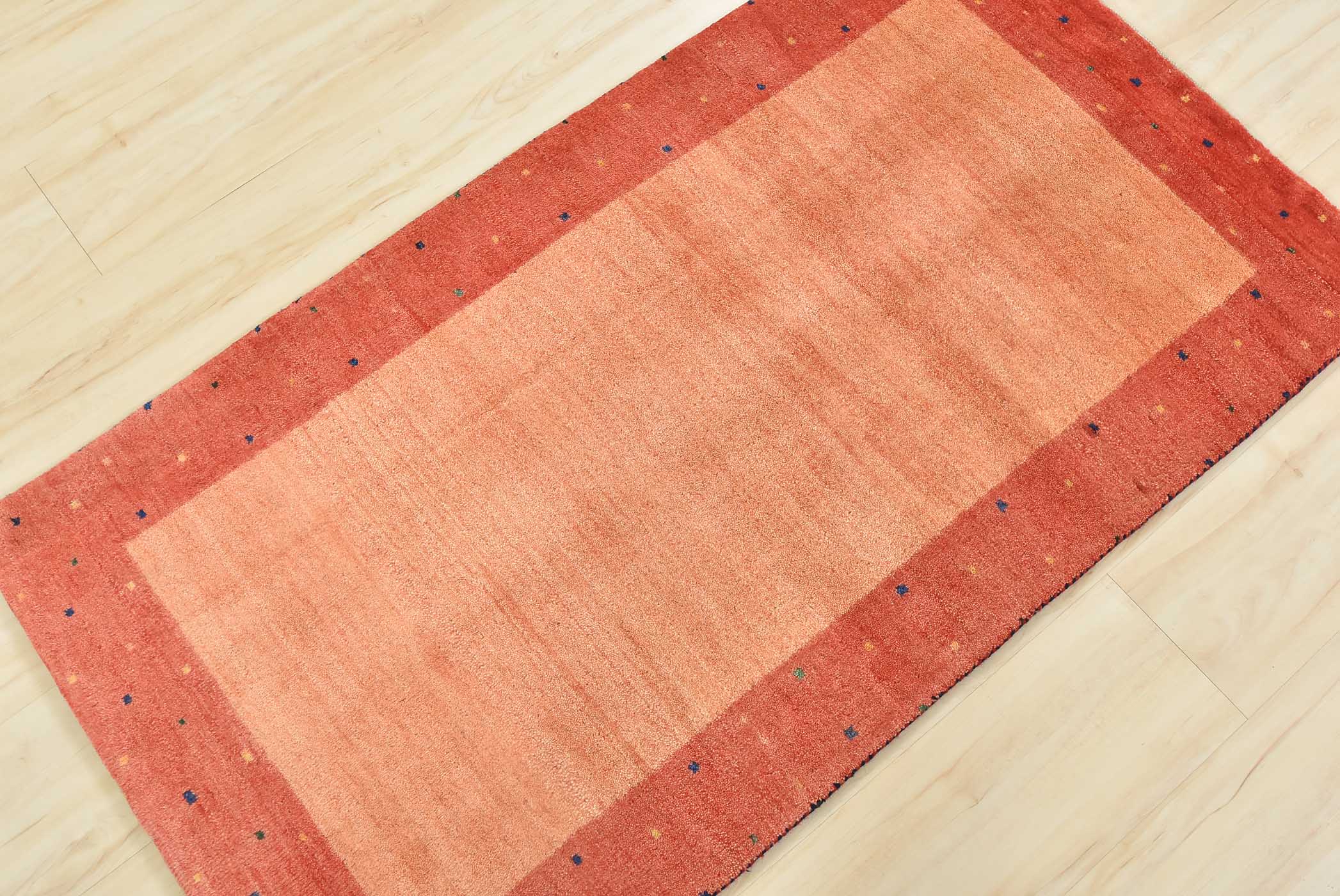 A contemporary Gabbeh rug hand-knotted with an all-wool pile on a cotton foundation. This finely woven rug features a solid orange background bordered by a multicolored dotted pattern. It is new and in excellent condition.