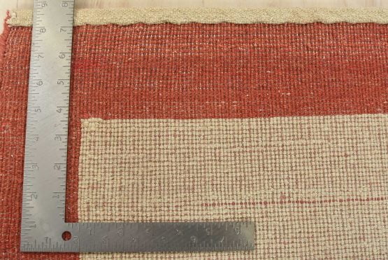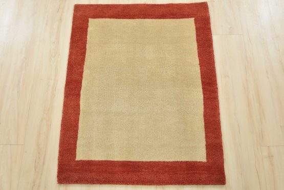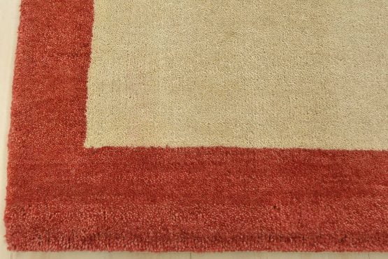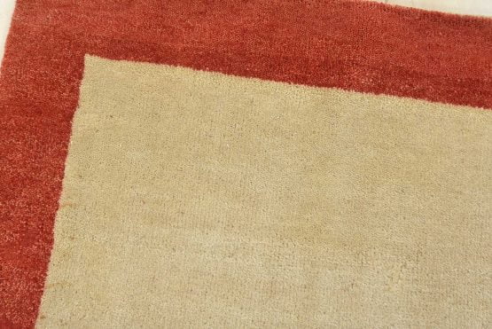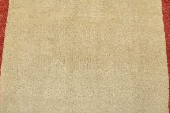 A contemporary Gabbeh rug hand-knotted with an all-wool pile on a cotton foundation. This finely woven oriental rug features a solid ivory-colored background with a red border. It is new and in excellent condition.