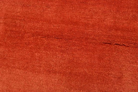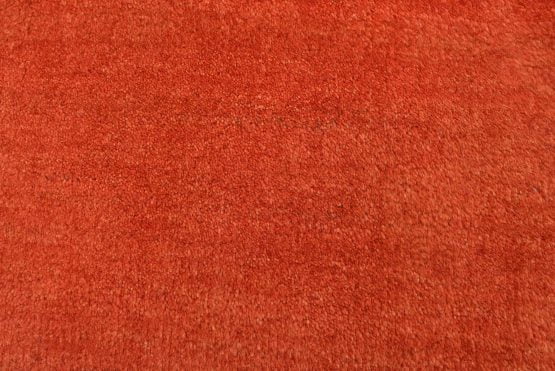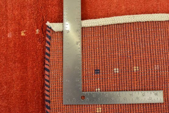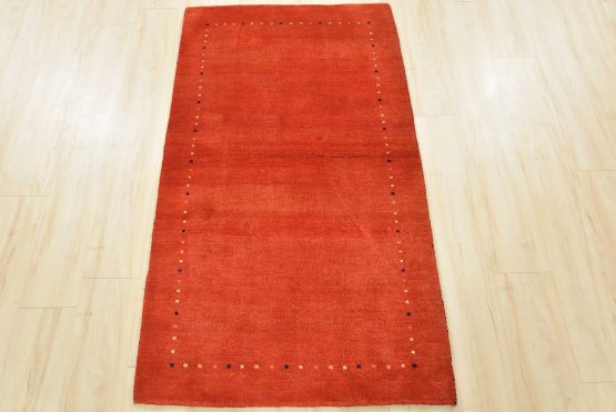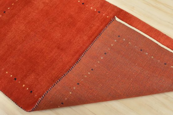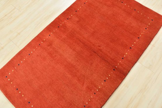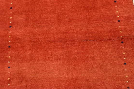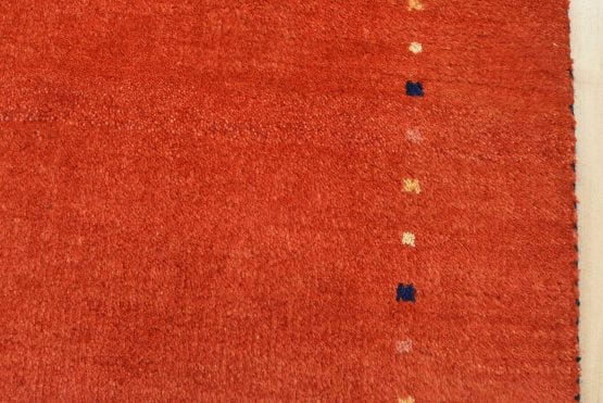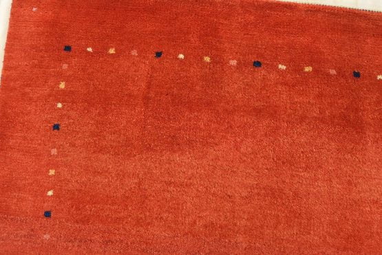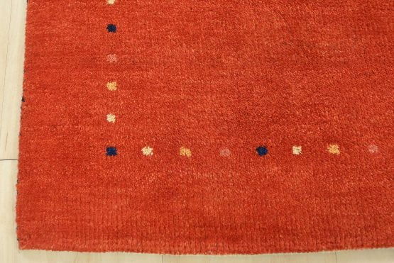 A contemporary Gabbeh rug hand-knotted with an all-wool pile on a cotton foundation. This finely woven area rug features a solid red background bordered by a multicolored dotted line. It is new and in excellent condition.