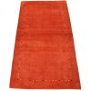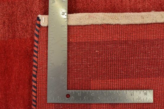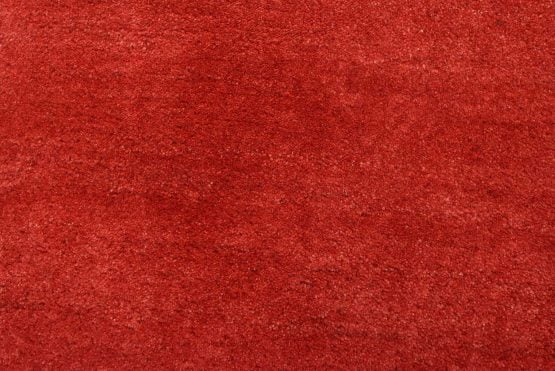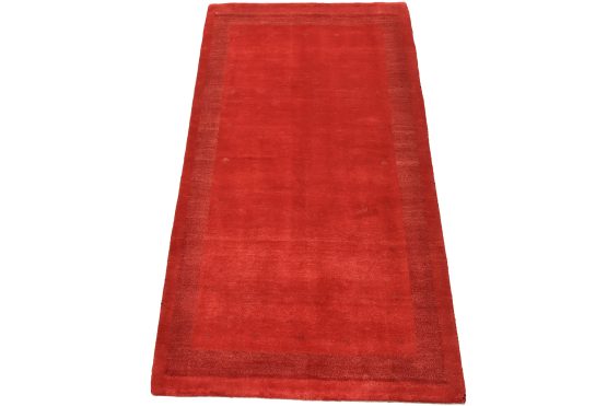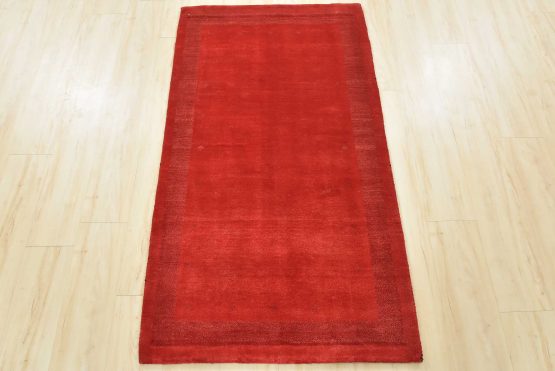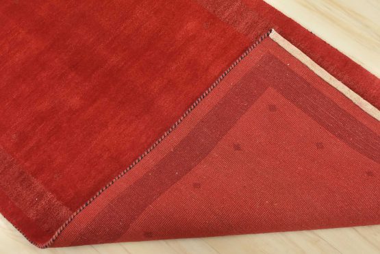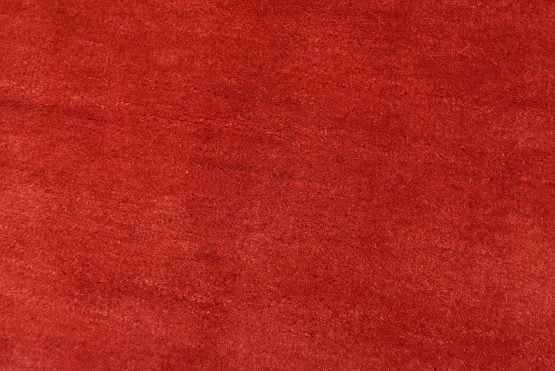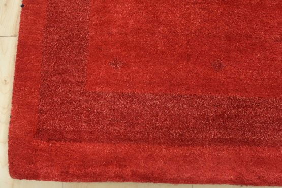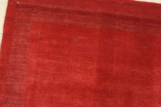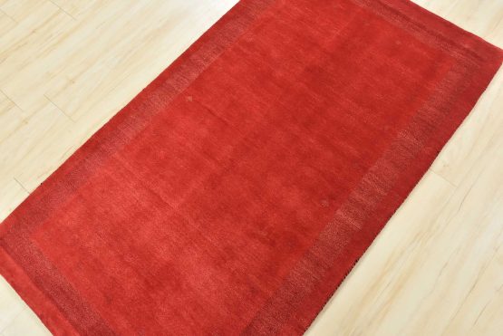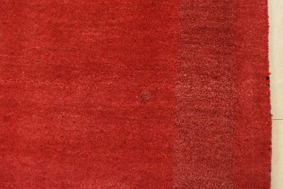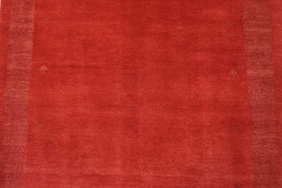 A contemporary Gabbeh rug hand-knotted with an all-wool pile on a cotton foundation. This finely woven area rug features a solid red background complemented by a darker red border. It is new and in excellent condition.