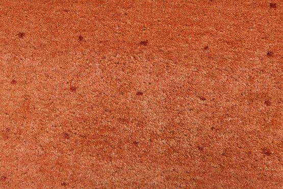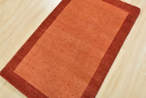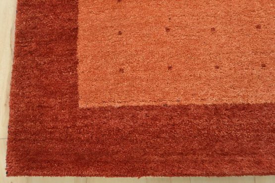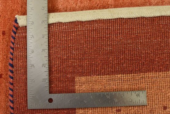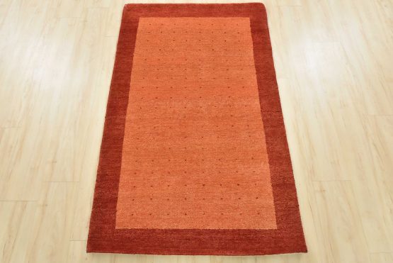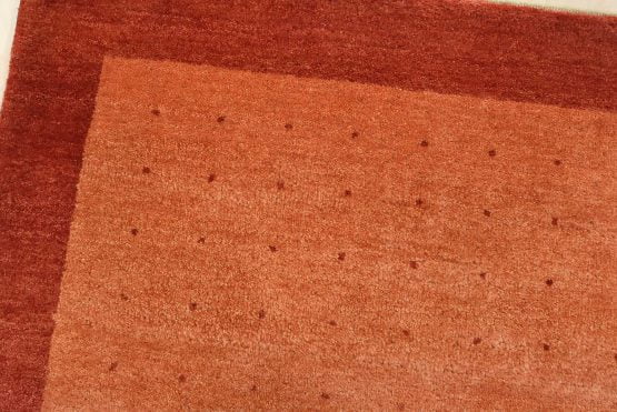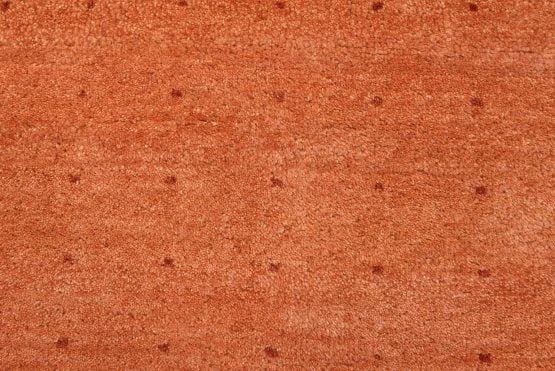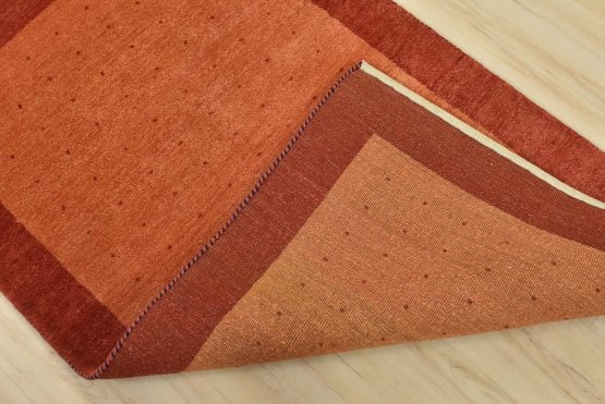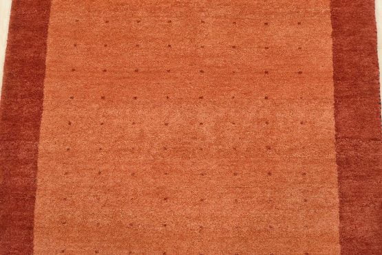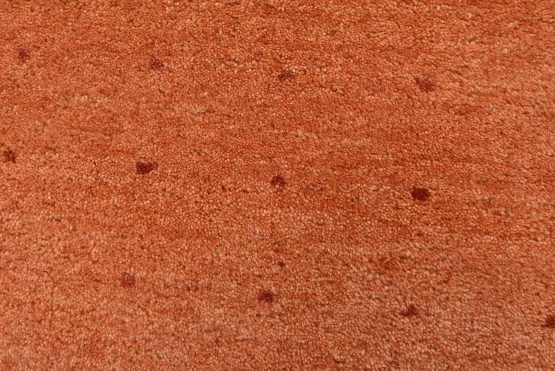 A contemporary Gabbeh rug hand-knotted with an all-wool pile on a cotton foundation. This oriental rug features an all-over pattern of red dots set against an orange background. It is new and in excellent condition.