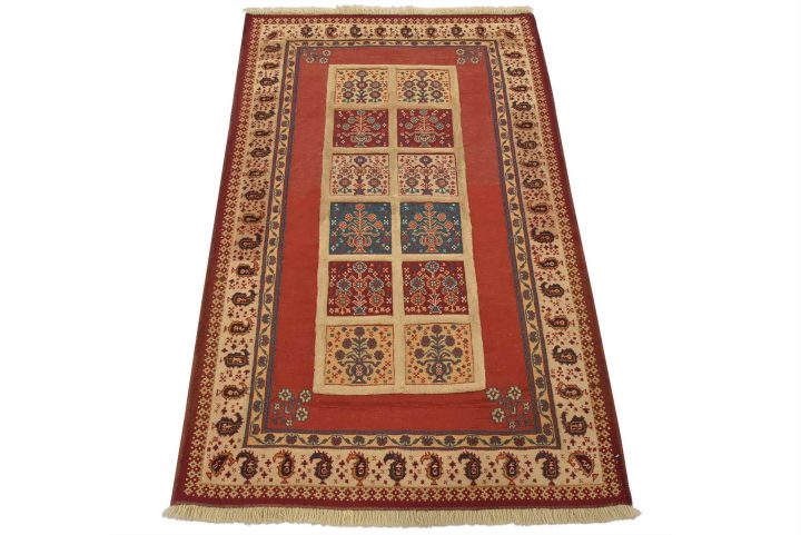 An authentic vintage tribal Gabbeh rug hand-knotted with fine wool and natural dyes. This finely woven rug features a panel design woven atop a flat-woven foundation, creating varying pile heights set against a red background. There are no worn areas; it is in very good condition.