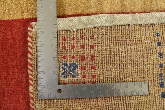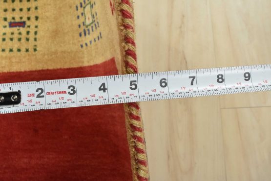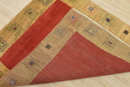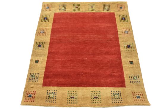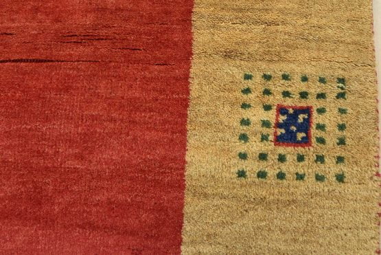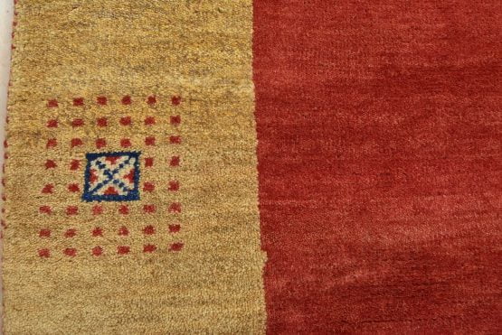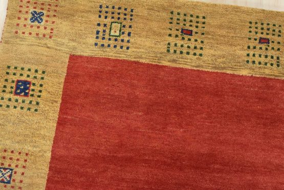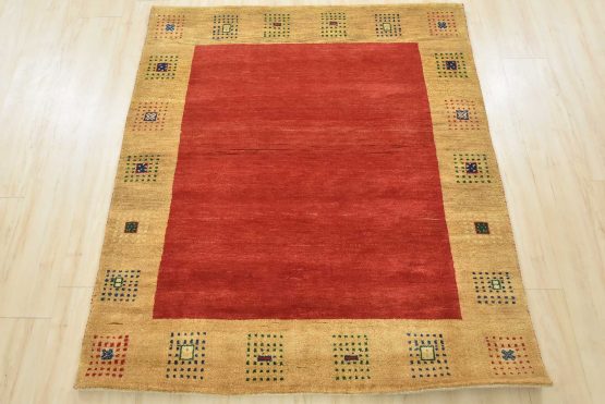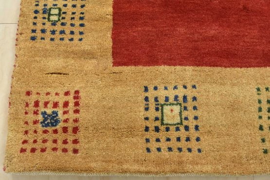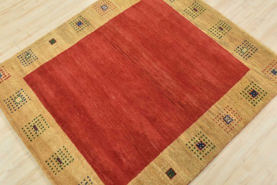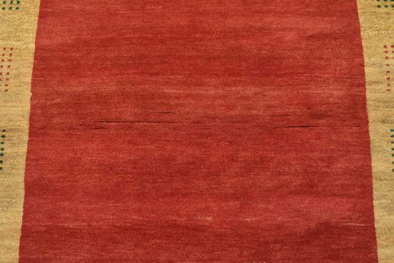 A contemporary Gabbeh rug hand-knotted with an all-wool pile on a cotton foundation. This finely woven oriental rug features a solid red background bordered by geometric motifs. It is new and in excellent condition.