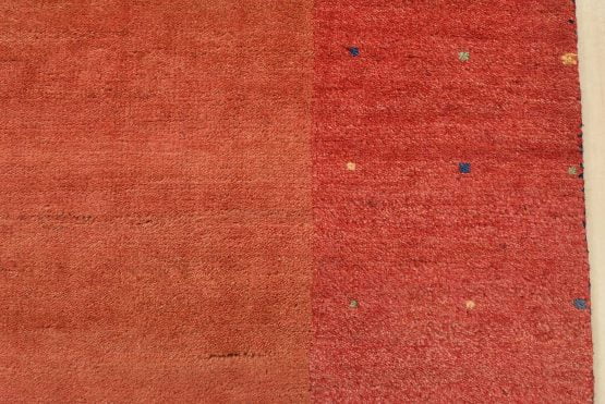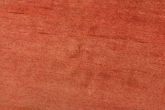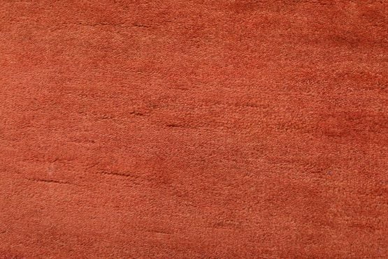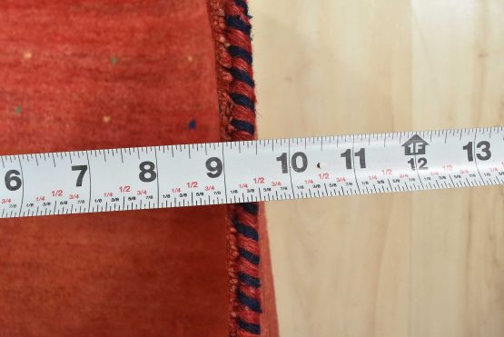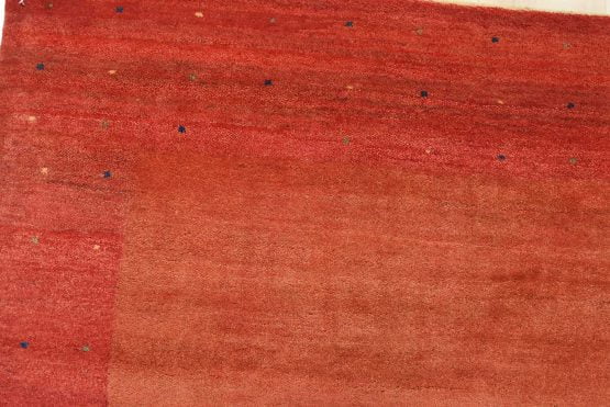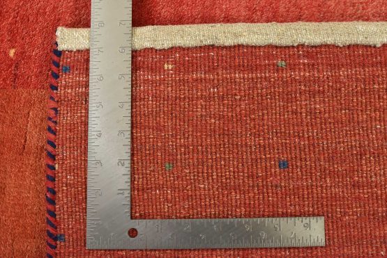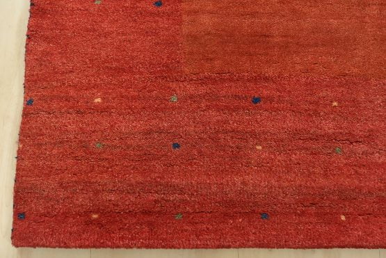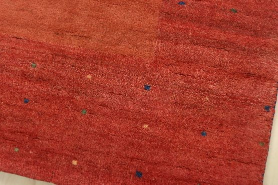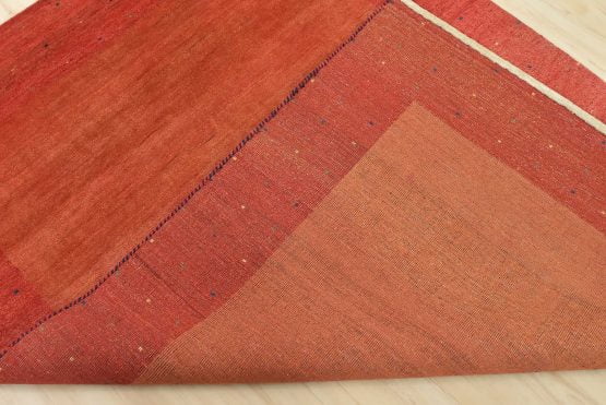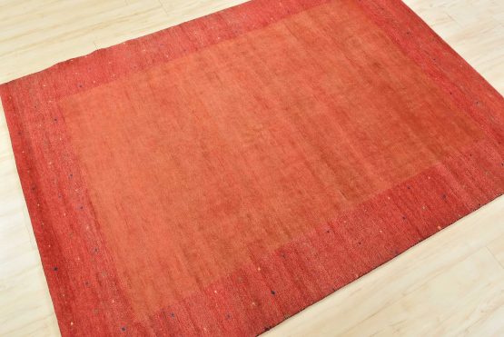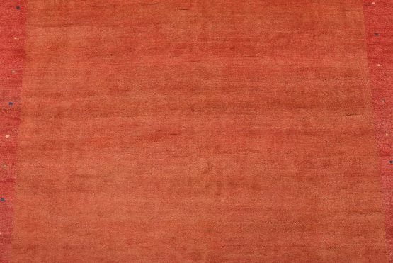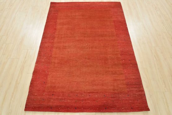 A contemporary Gabbeh rug hand-knotted with an all-wool pile on a cotton foundation. This finely woven area rug features a solid rust-colored background framed by a red border. It is new and in excellent condition.