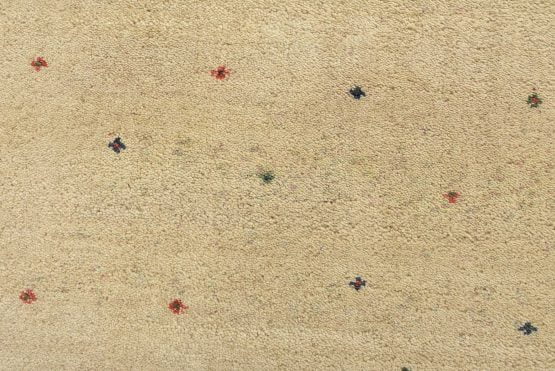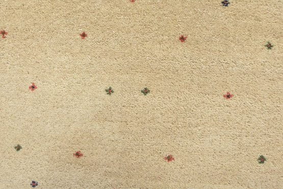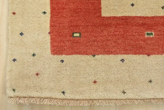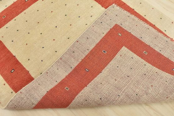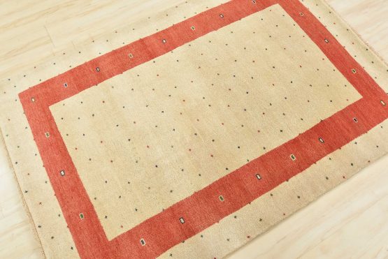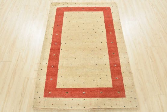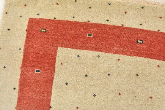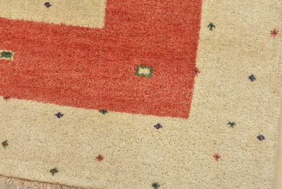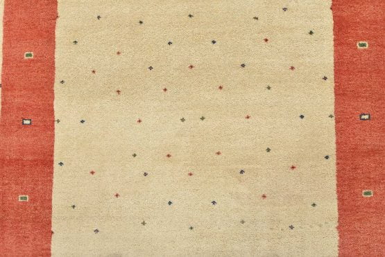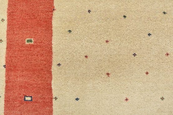 A contemporary Gabbeh rug hand-knotted with an all-wool pile on a cotton foundation. This finely woven area rug features a multicolored dotted pattern set against an ivory-colored background. It is new and in excellent condition.