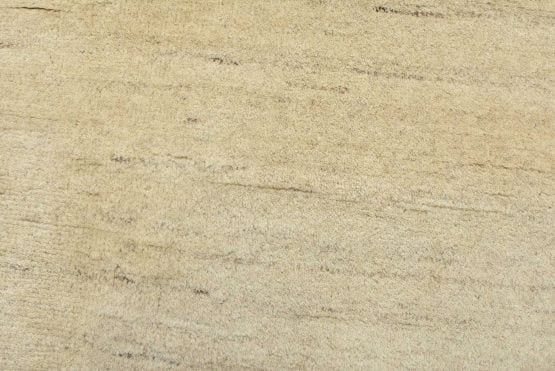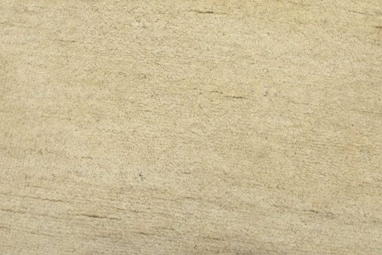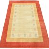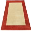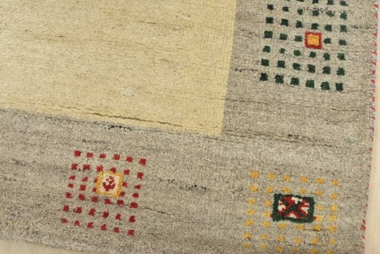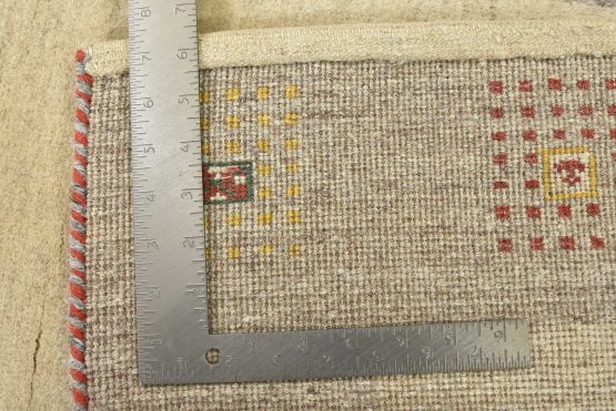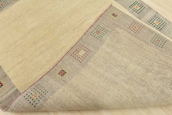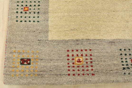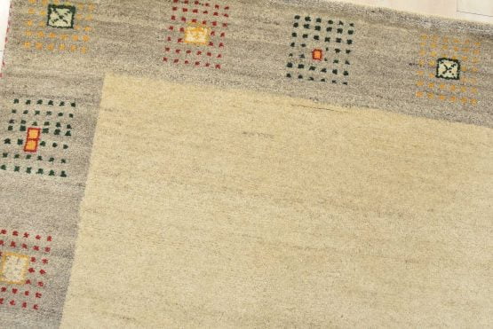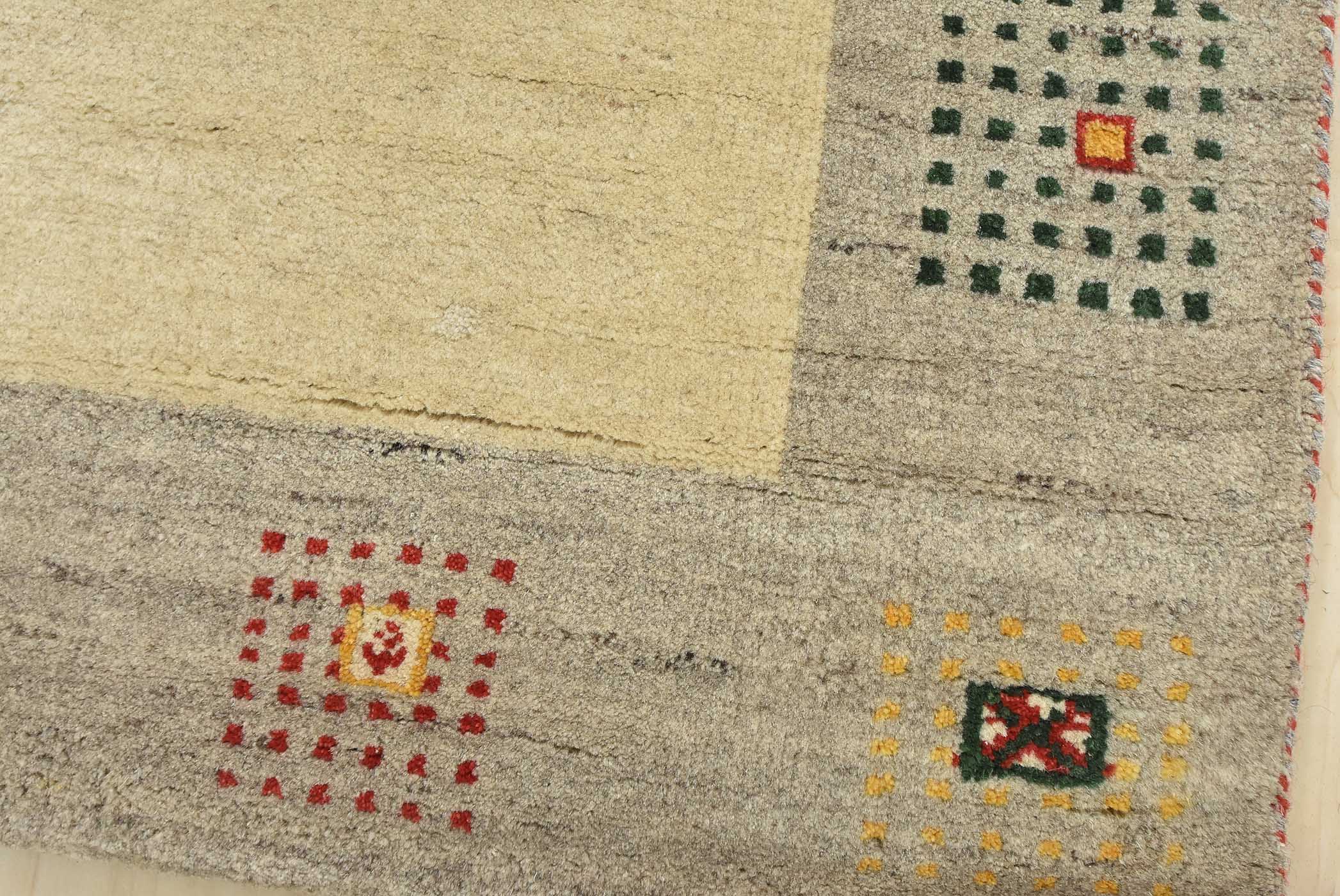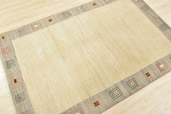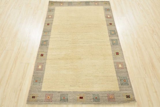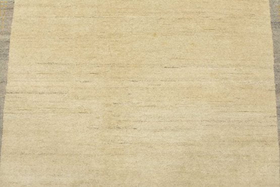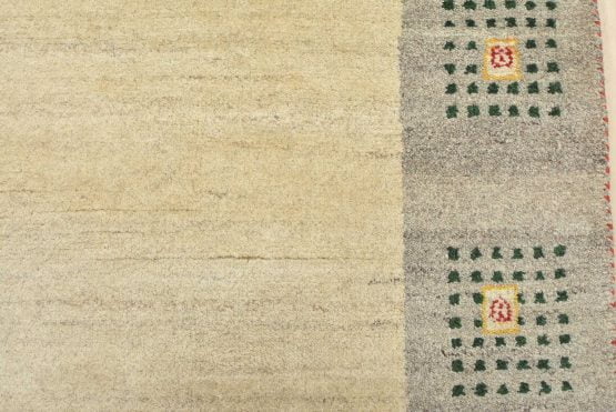 A contemporary Gabbeh rug hand-knotted with an all-wool pile on a cotton foundation. This finely woven area rug features a solid ivory-colored background bordered by geometric motifs. It is new and in excellent condition.