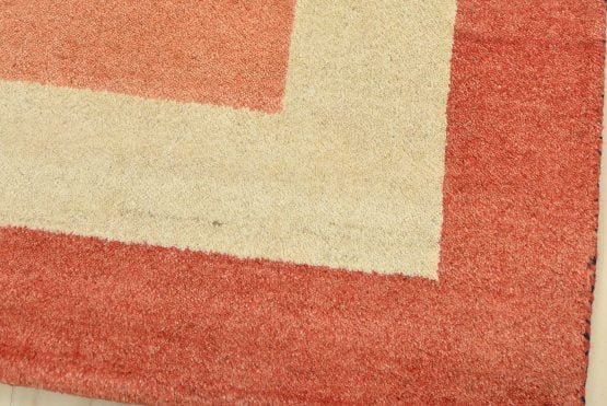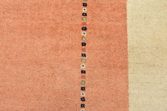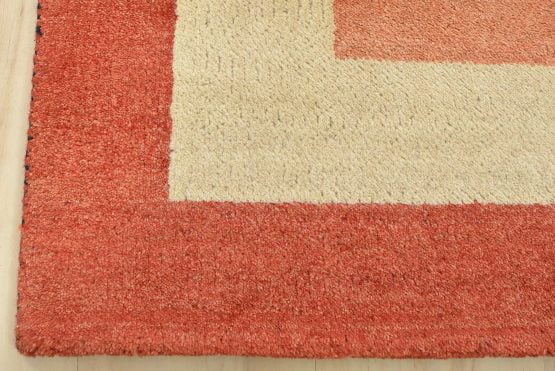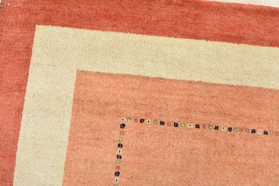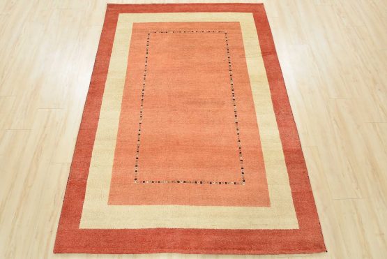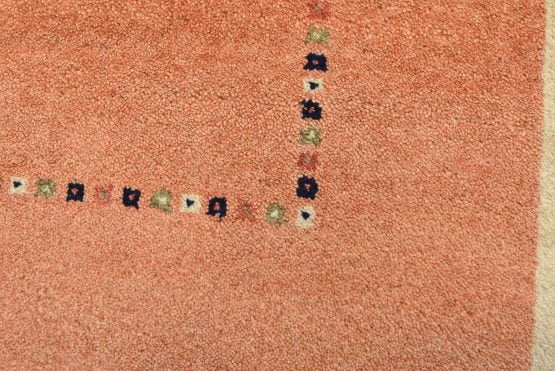 A contemporary Gabbeh rug hand-knotted with an all-wool pile on a cotton foundation. This finely woven area rug features a solid orange background bordered by a multicolored dotted line. It is new and in excellent condition.