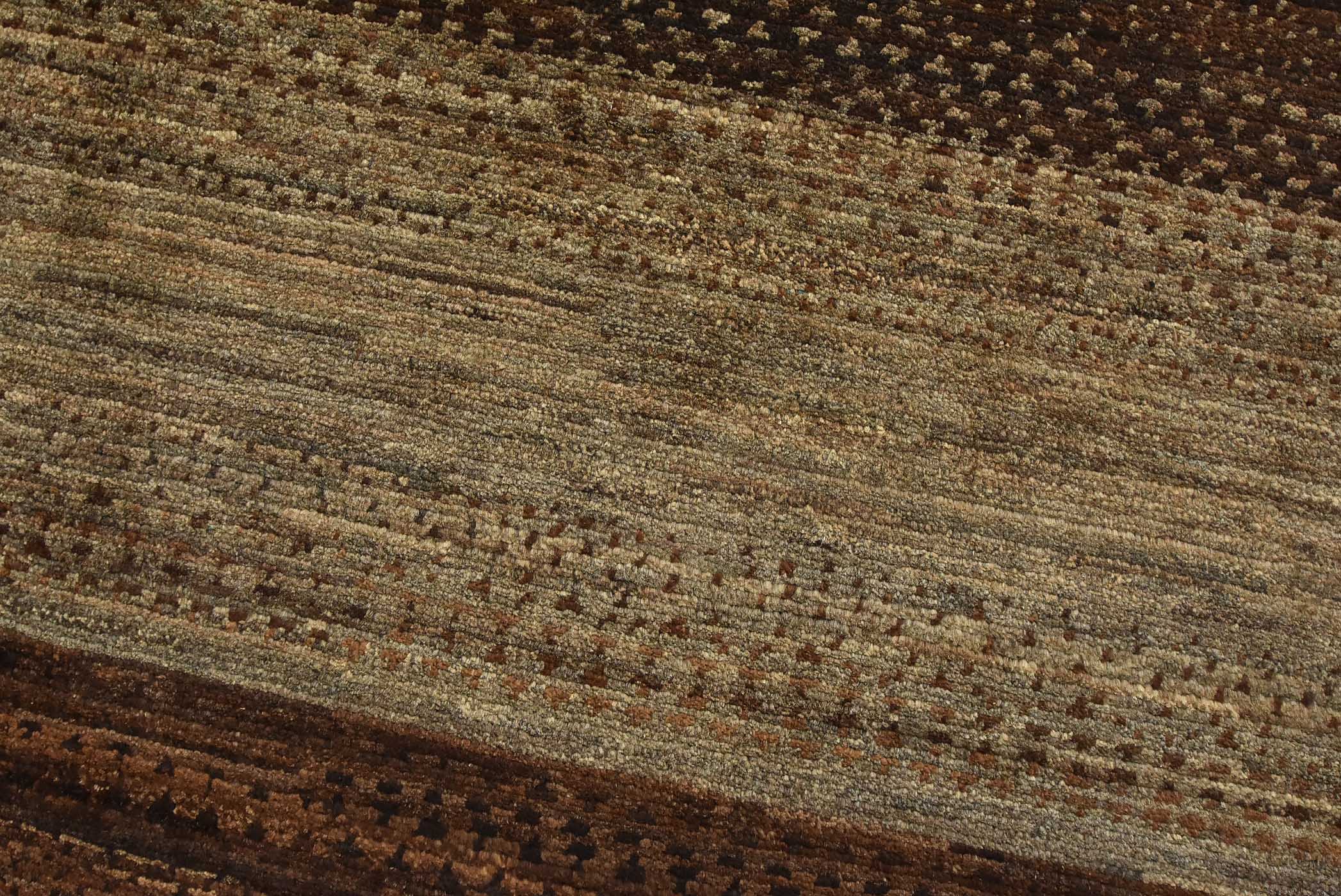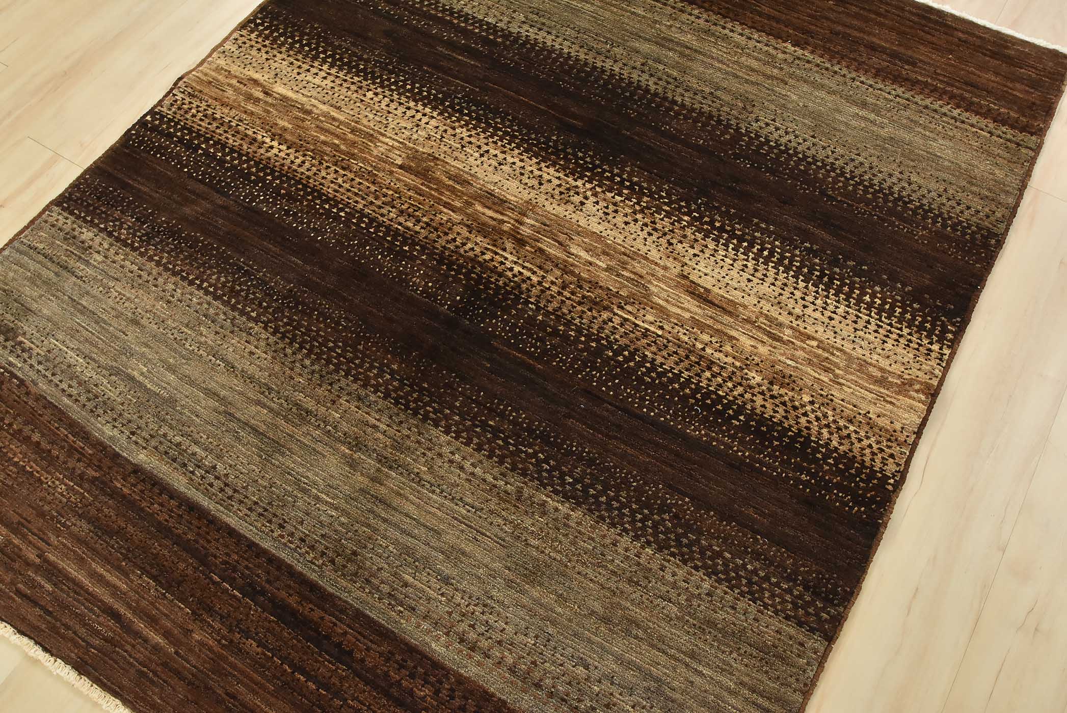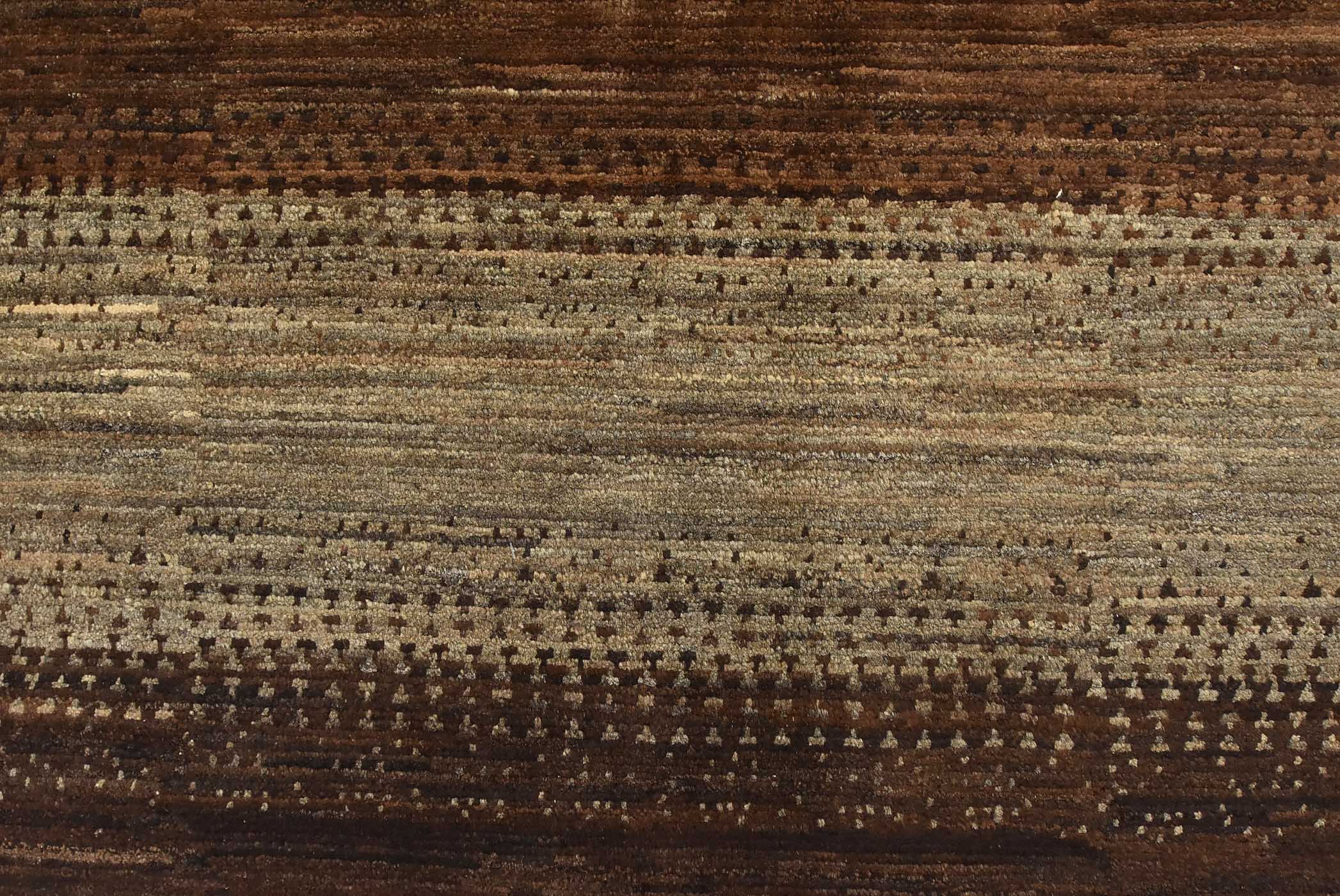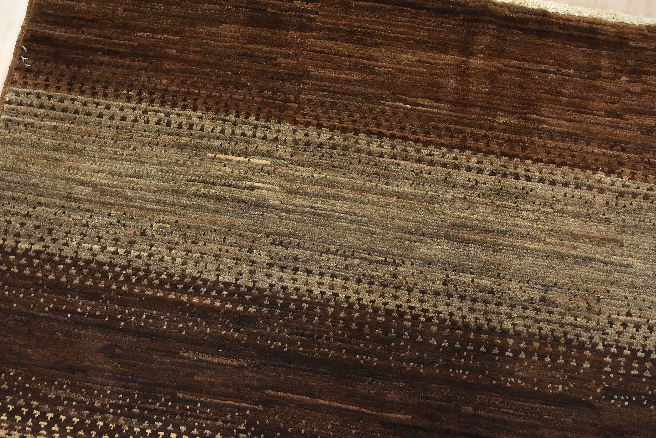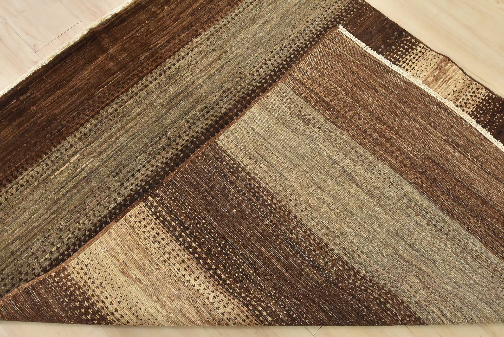 A contemporary Gabbeh rug hand-knotted with fine wool on a cotton foundation. This rug features large stripes in brown and gray. It is new and in excellent condition.