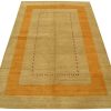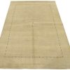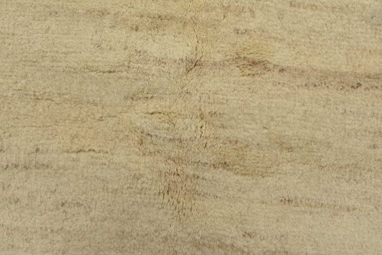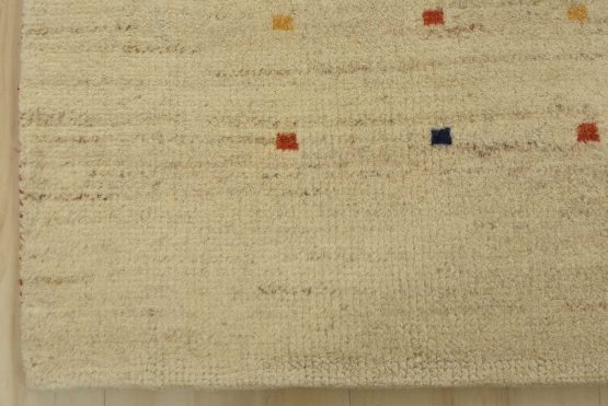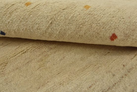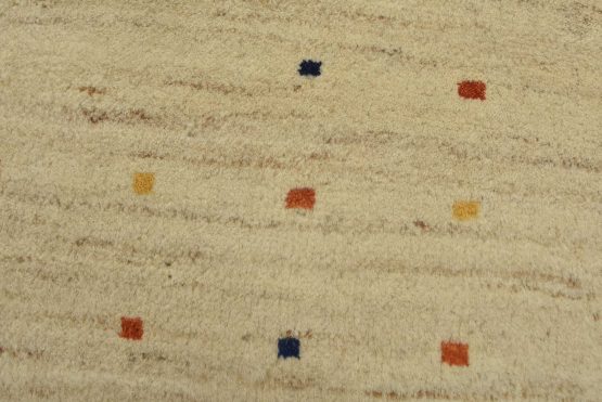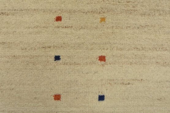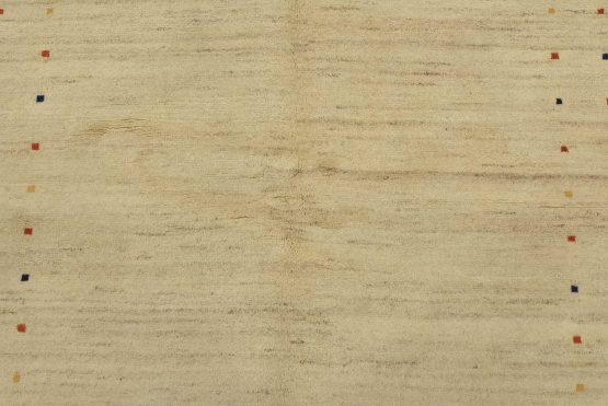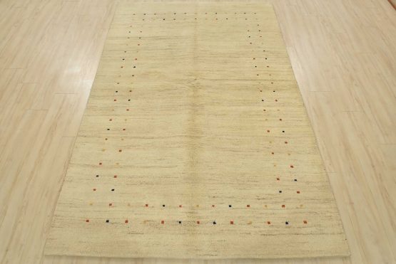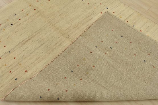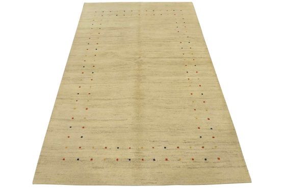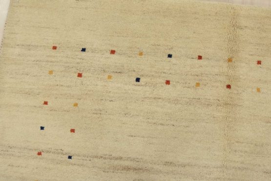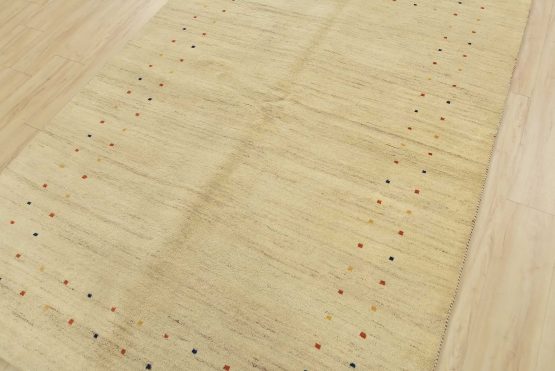 A contemporary Gabbeh rug hand-knotted with an all-wool pile on a cotton foundation. This area rug features a solid beige background framed by a dotted pattern. It is new and in excellent condition.