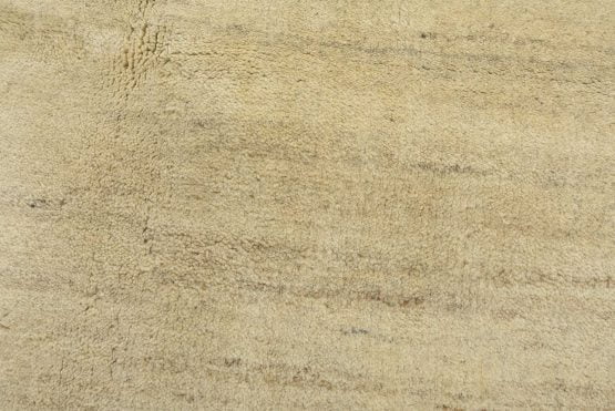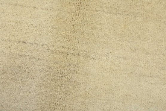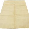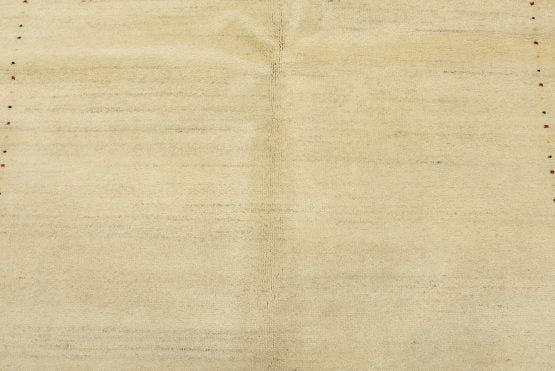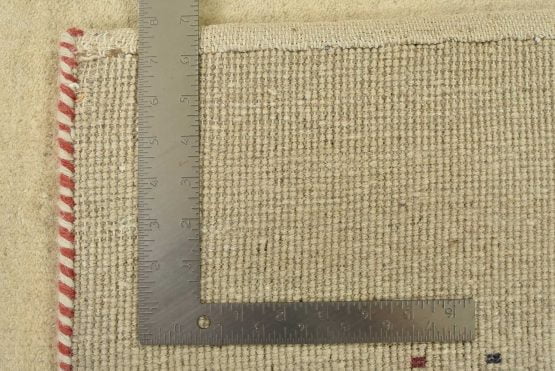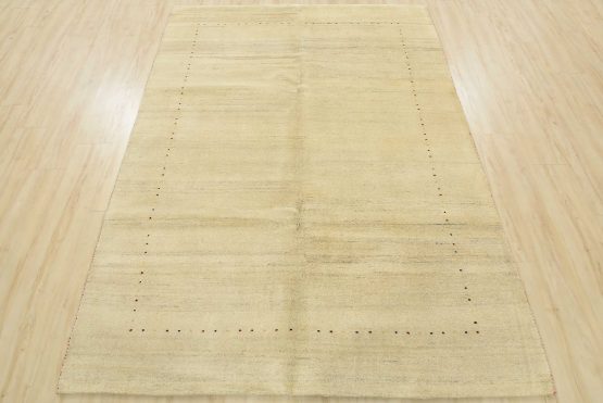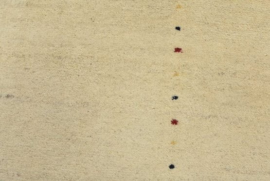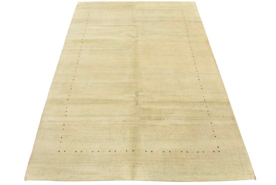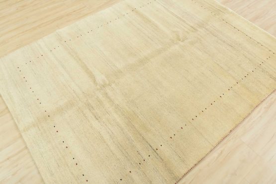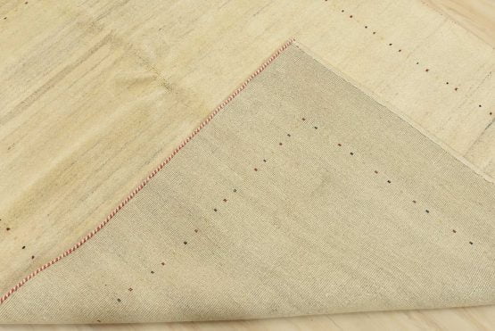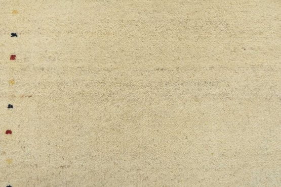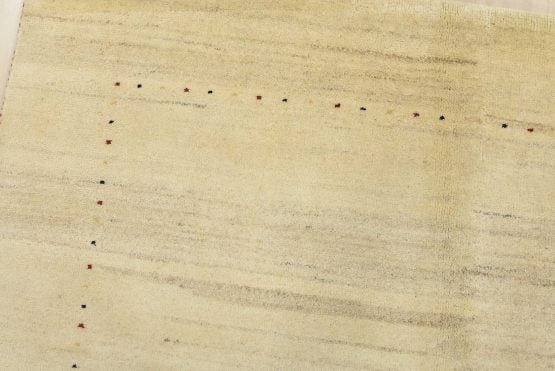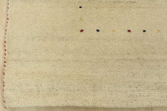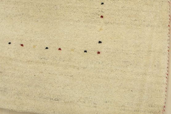 A contemporary Gabbeh rug hand-knotted with an all-wool pile on a cotton foundation. This finely woven oriental rug features a solid ivory-colored background bordered by a multicolored dotted line. It is new and in excellent condition.