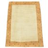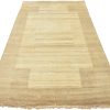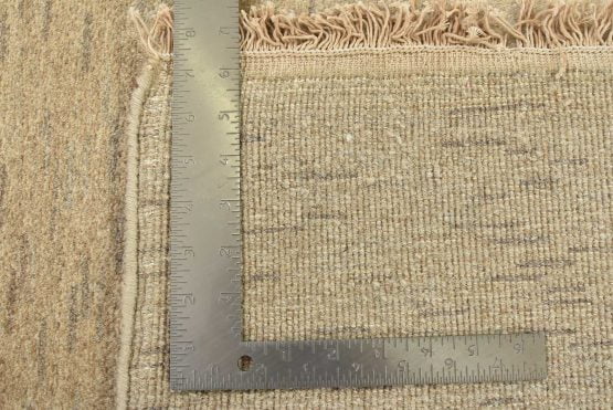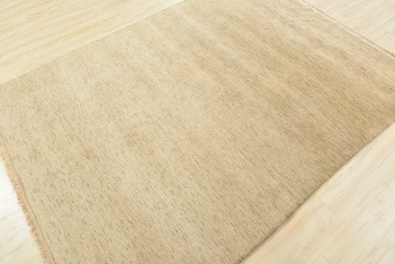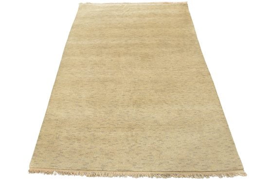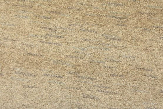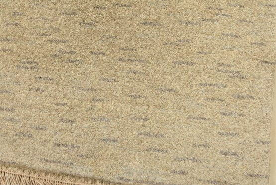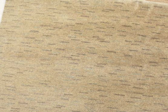 A contemporary Gabbeh rug hand-knotted with an all-wool pile on a cotton foundation. This finely woven area rug features small gray lines scattered across a beige background. It is new and in excellent condition.