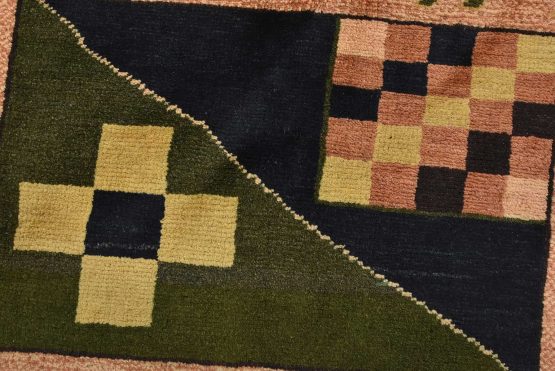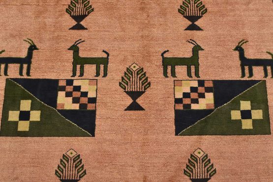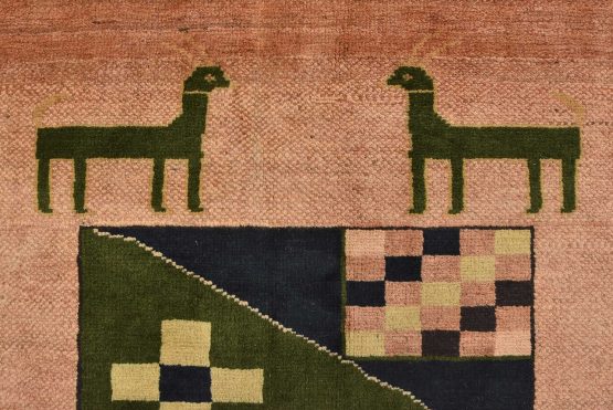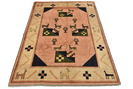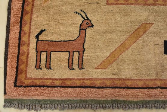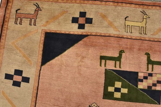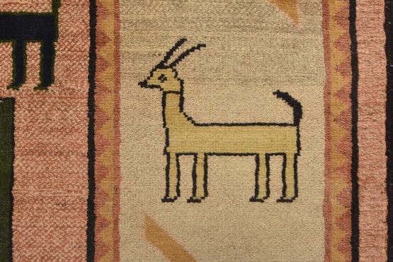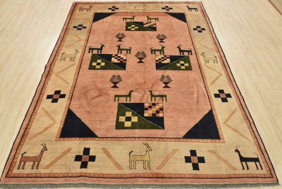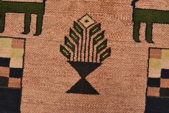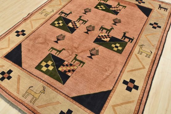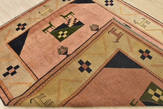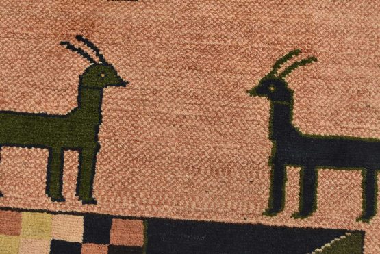 A tribal geometric Gabbeh rug hand-knotted with an all-wool pile on a wool foundation. This nomadic oriental rug features an all-over design of geometric motifs and animal figures set against a pink background. It is new and in excellent condition.