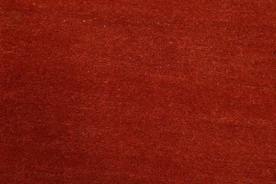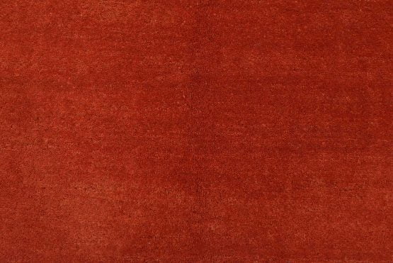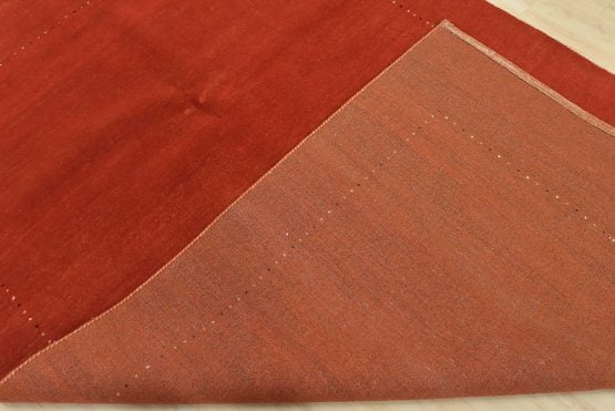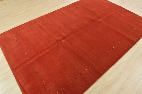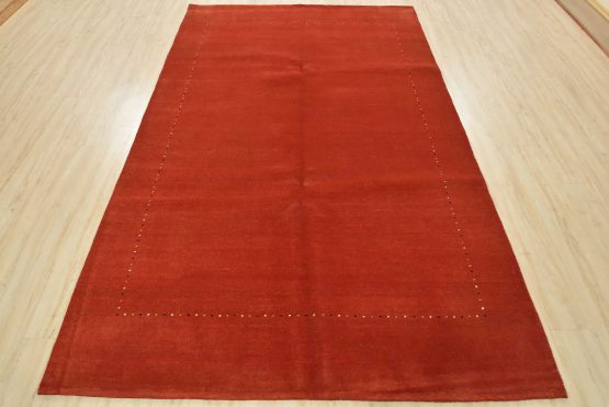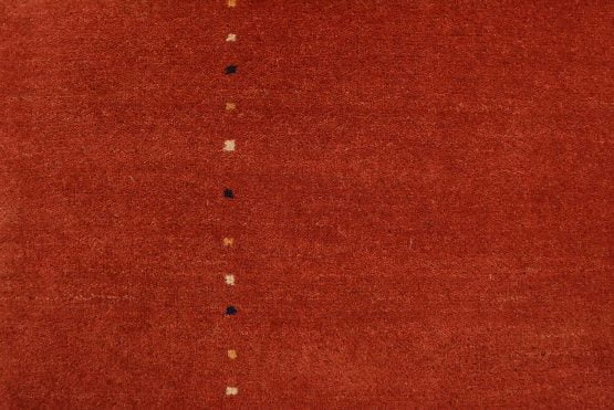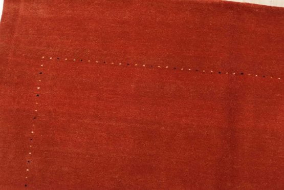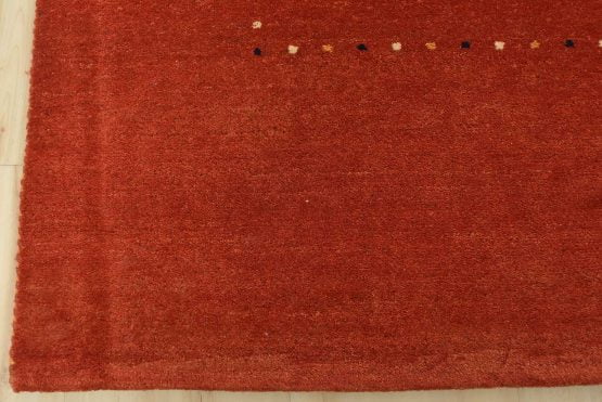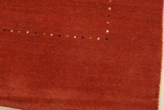 A contemporary Gabbeh rug hand-knotted with an all-wool pile on a cotton foundation. This finely woven oriental rug features a solid red background bordered by a multicolored dotted line. It is new and in excellent condition.