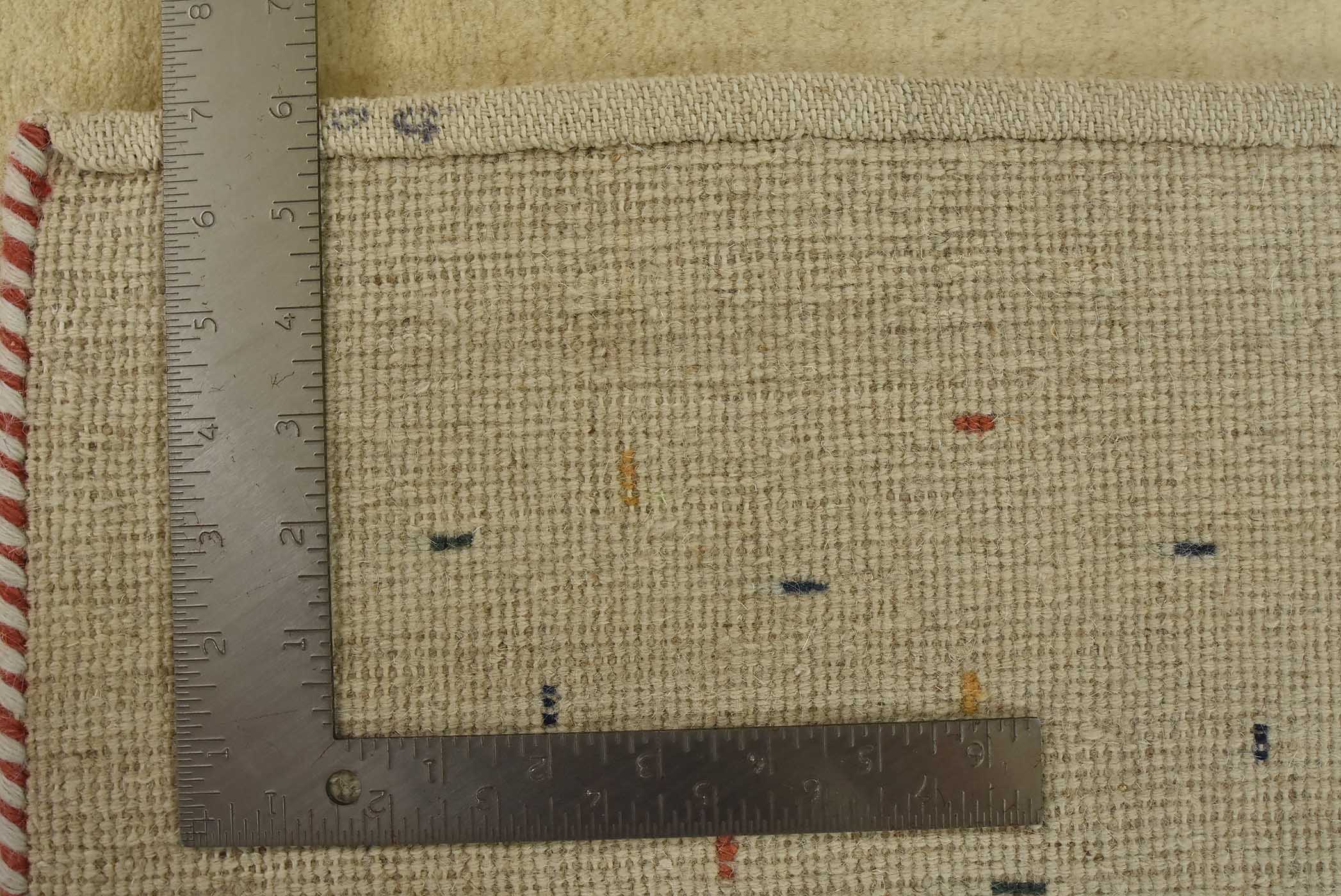 A contemporary Gabbeh rug hand-knotted with an all-wool pile on a cotton foundation. This area rug features a solid ivory background with a sprinkled pattern woven into the border. It is new and in excellent condition.