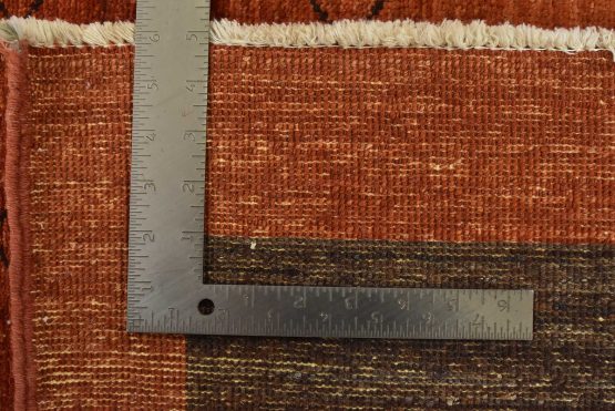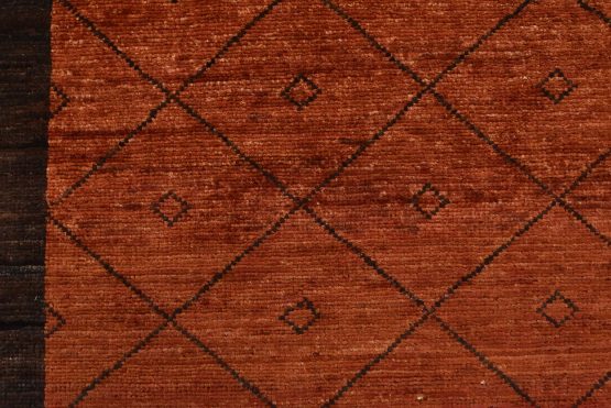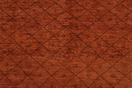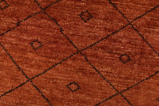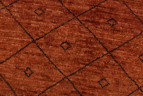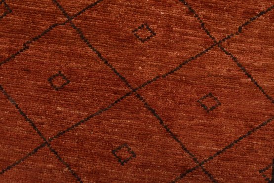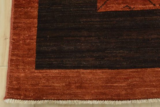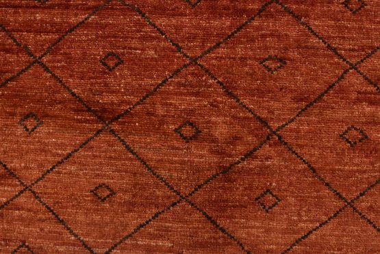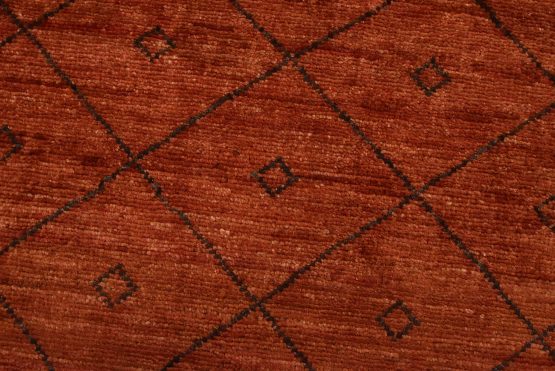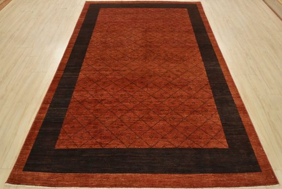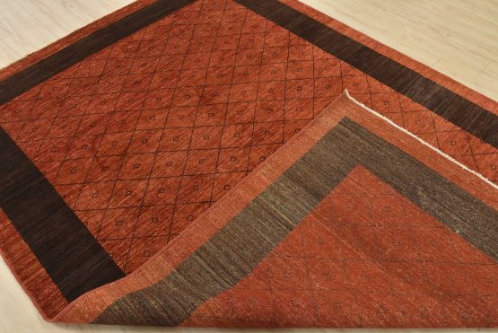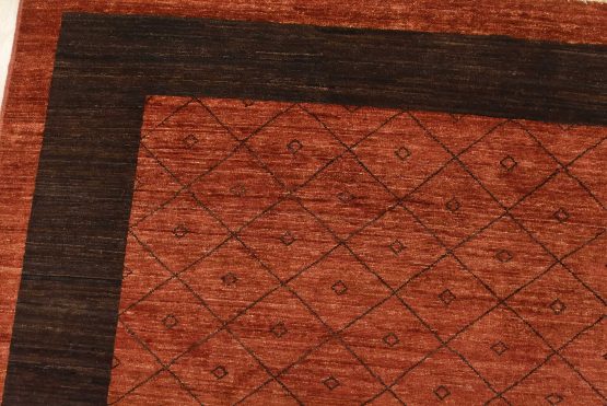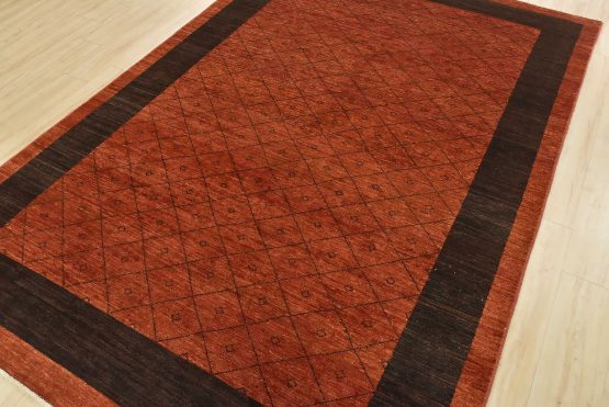 A contemporary Gabbeh rug hand-knotted with an all-wool pile on a cotton foundation. This oriental rug features a diamond-shaped geometric pattern set against a red background. It is new and in excellent condition.