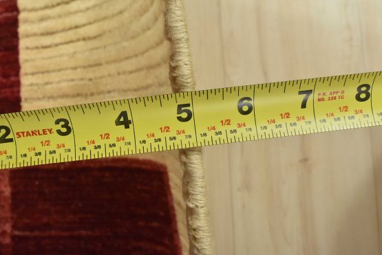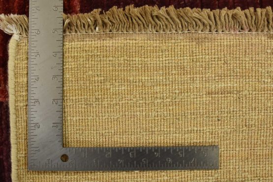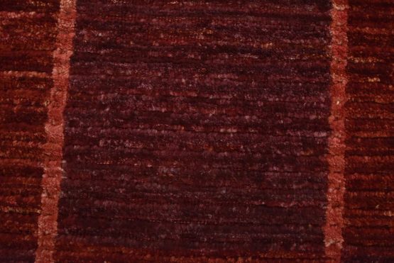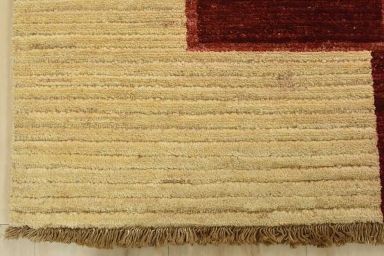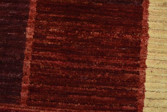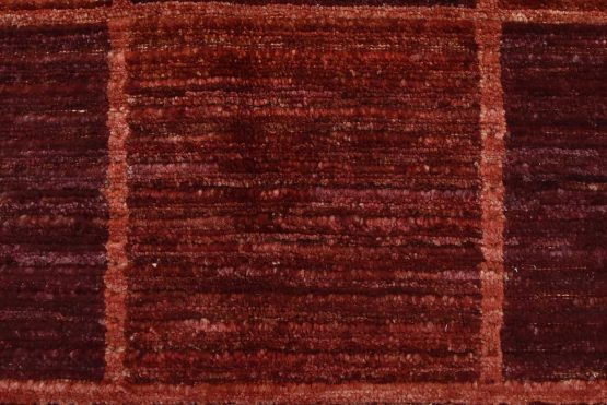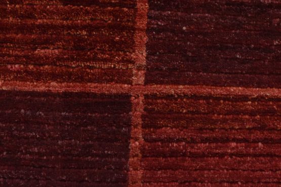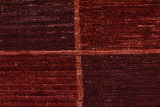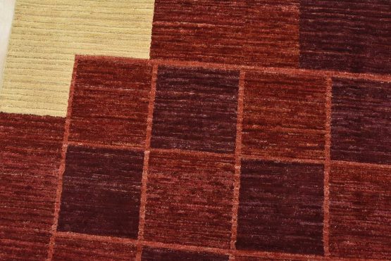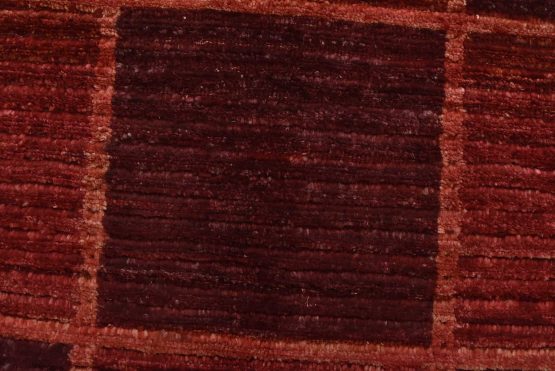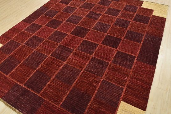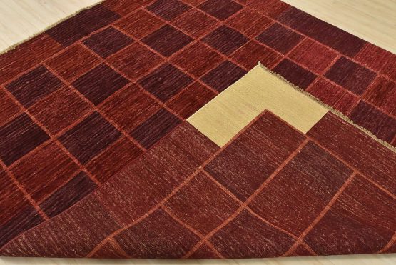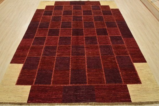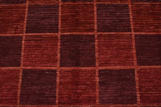 A contemporary Gabbeh rug hand-knotted with an all-wool pile on a cotton foundation. This area rug features a high and low wool pile with an all-over geometric checkered pattern set against a red background. It is new and in excellent condition.