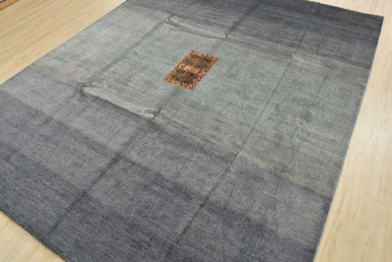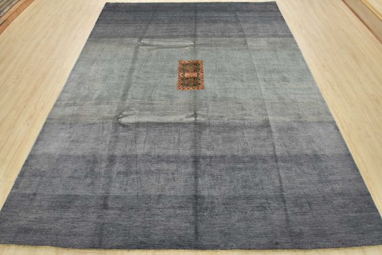 A contemporary Gabbeh rug hand-knotted with an all-wool pile on a cotton foundation. This finely woven oriental rug features a small rectangular medallion adorned with geometric patterns set against an ombré-style blue background. It is new and in excellent condition.