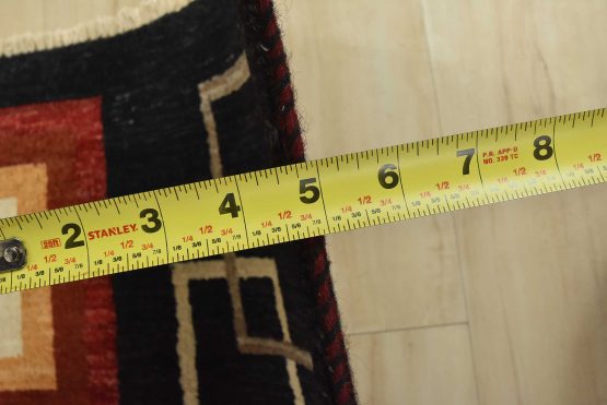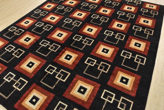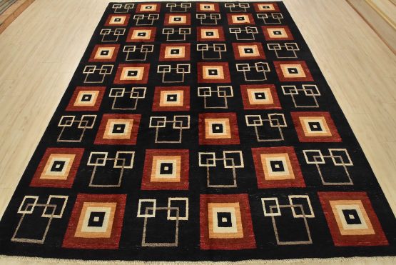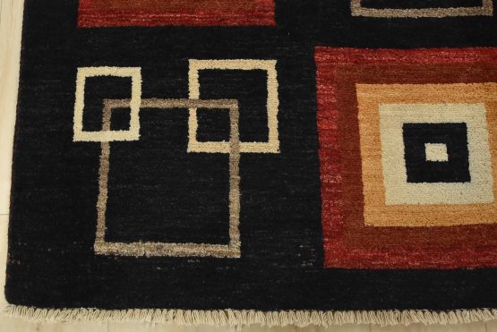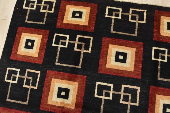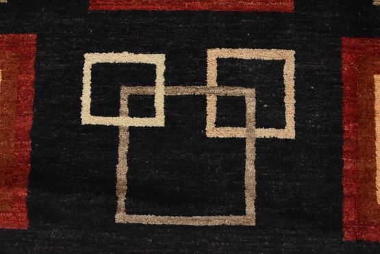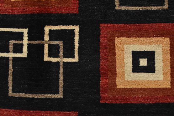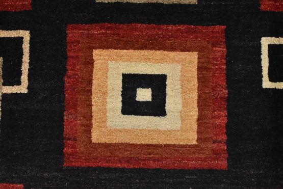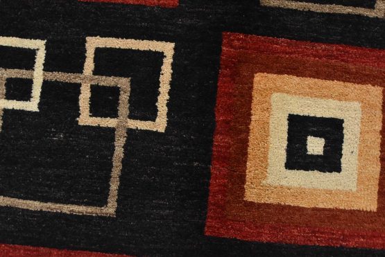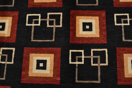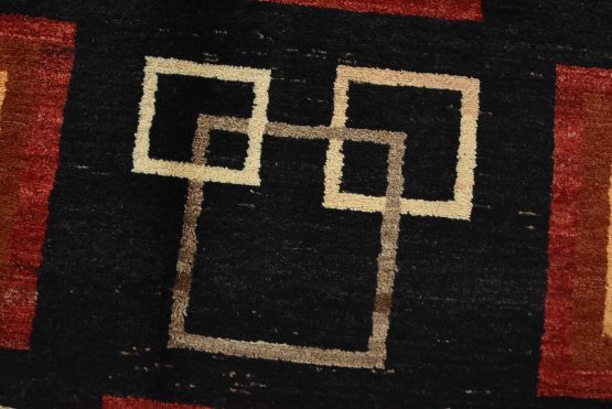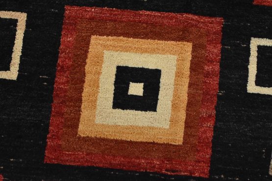 A contemporary Gabbeh rug hand-knotted with an all-wool pile on a cotton foundation. This oriental rug features a pattern of geometric squares set against a black background. It is new and in excellent condition.
