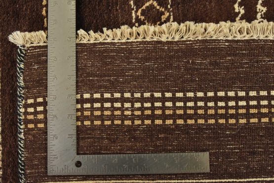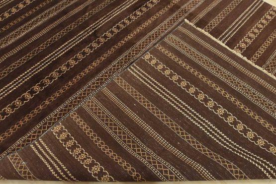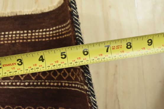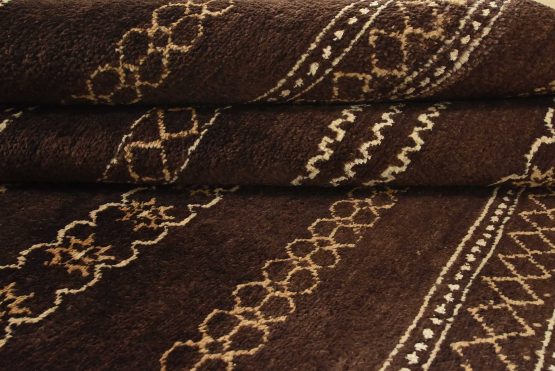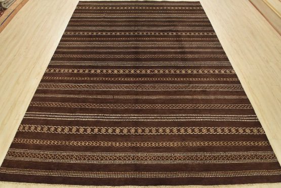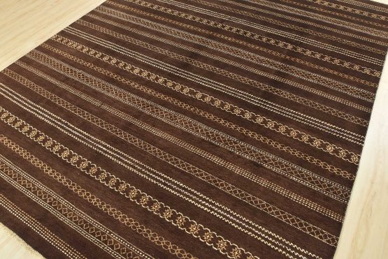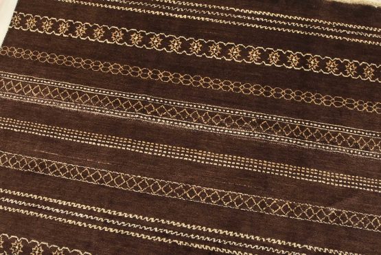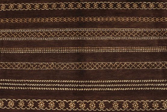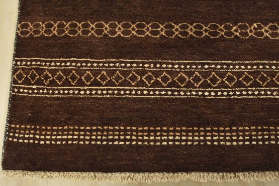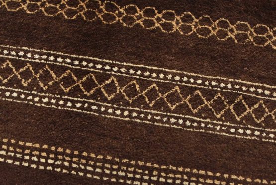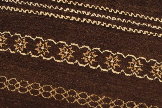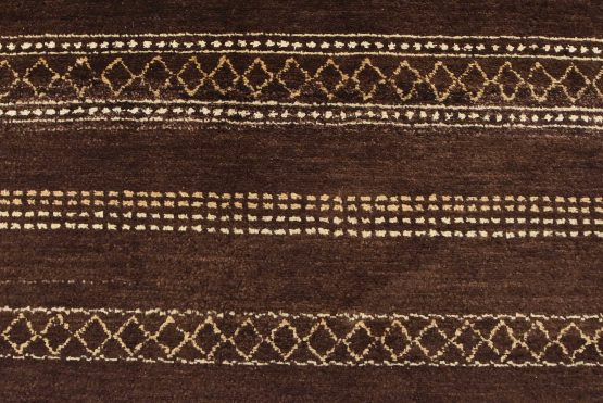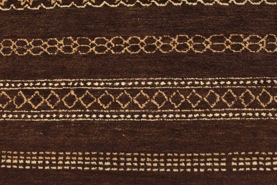 A contemporary geometric Gabbeh rug hand-knotted with an all-wool pile on a cotton foundation. This oriental rug features horizontal geometric patterns set against a brown background. It is new and in excellent condition.