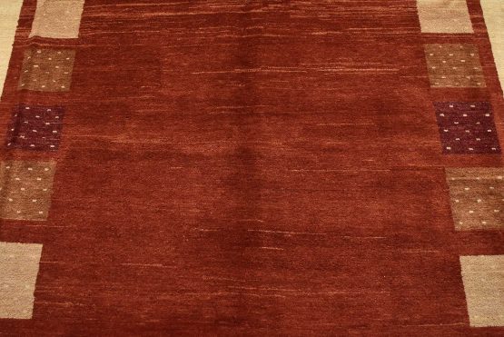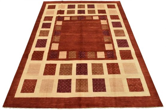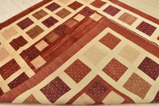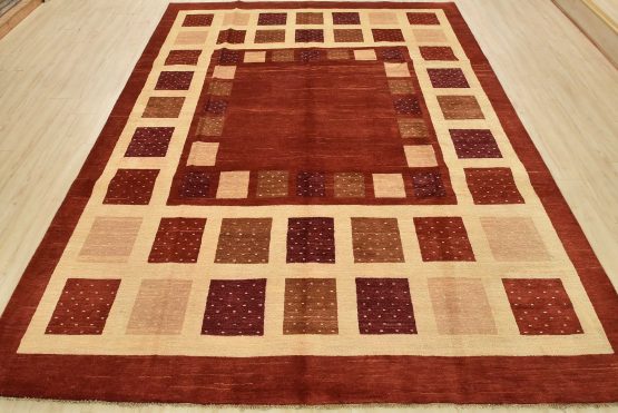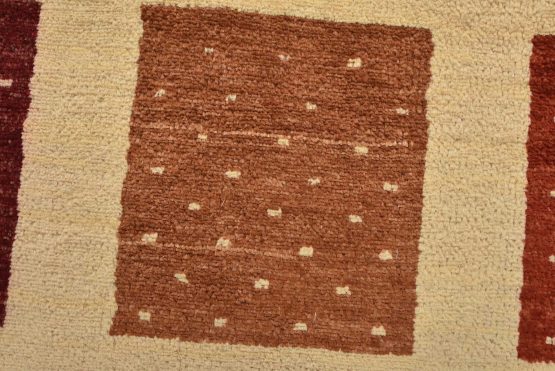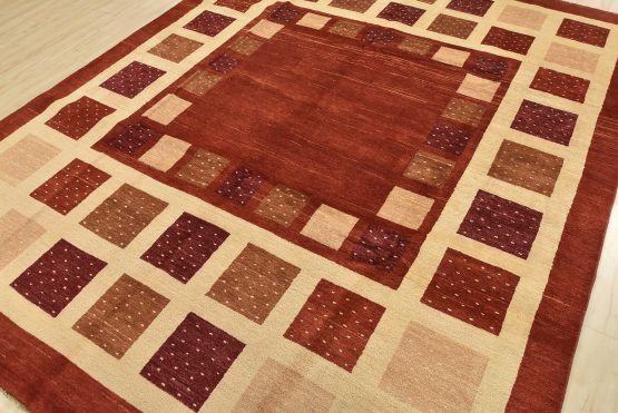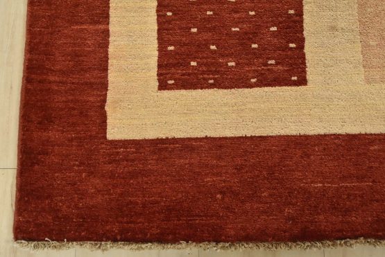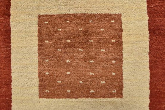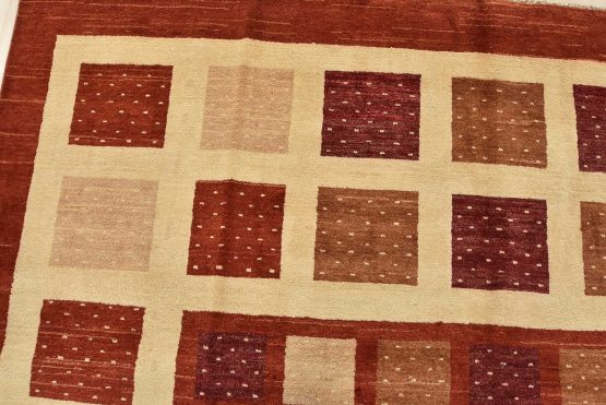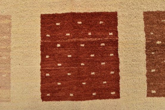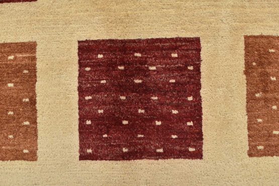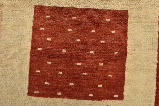 A contemporary Gabbeh rug hand-knotted with an all-wool pile on a cotton foundation. This finely woven oriental rug features a central geometric medallion surrounded by a square-shaped pattern set against a beige background. It is new and in excellent condition.