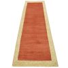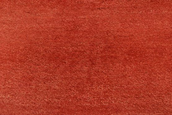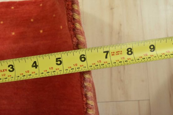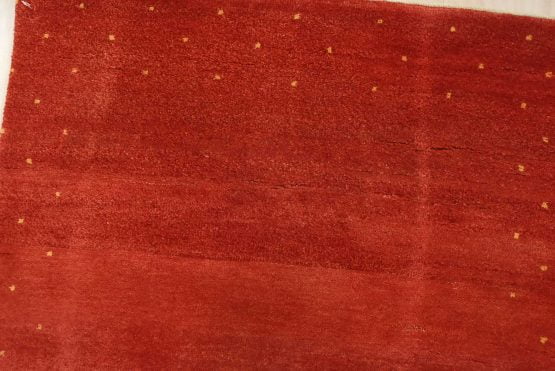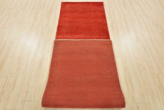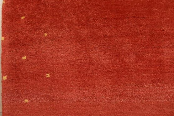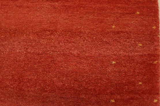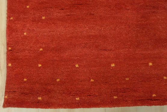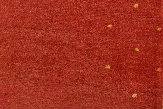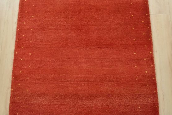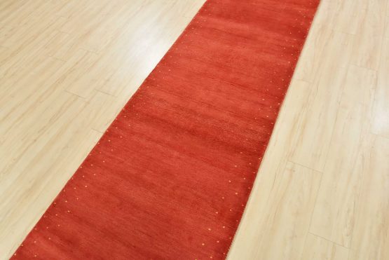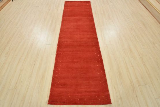 A contemporary Gabbeh runner hand-knotted with an all-wool pile on a cotton foundation. This oriental rug features a solid red background with a pattern of gold dots embedded in the border. It is new and in excellent condition.