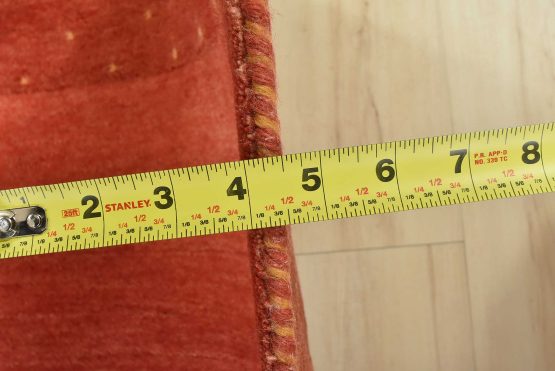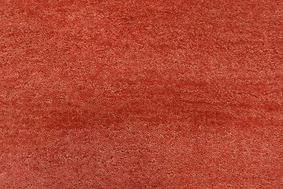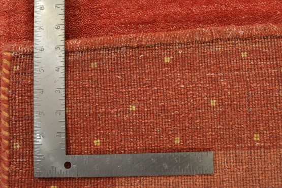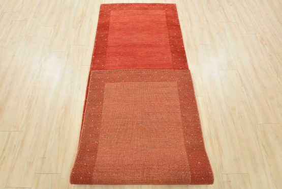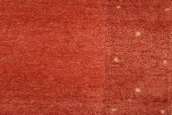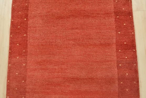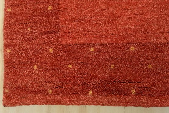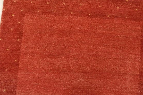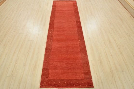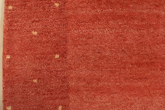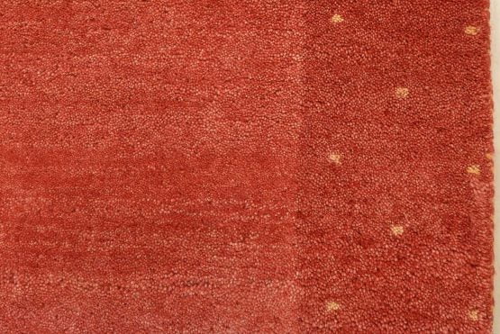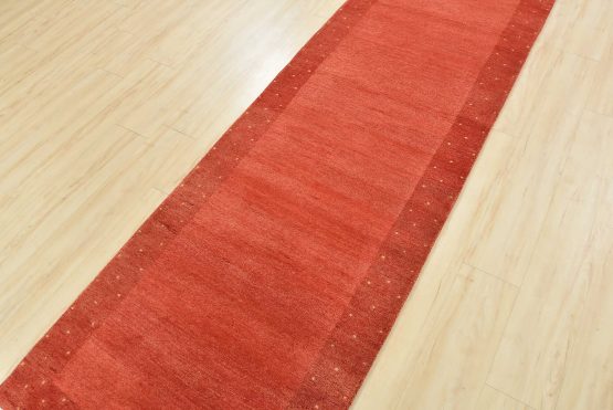 A contemporary Gabbeh runner hand-knotted with an all-wool pile on a cotton foundation. This finely woven oriental rug features a solid red background bordered by a gold dotted pattern. It is new and in excellent condition.