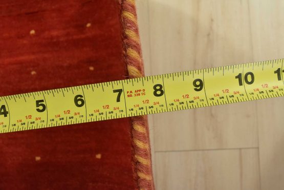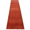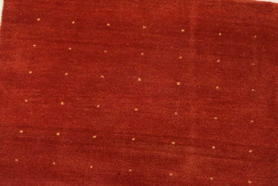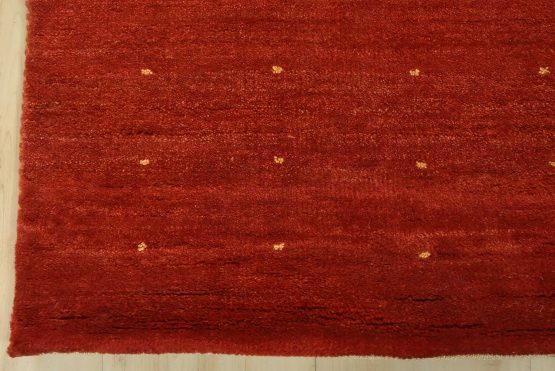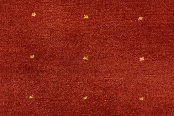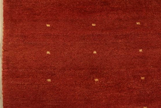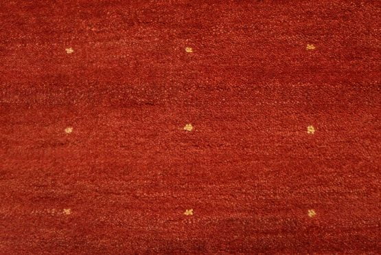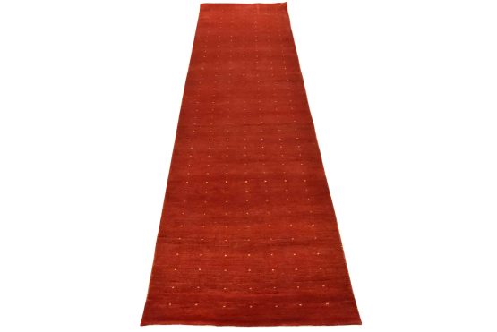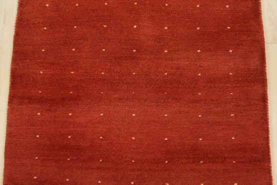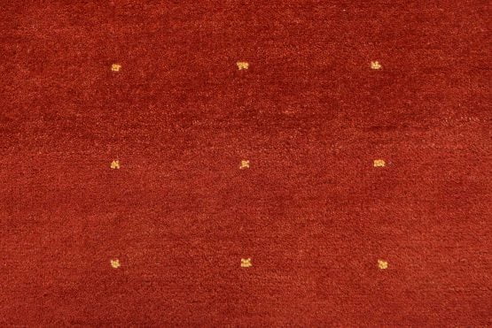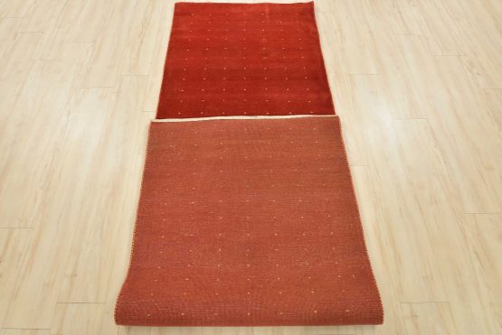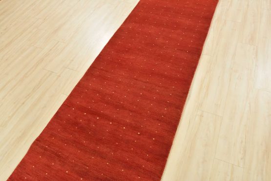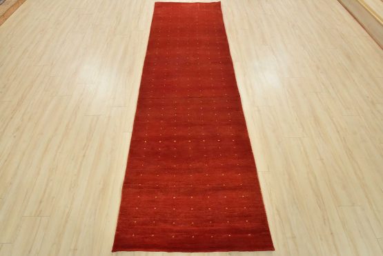 A contemporary Gabbeh runner hand-knotted with an all-wool pile on a cotton foundation. This oriental rug features an all-over repeating gold dot pattern set against a red background. It is new and in excellent condition.