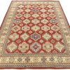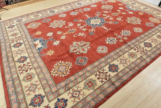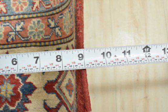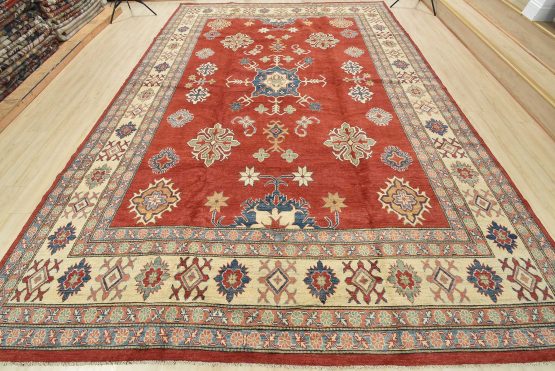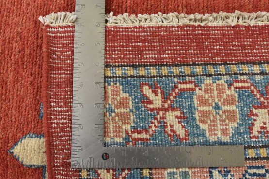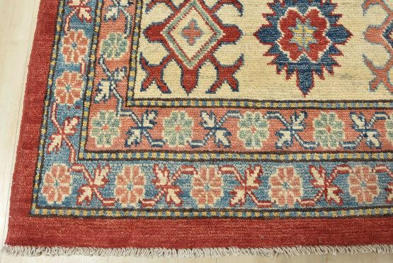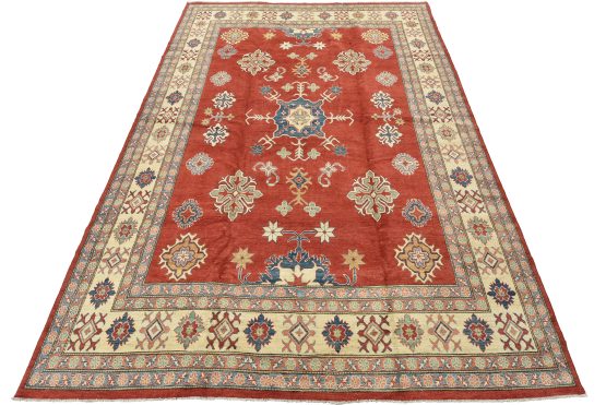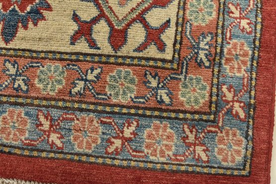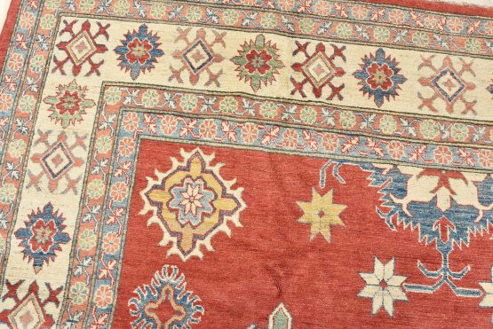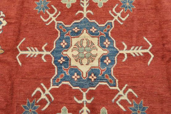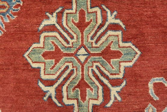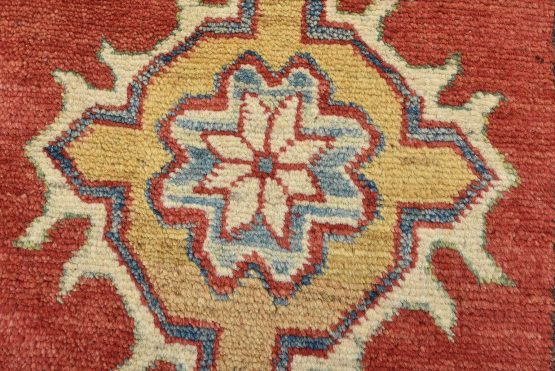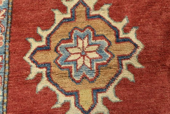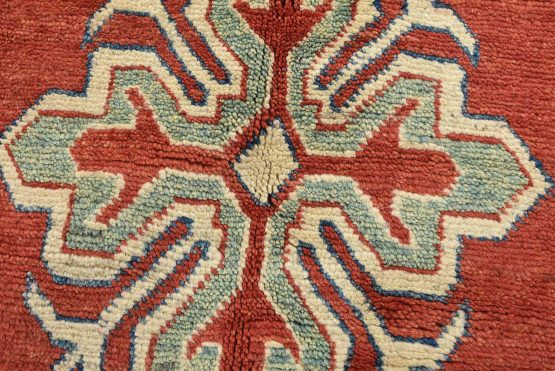 A traditional tribal Caucasian Kazak rug hand-knotted with an all-wool pile on a cotton foundation. This oriental rug features a central geometric medallion surrounded by geometric motifs set against a red background. It is new and in excellent condition.